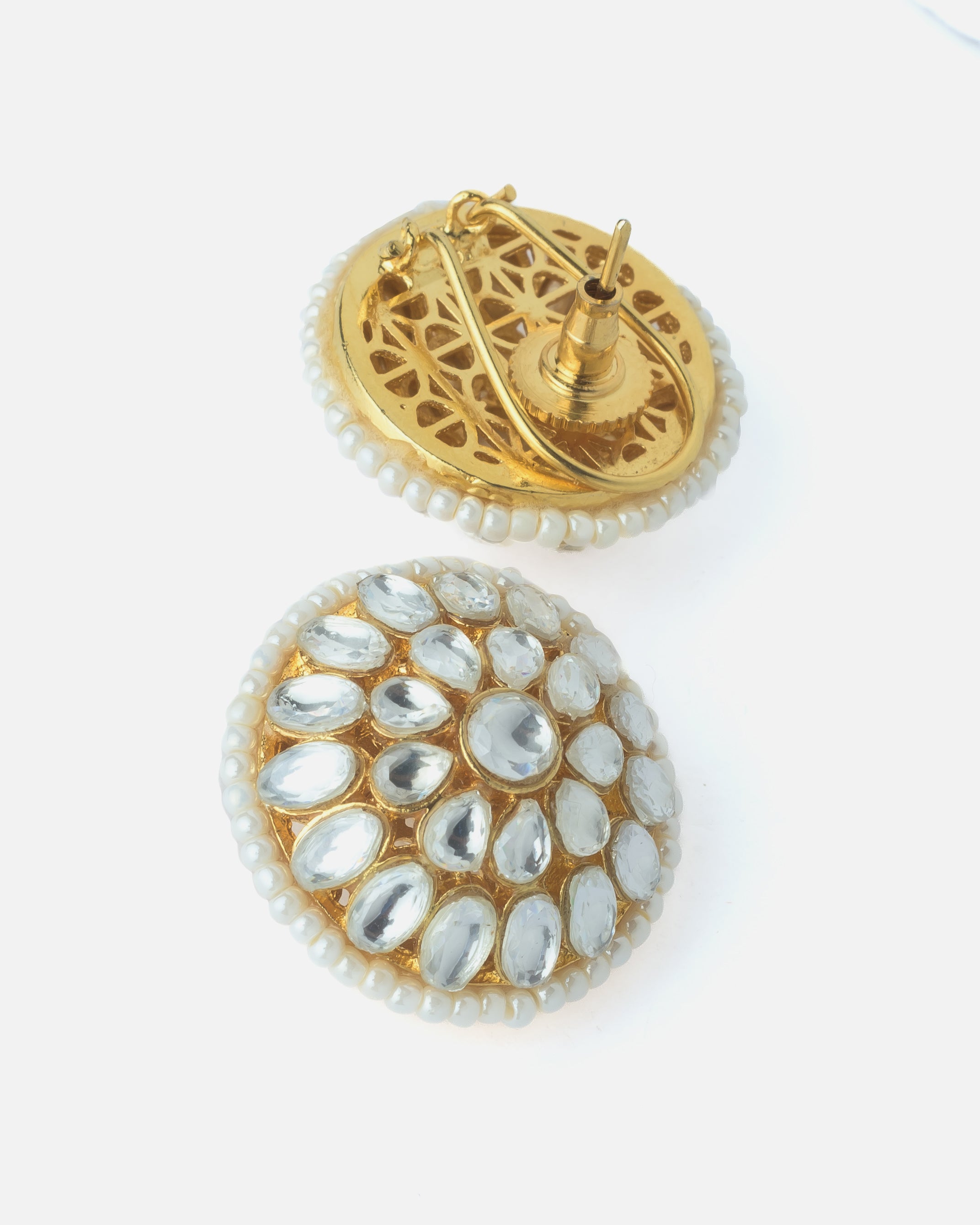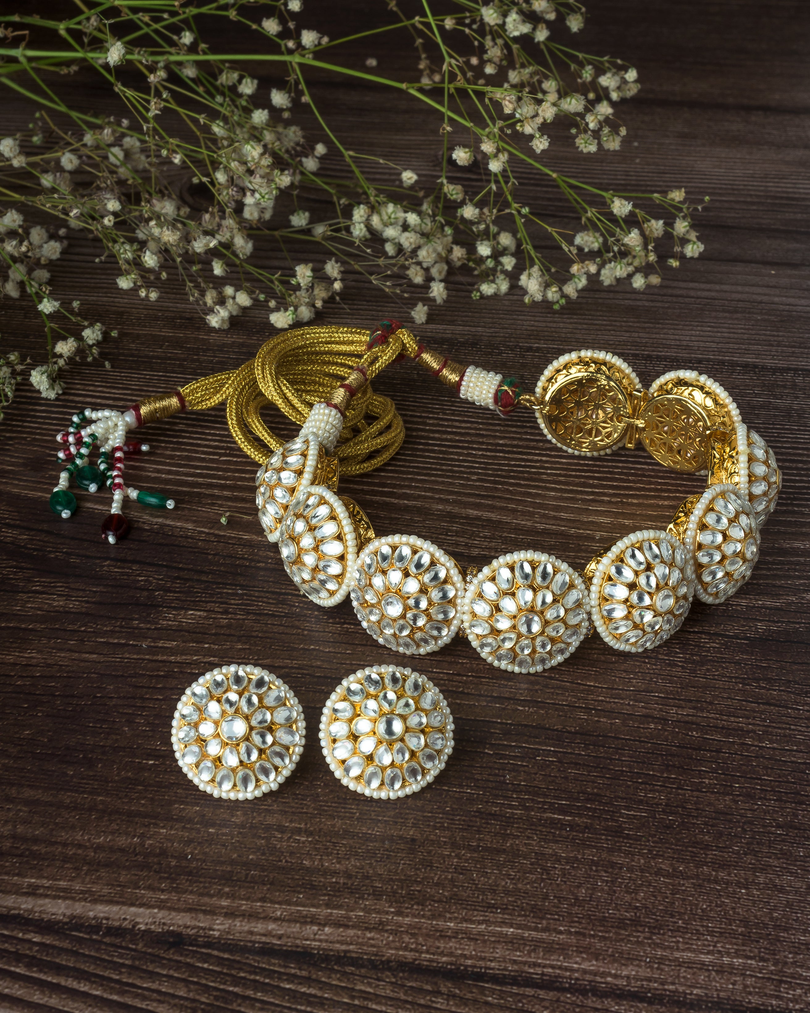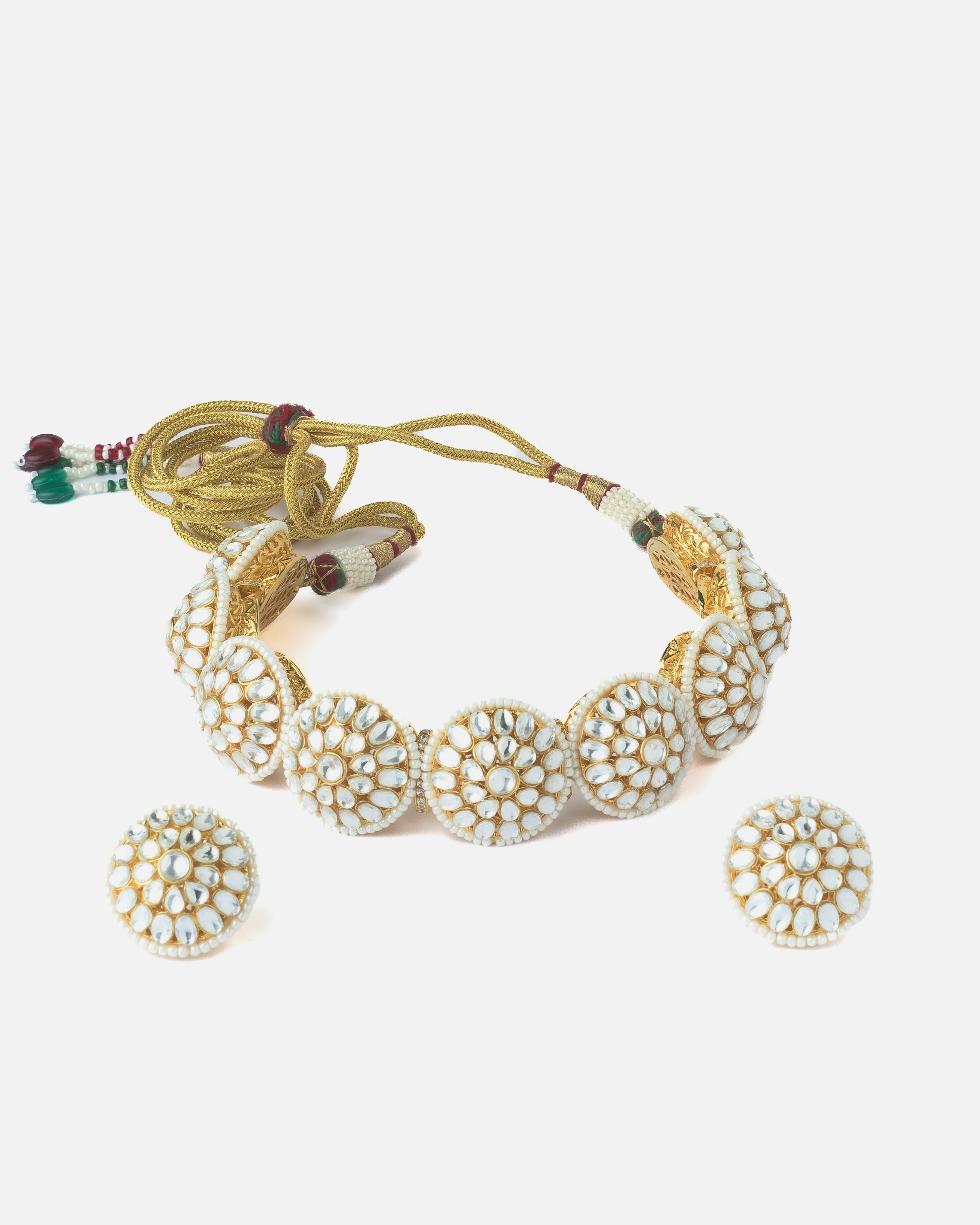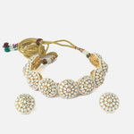 - Traditional Kundan Jewelry Set: Features a classic choker necklace with matching round stud earrings, crafted in an intricate Kundan design.