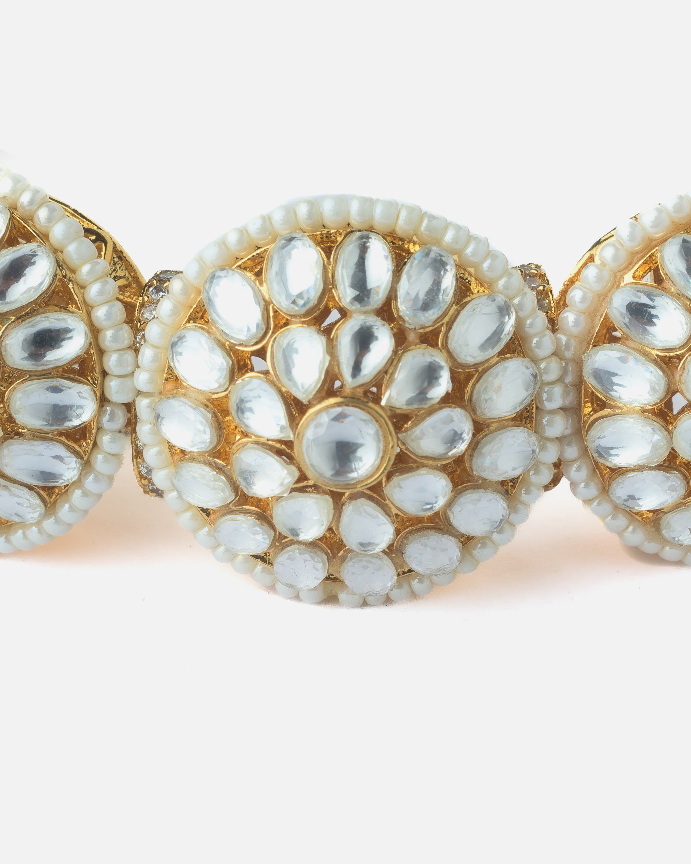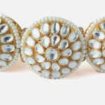 Stunning gold-tone choker necklace set with round kundan-studded discs and pearl borders. Paired with matching stud earrings, it’s perfect for weddings, festivals, and traditional occasions.