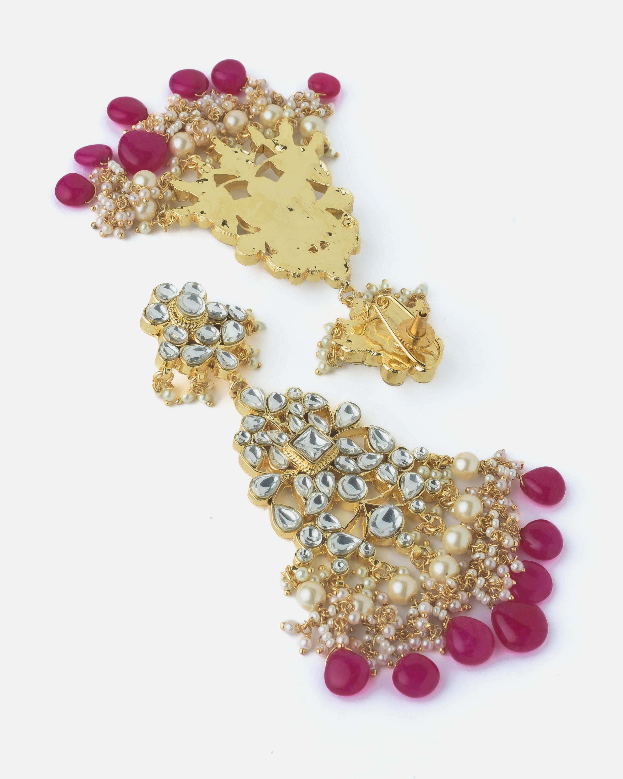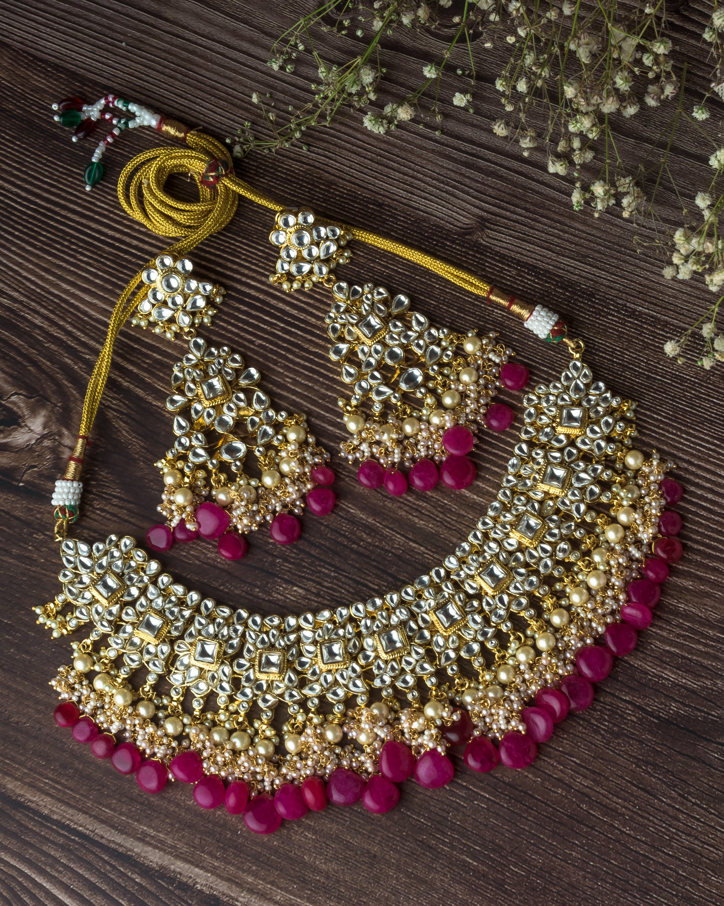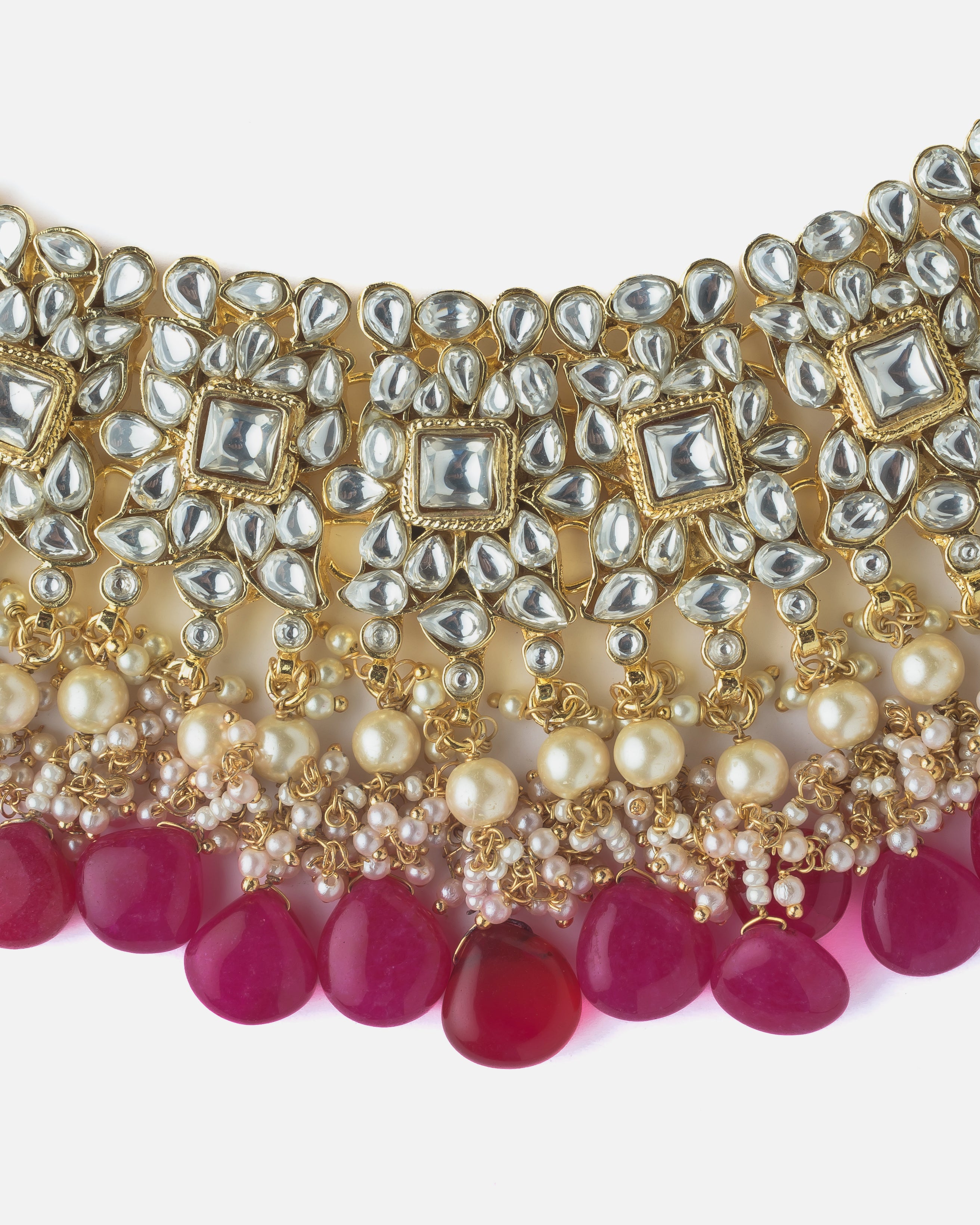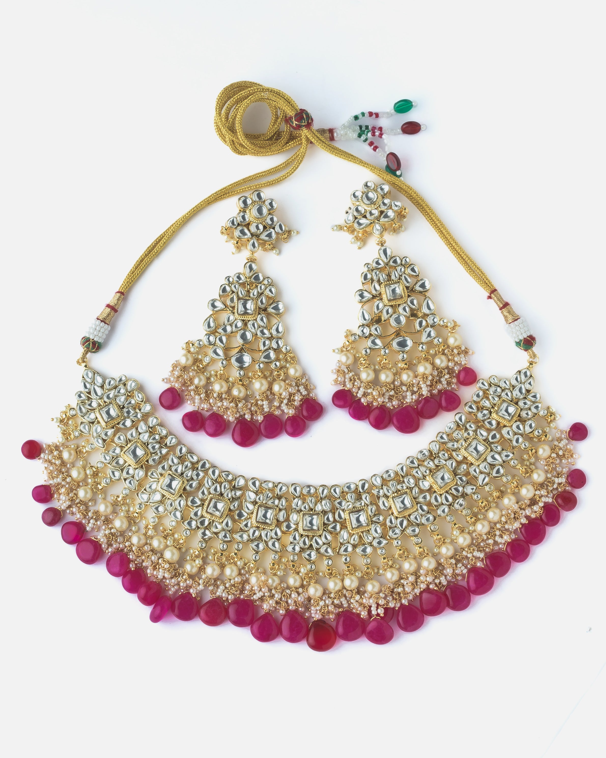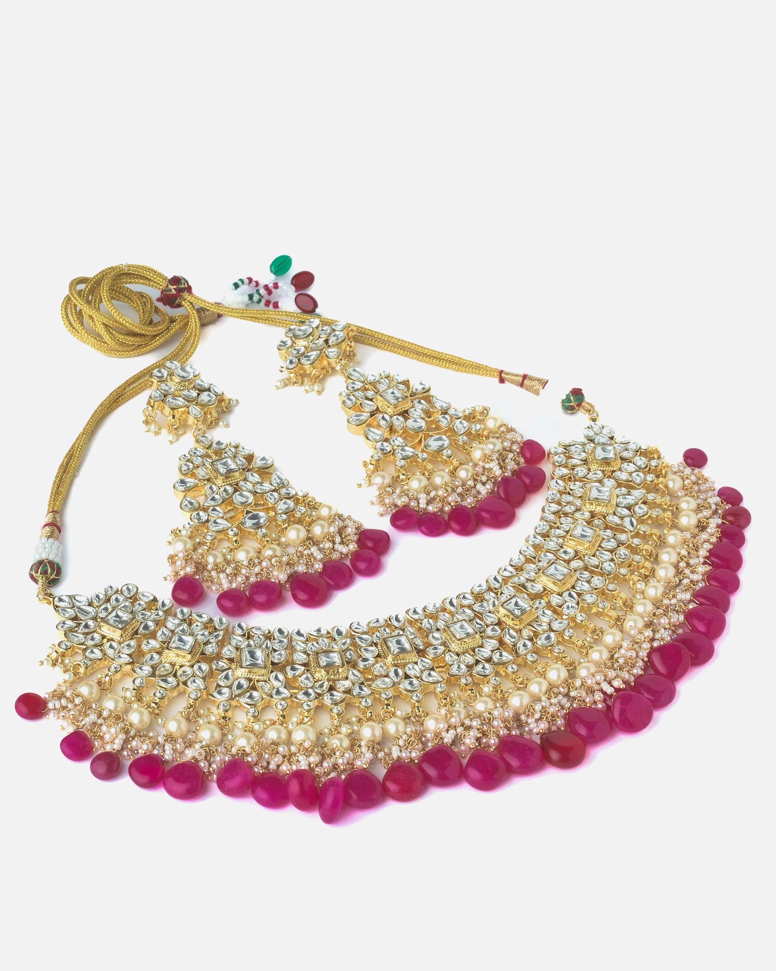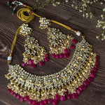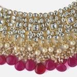 Exquisite traditional Kundan necklace set featuring intricate gold detailing, pearl embellishments, and vibrant pink stone drops. Perfect for weddings, festivals, and ethnic celebrations.