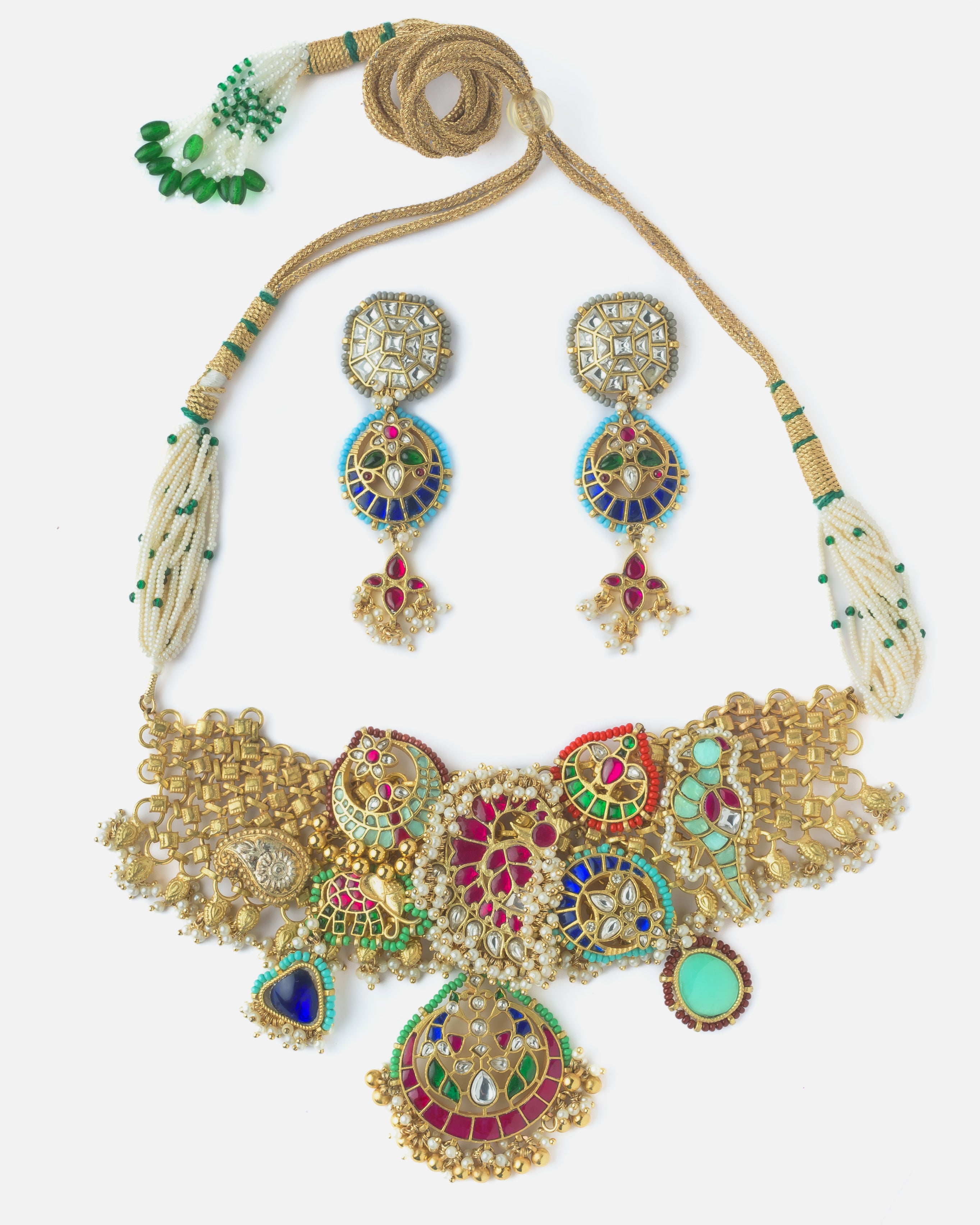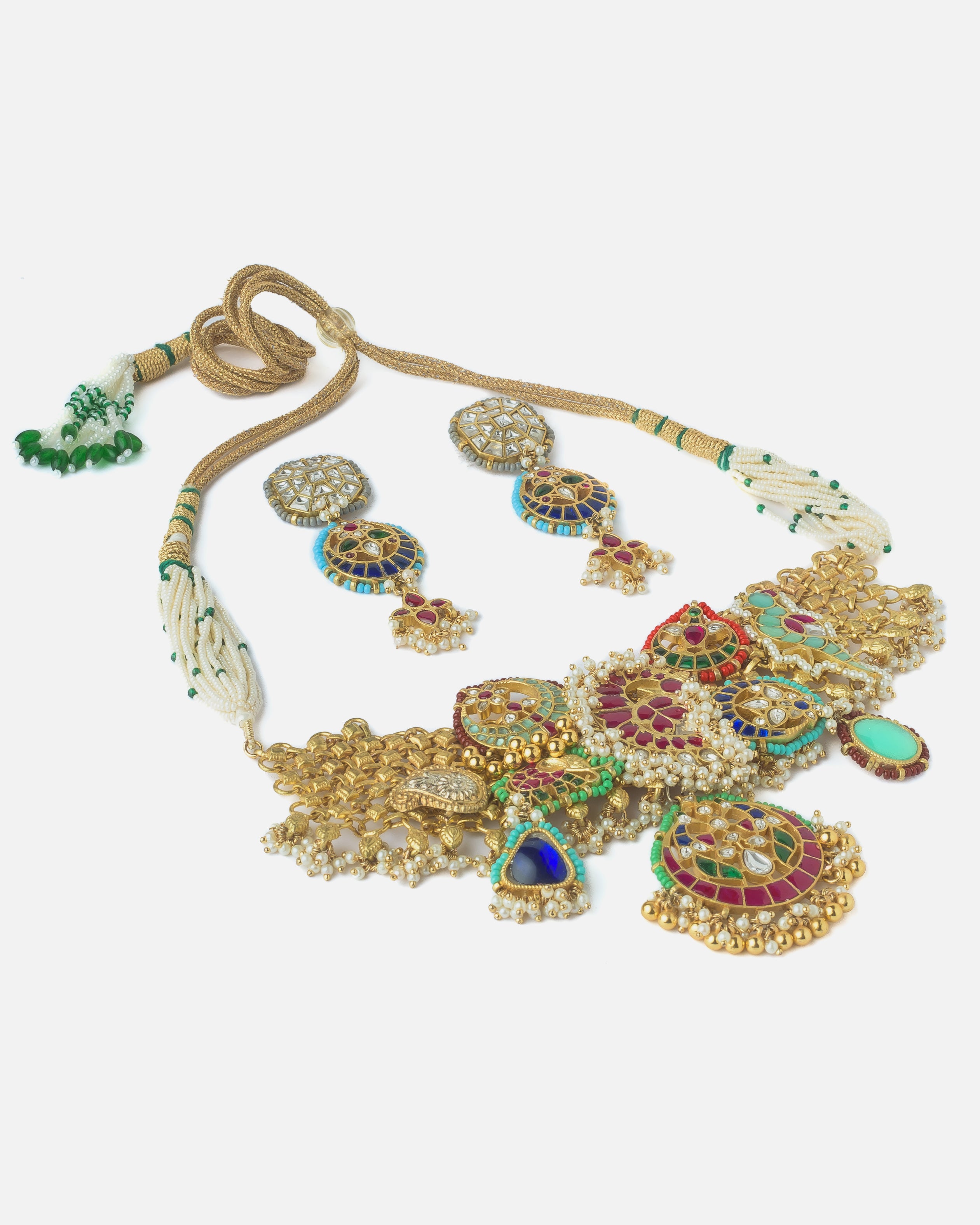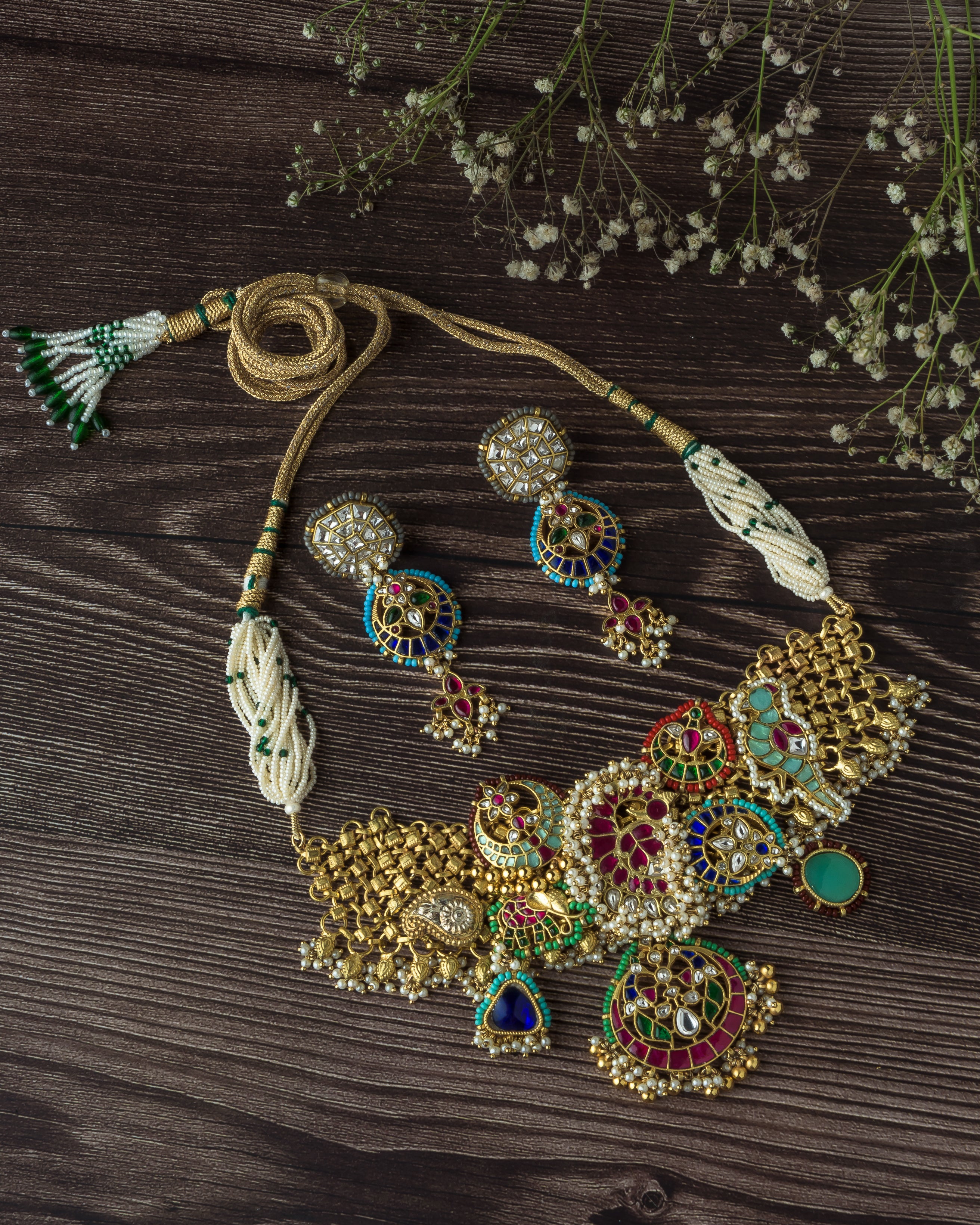 This vibrant traditional necklace set features intricate enamel work, pearls, and multicolored stones, perfect for weddings and festive wear. Comes with matching statement earrings for a complete look.