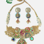 Gold Plated Multicolored Womens Kundan Choker Necklace Set with Pair of Earrings