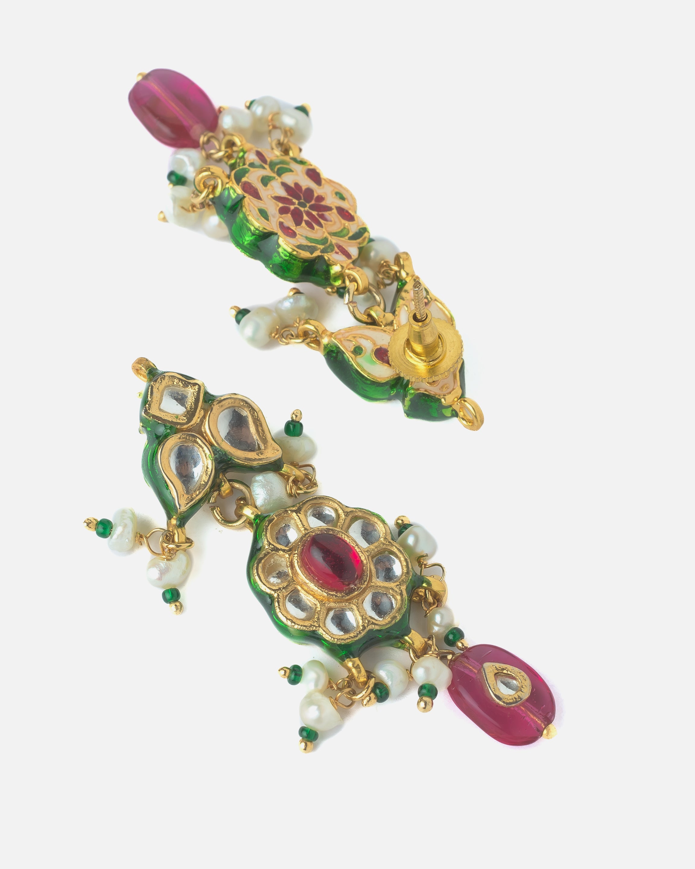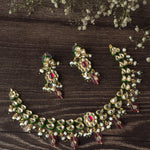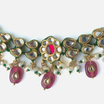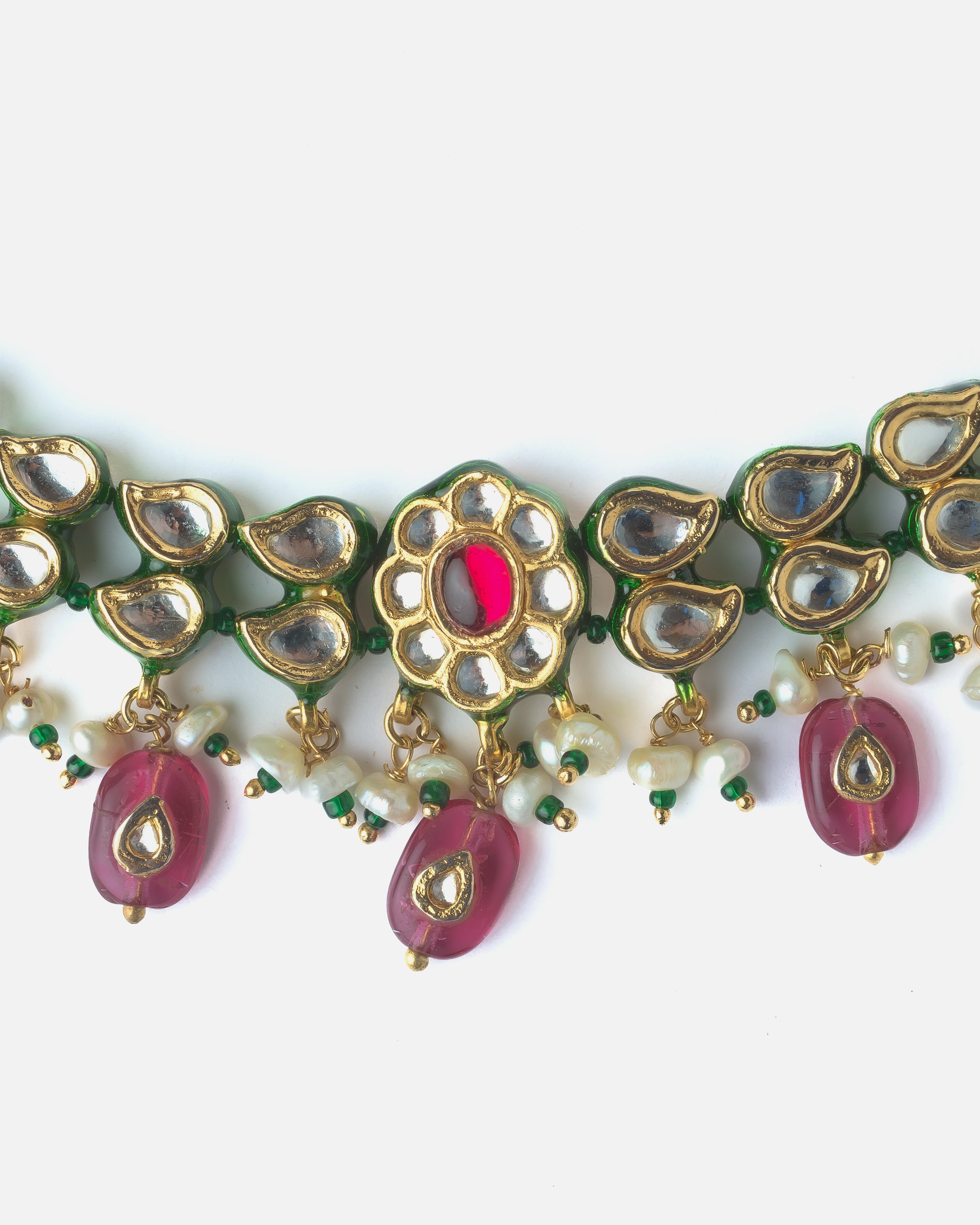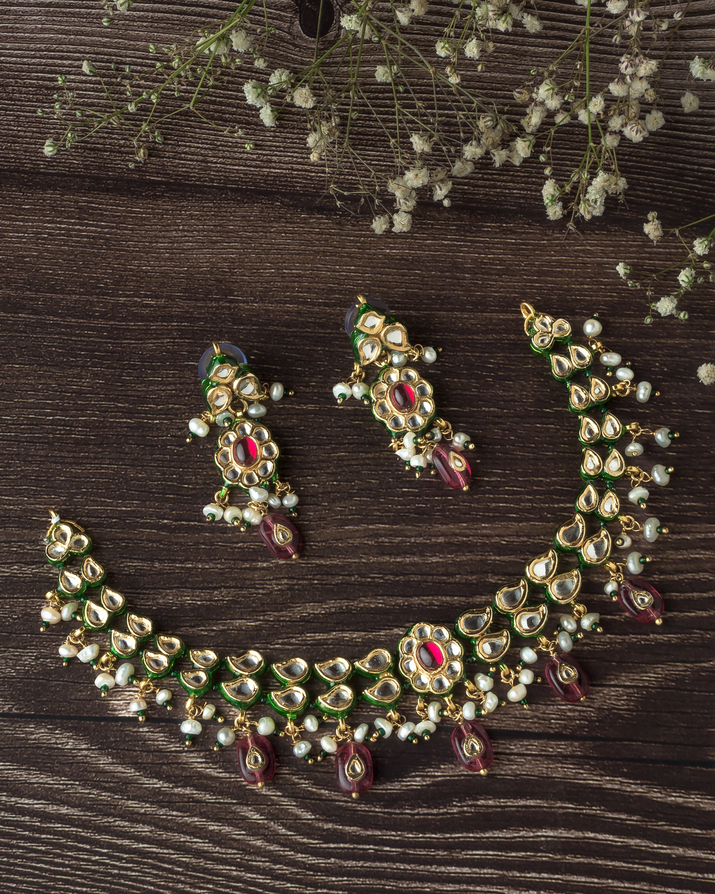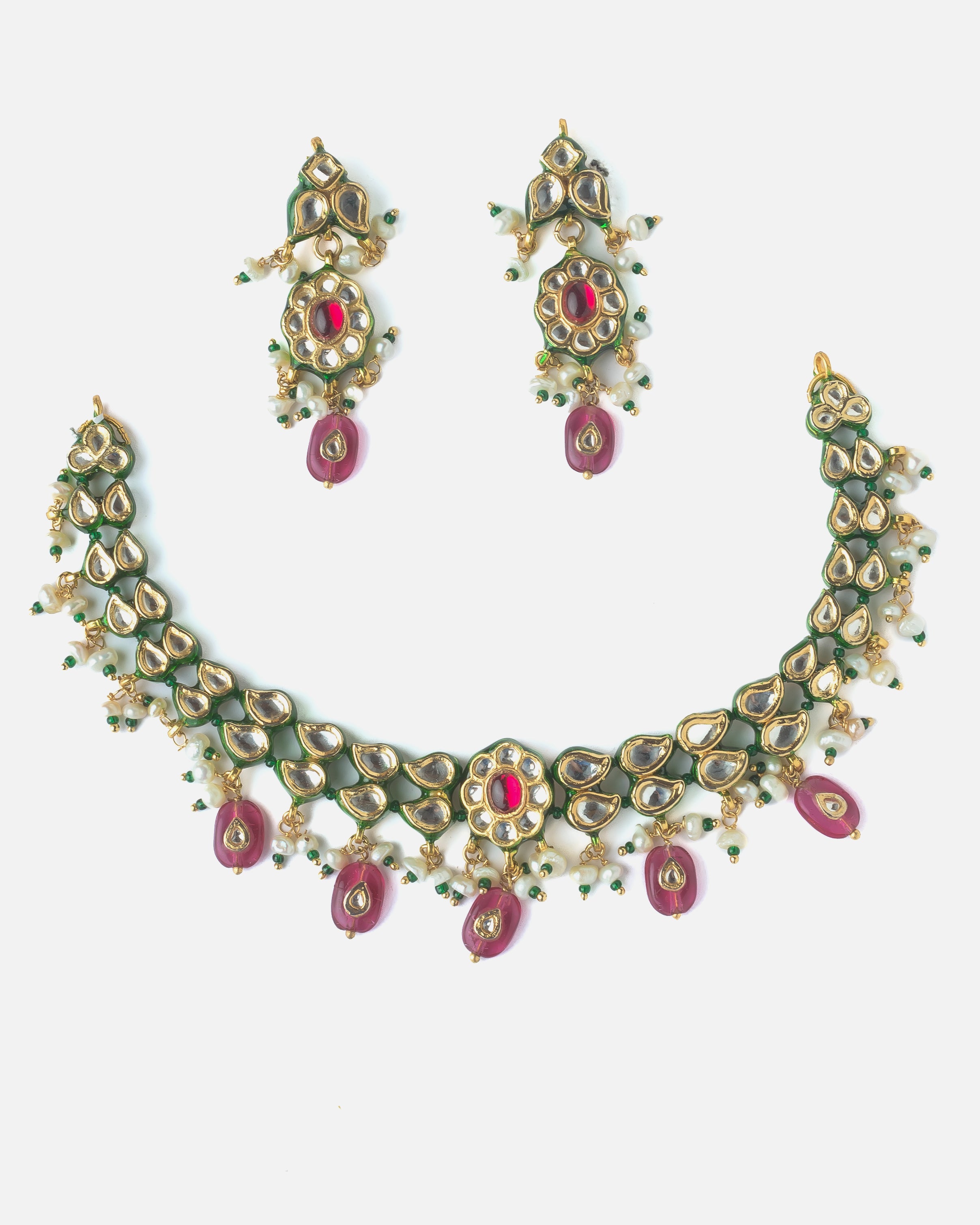 Elevate your ethnic look with this exquisite Kundan necklace set featuring green enamel, red stone highlights, and pearl drops. Includes matching earrings for a perfect traditional ensemble.