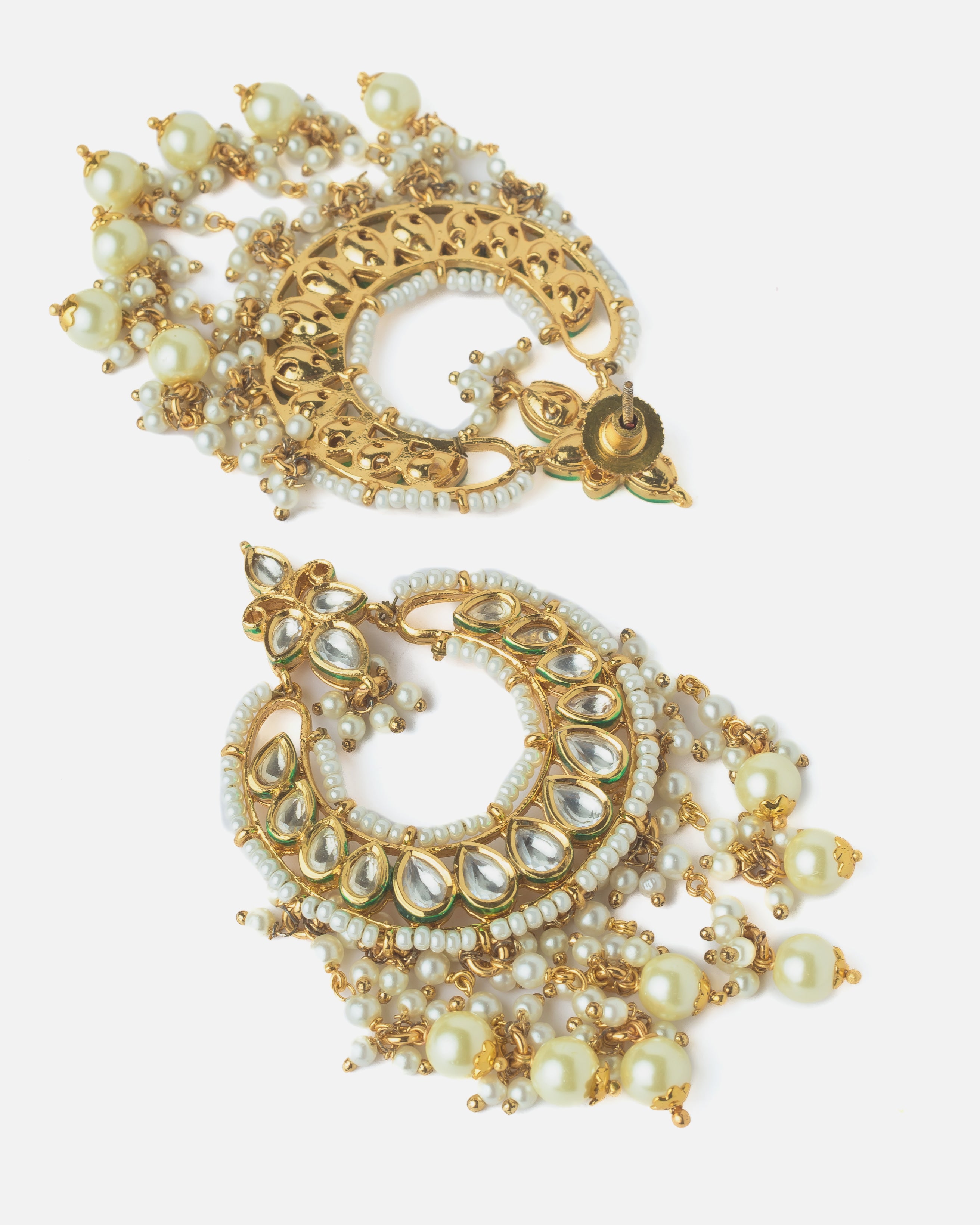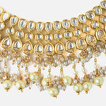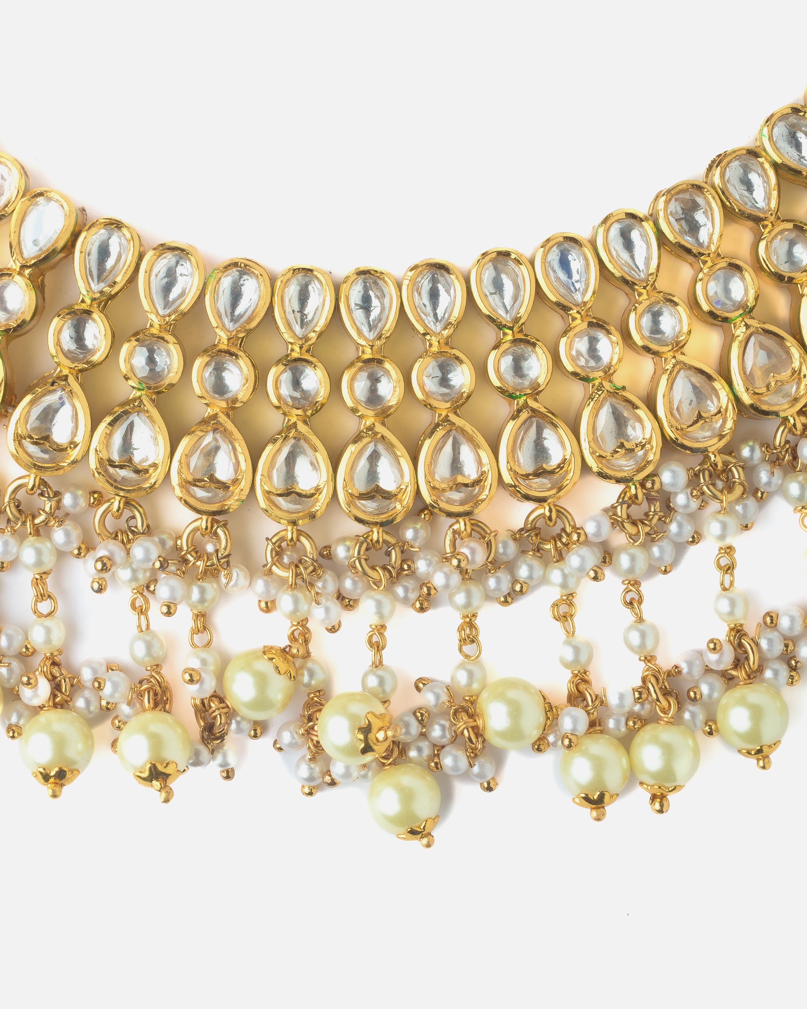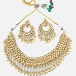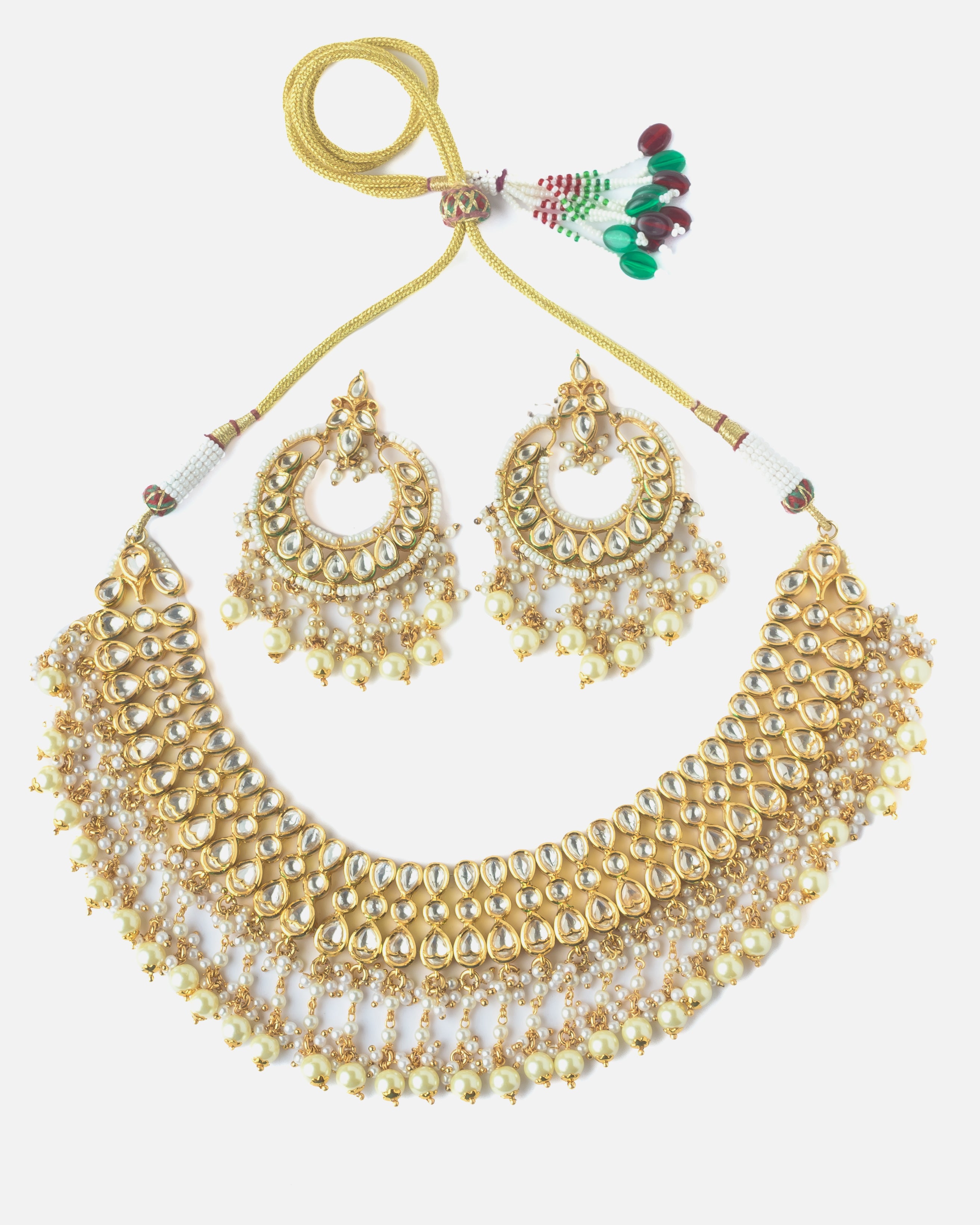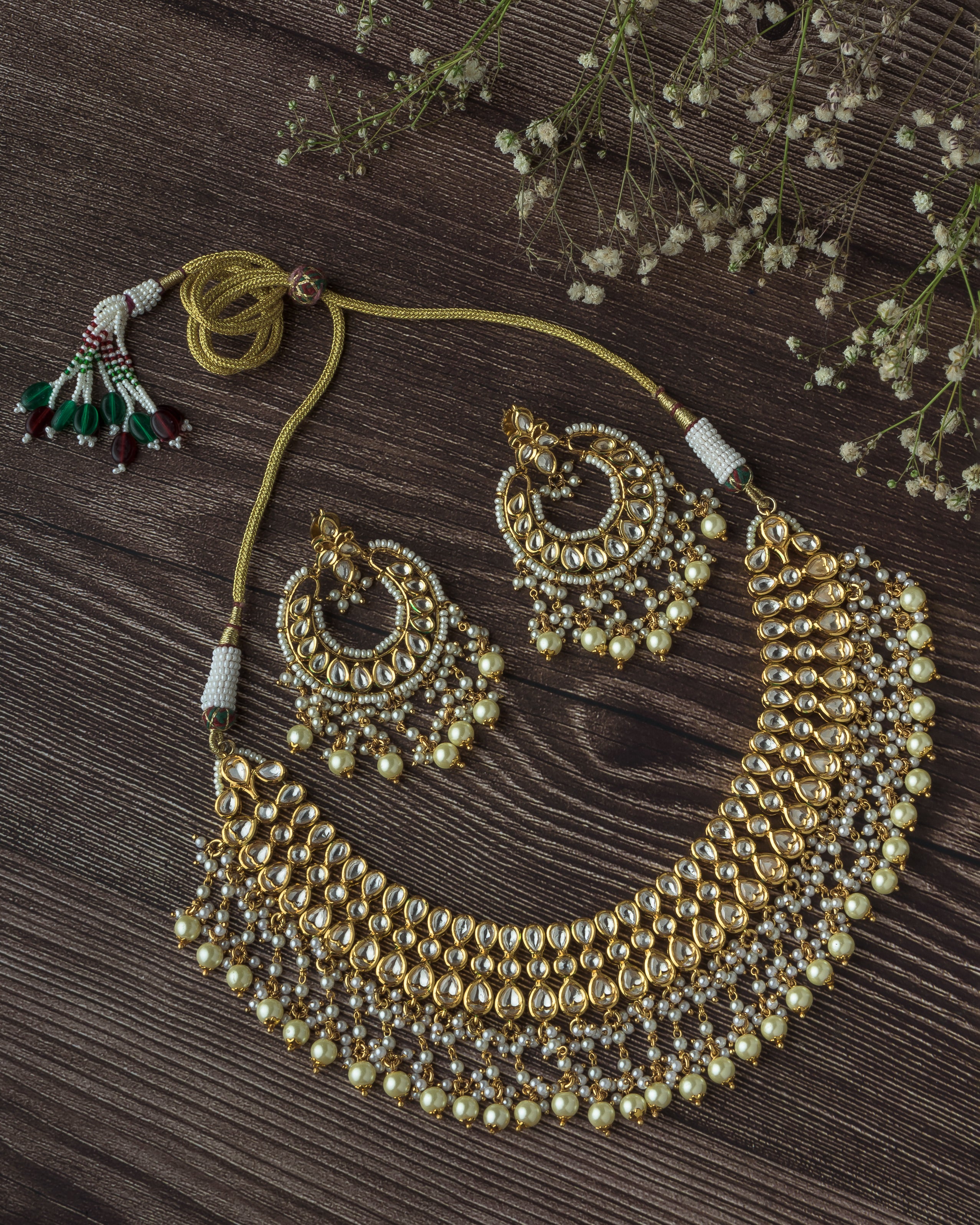 Exude elegance with this stunning traditional jewelry set featuring a gold-toned choker necklace and matching earrings, adorned with intricate Kundan work, pearls, and delicate bead detailing.