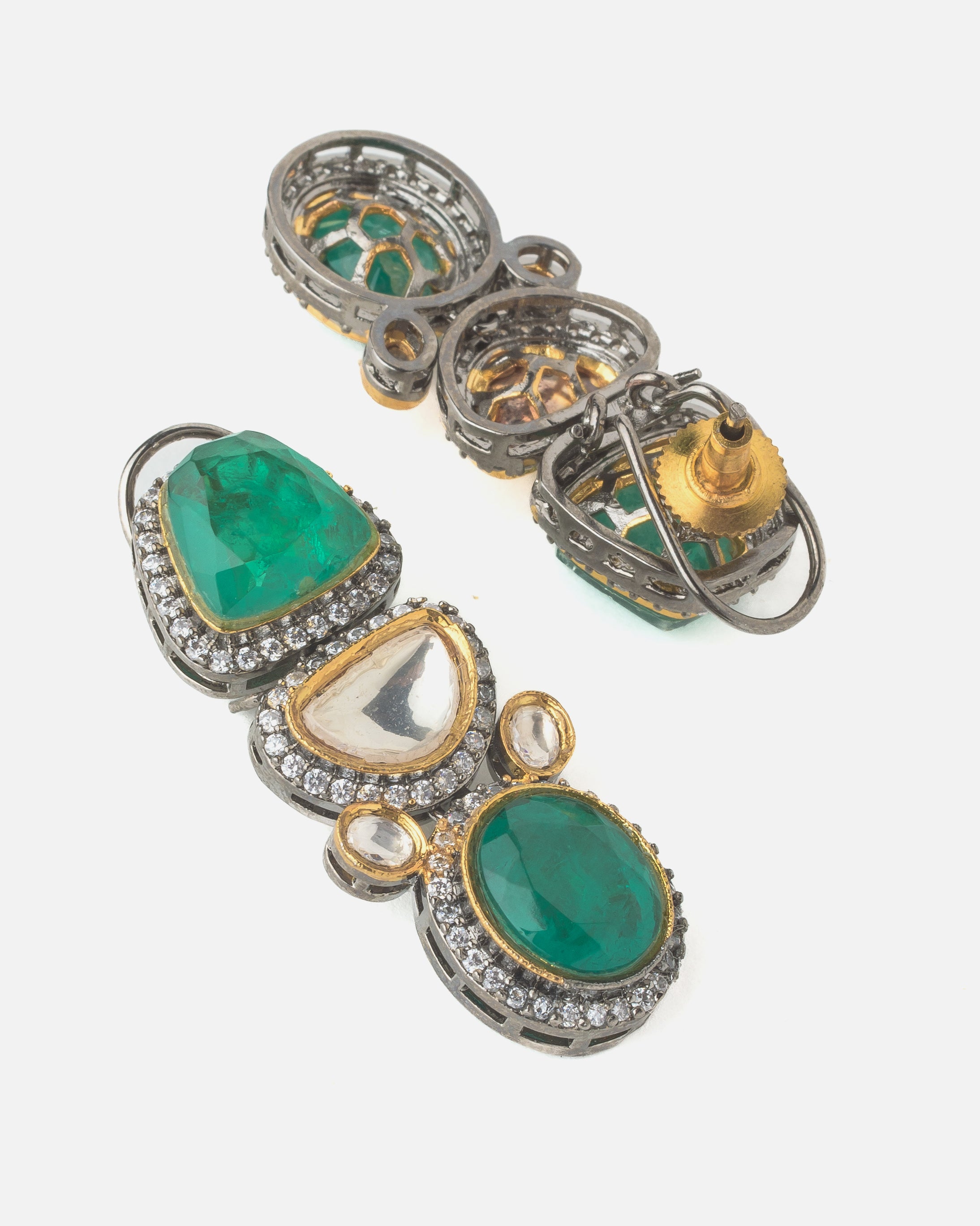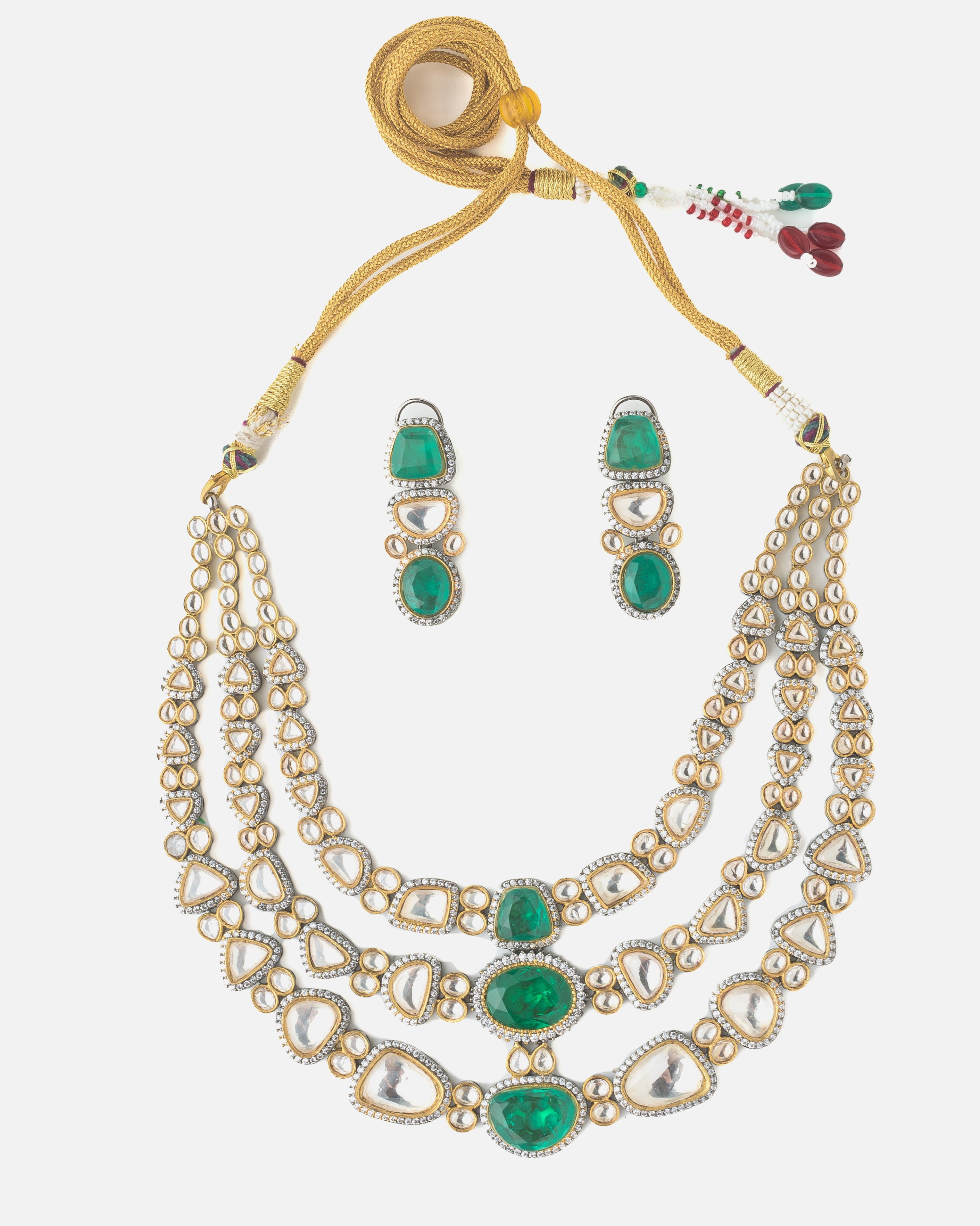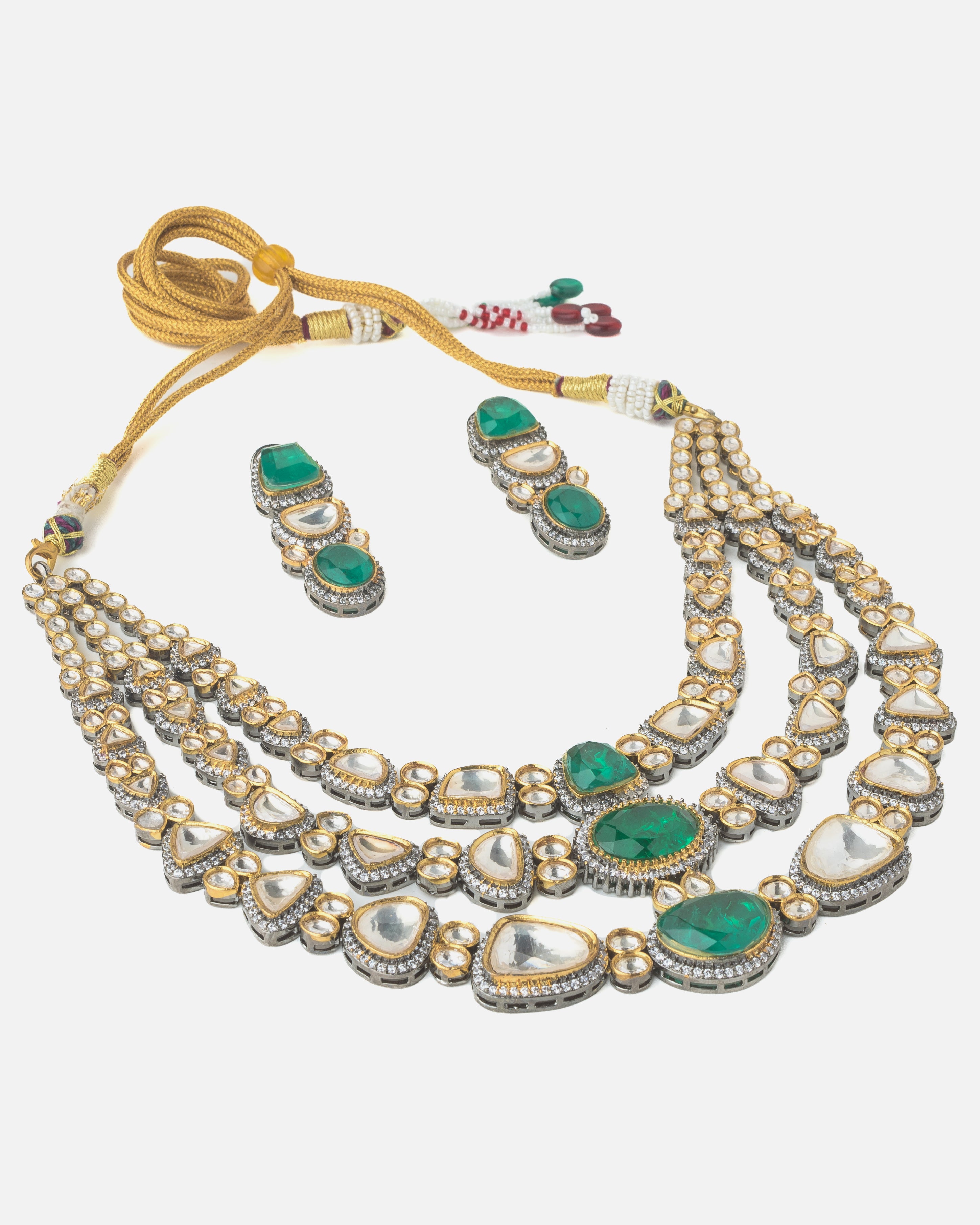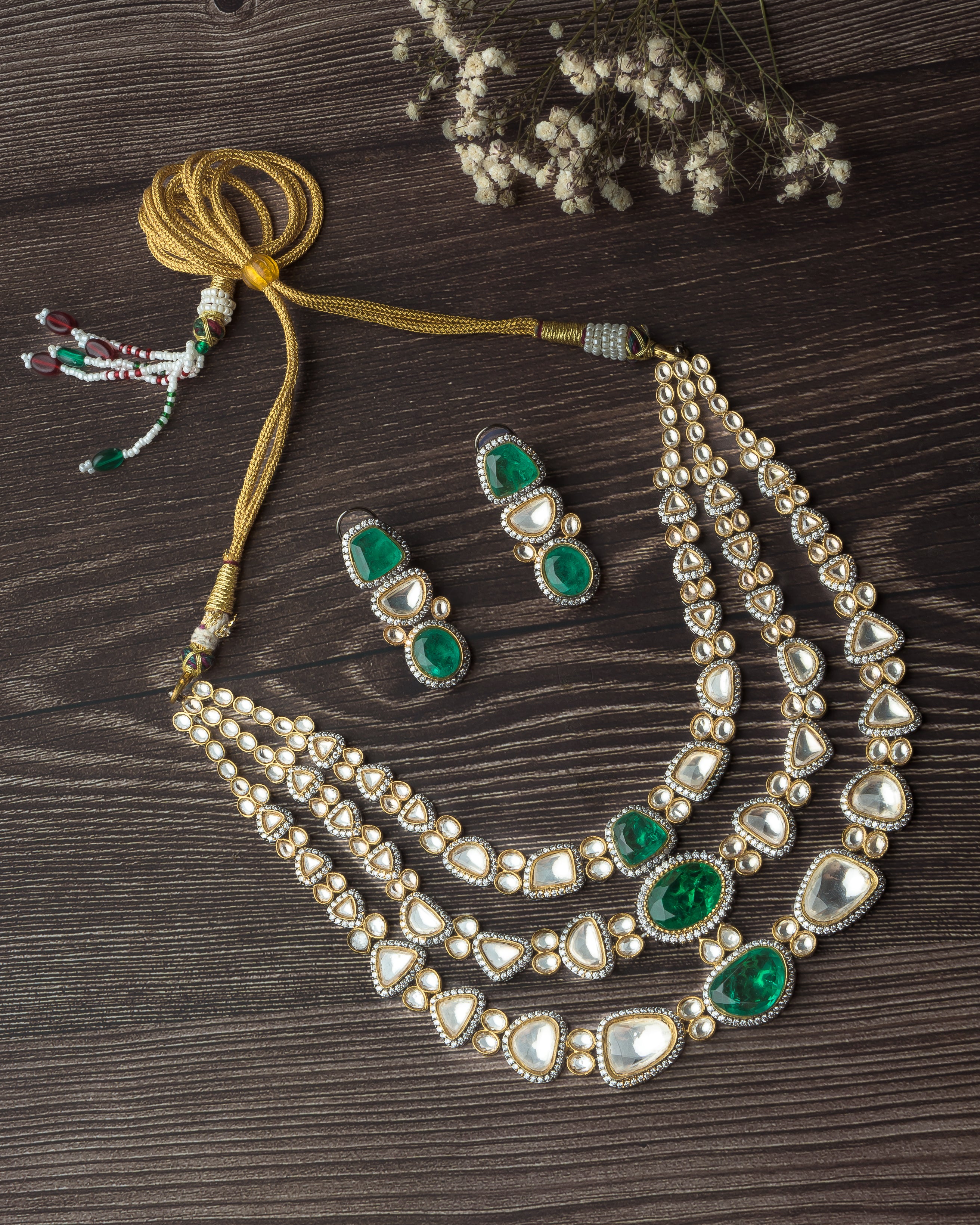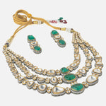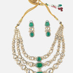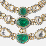 Add royal elegance to your ethnic wear with this stunning Kundan necklace set. Featuring layered white stones and bold green accents, it's perfect for weddings, festivals, and grand occasions.