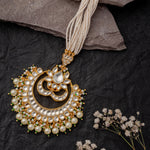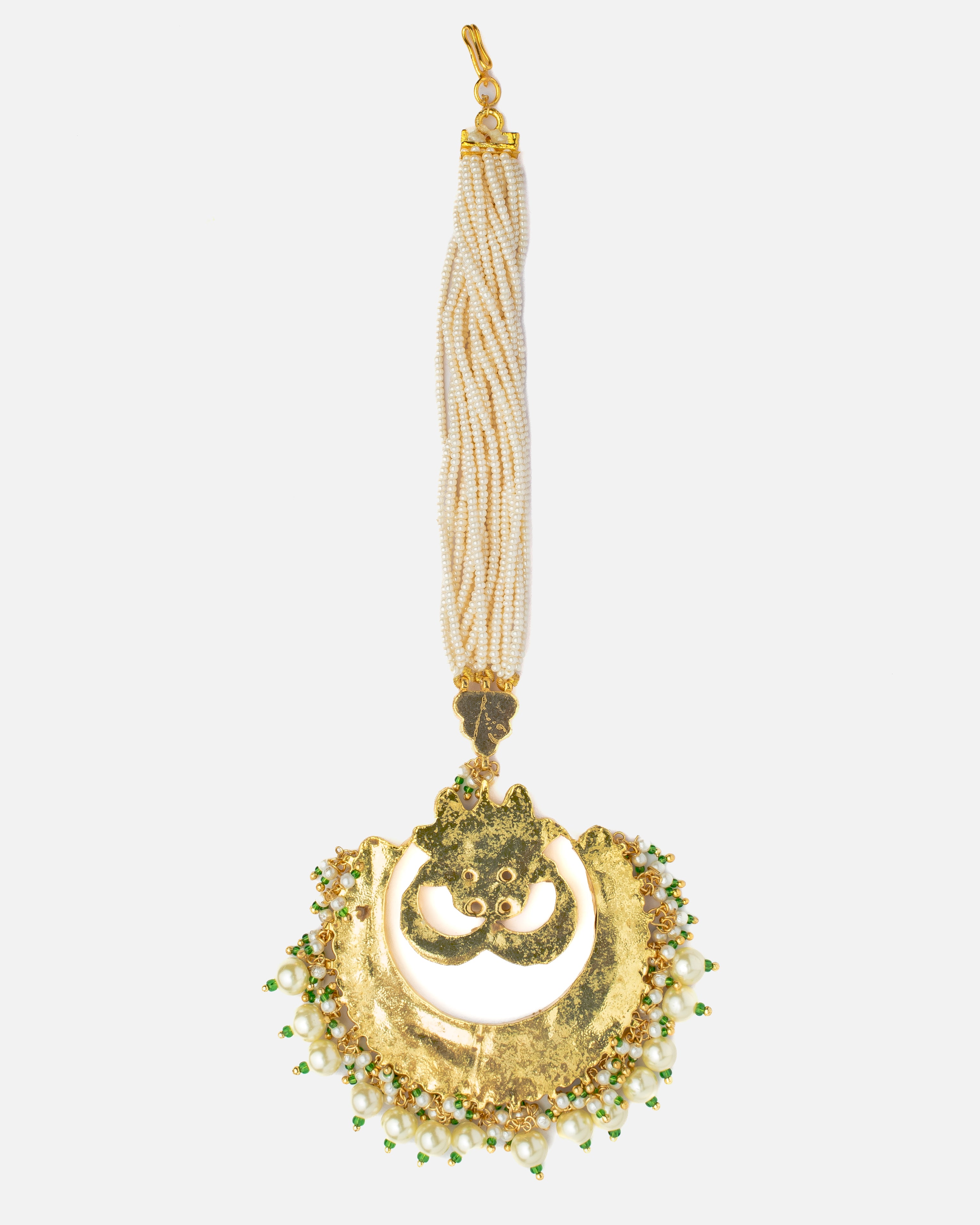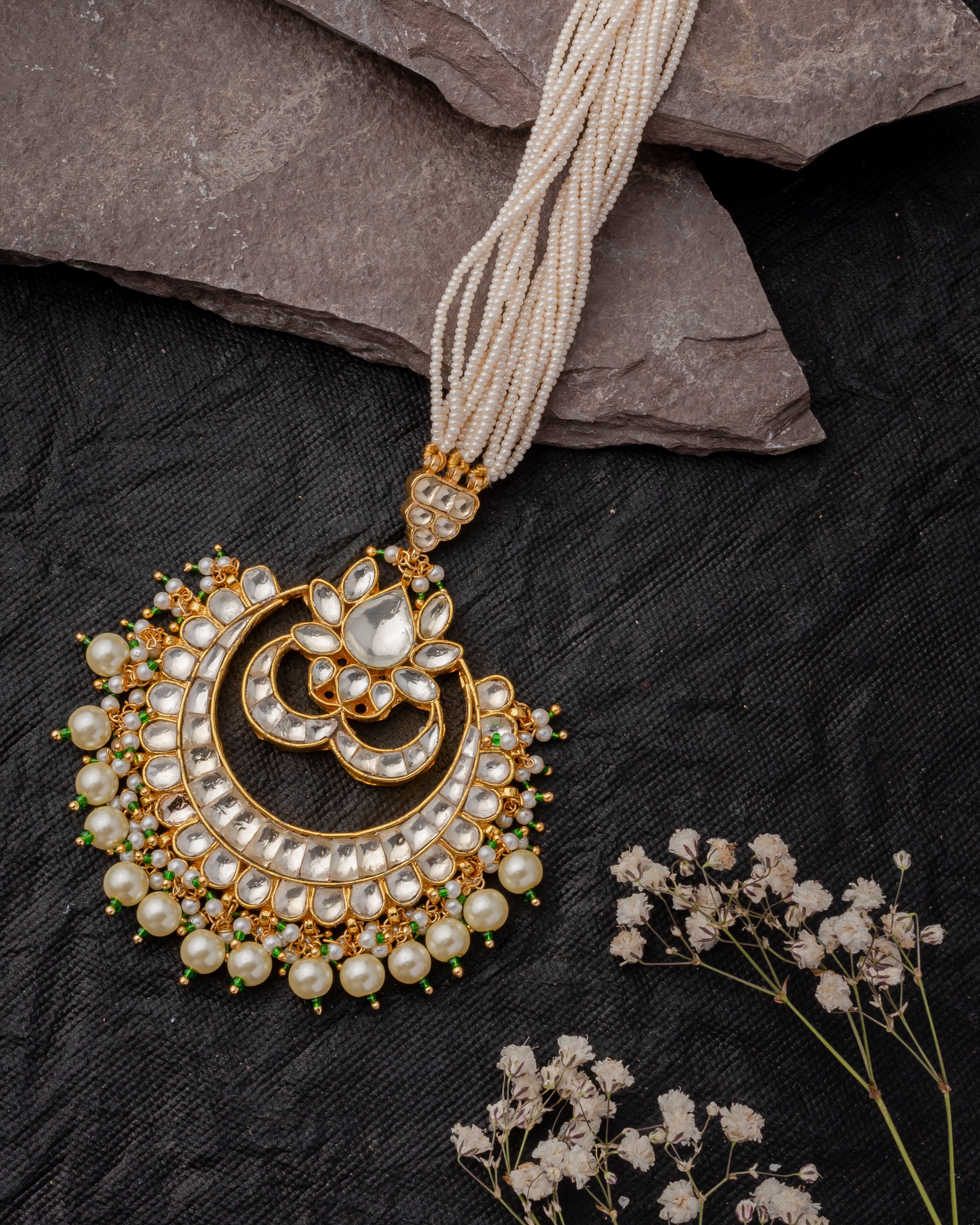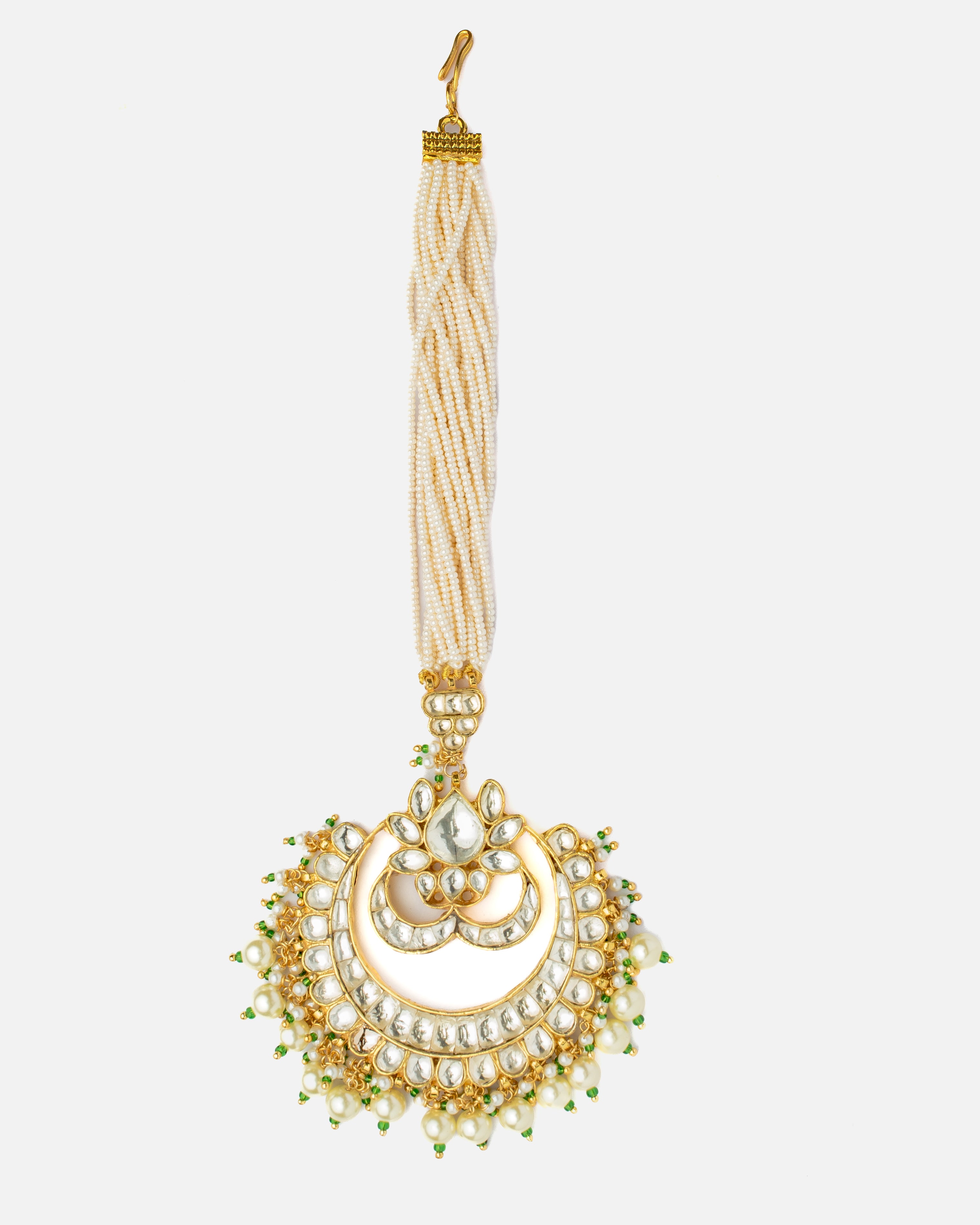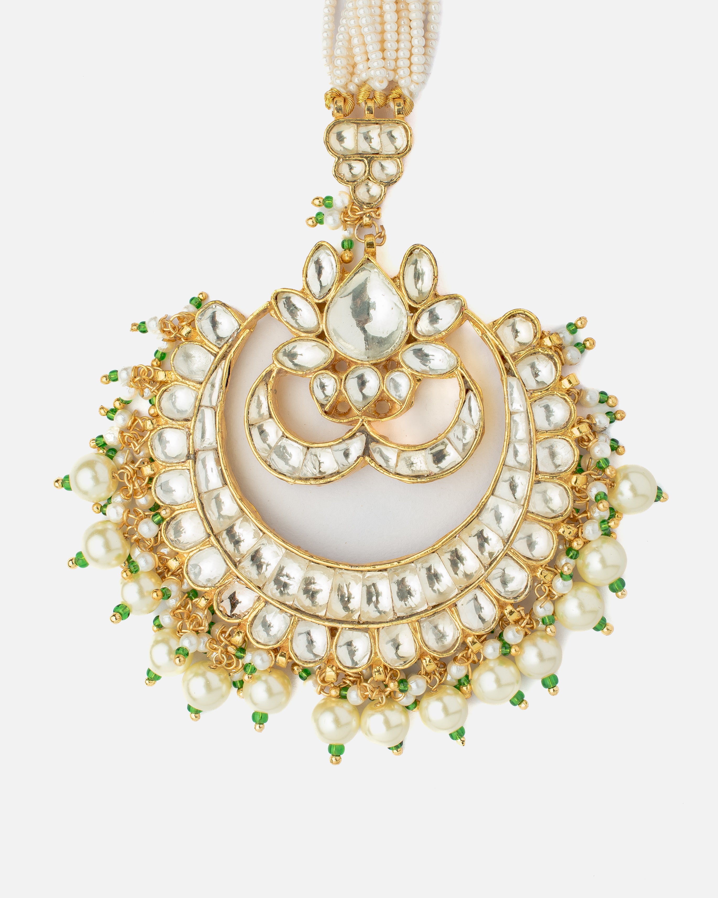 Adorn yourself with this stunning maangtikaa featuring an elegant crescent design, pearl strands, and intricate Kundan detailing. A perfect blend of tradition and glamour for weddings and festive occasions.