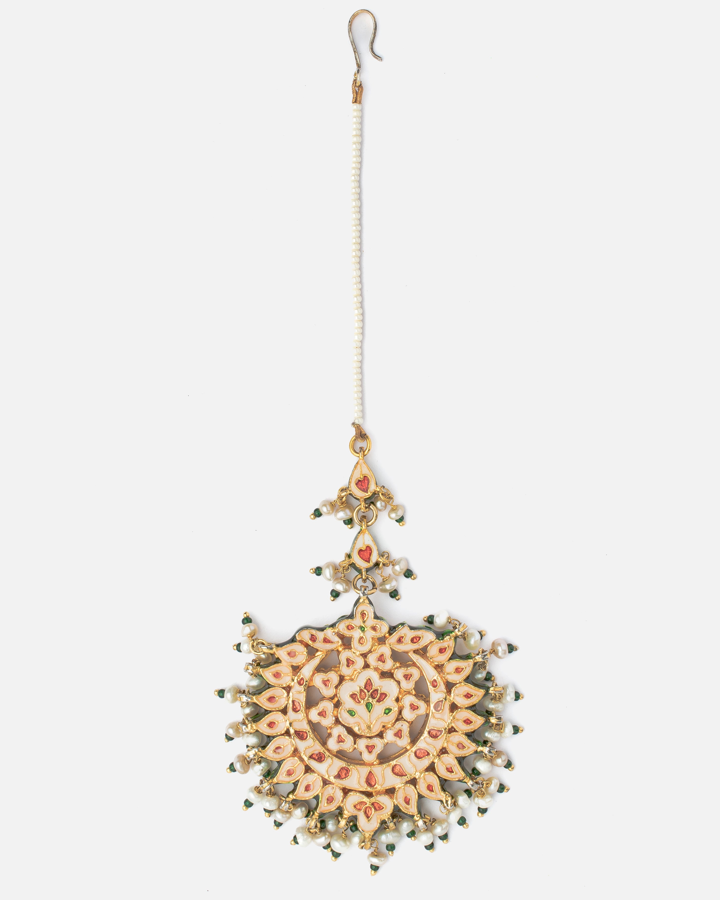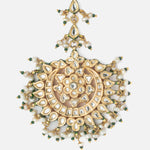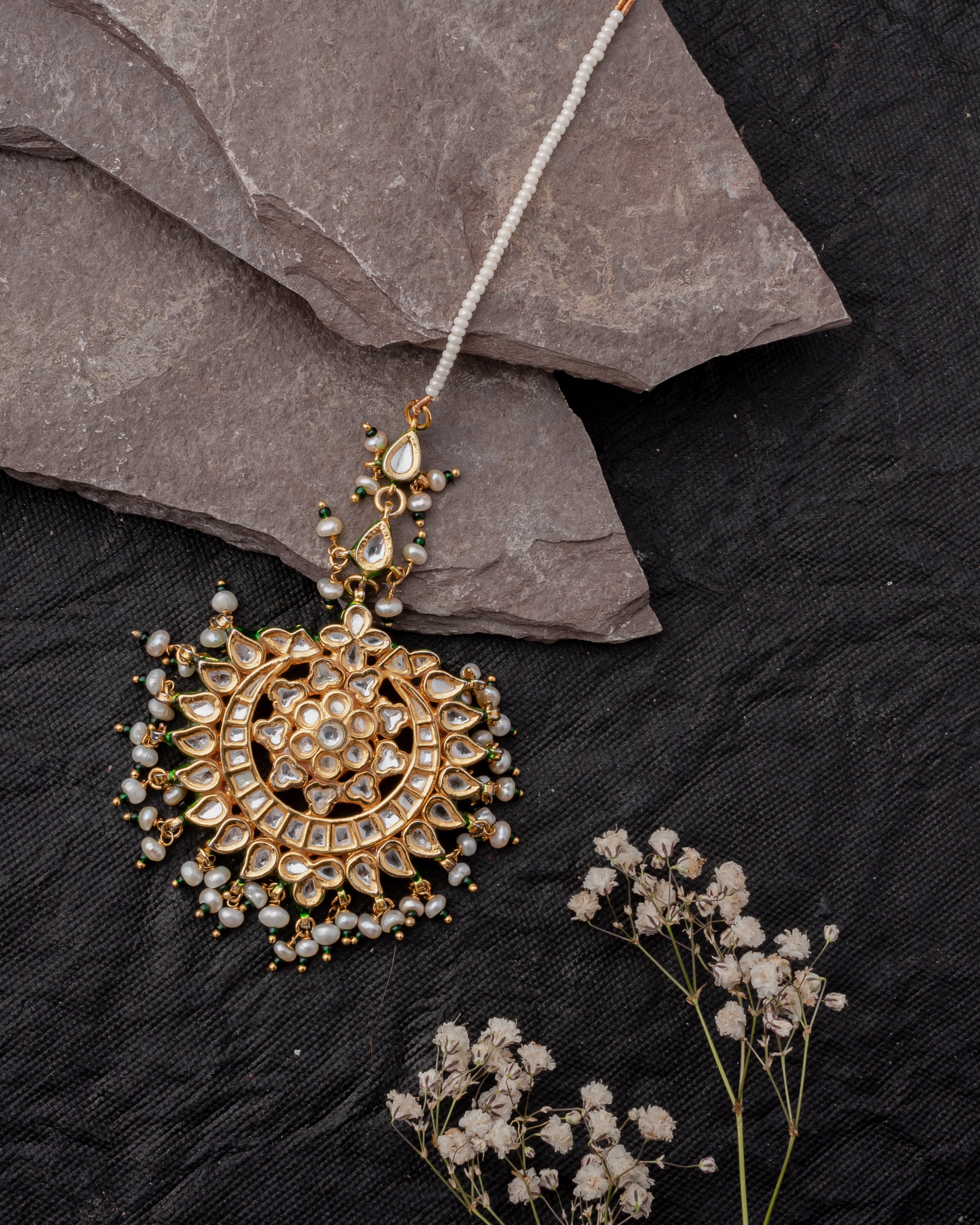 Elegant gold-plated maangtikka with intricate Kundan work, delicate pearl embellishments, and a traditional round pendant. Perfect for bridal and festive wear, adding regal charm to any ethnic ensemble.