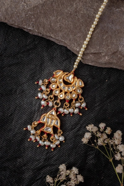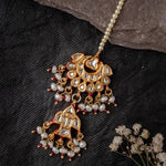 Elevate your bridal look with this traditional mangtika, featuring intricate gold plating, pearls, and red accents. Perfect for weddings and festive occasions, this timeless piece adds elegance to any ensemble.