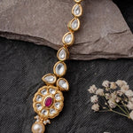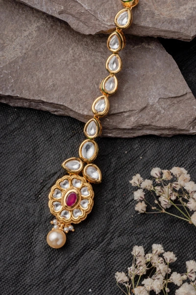 This exquisite mangtika features uncut polki stones, a central ruby-like gem, and a pearl drop, set in a gold-toned frame. A perfect blend of tradition and elegance, ideal for bridal and festive wear.