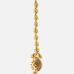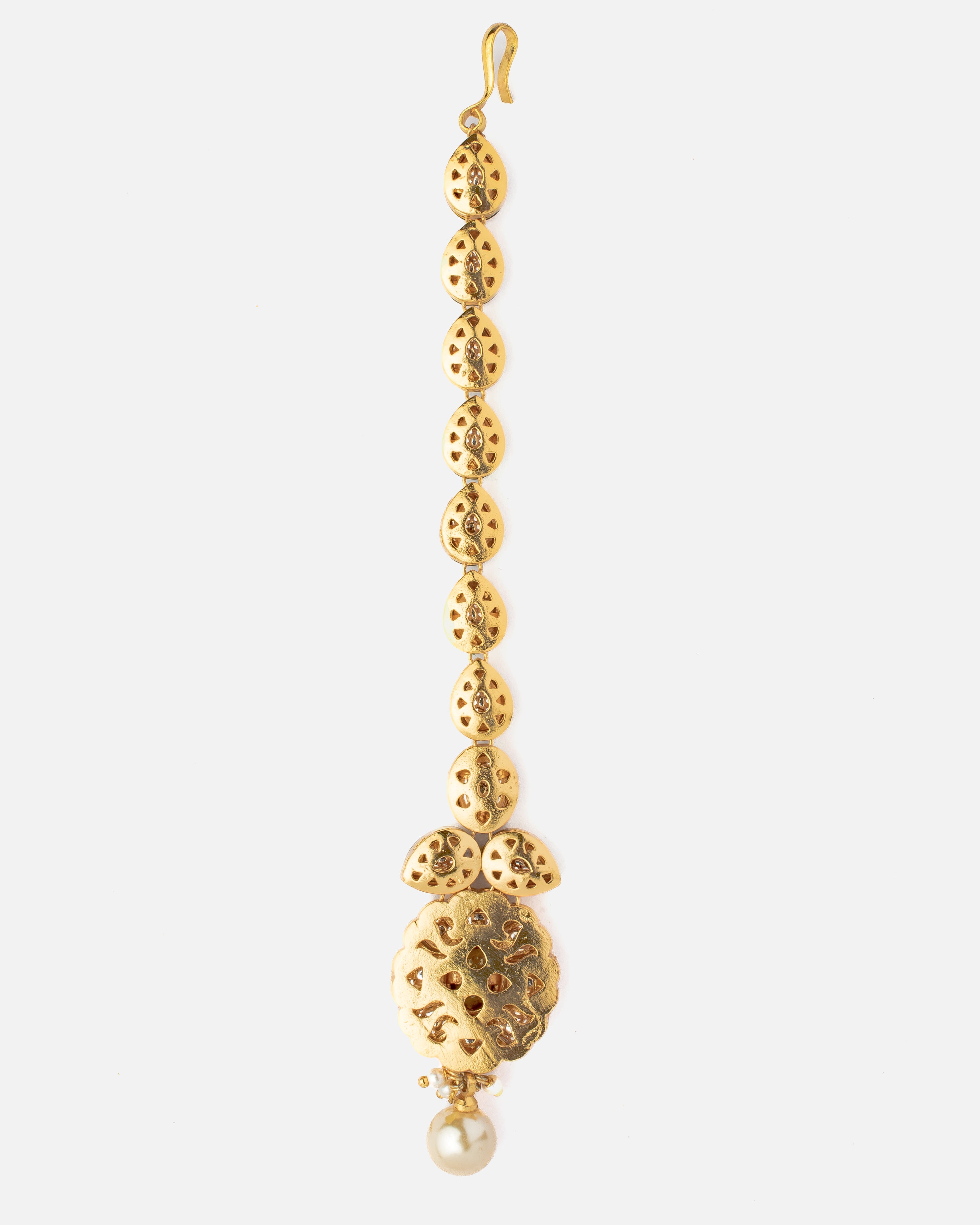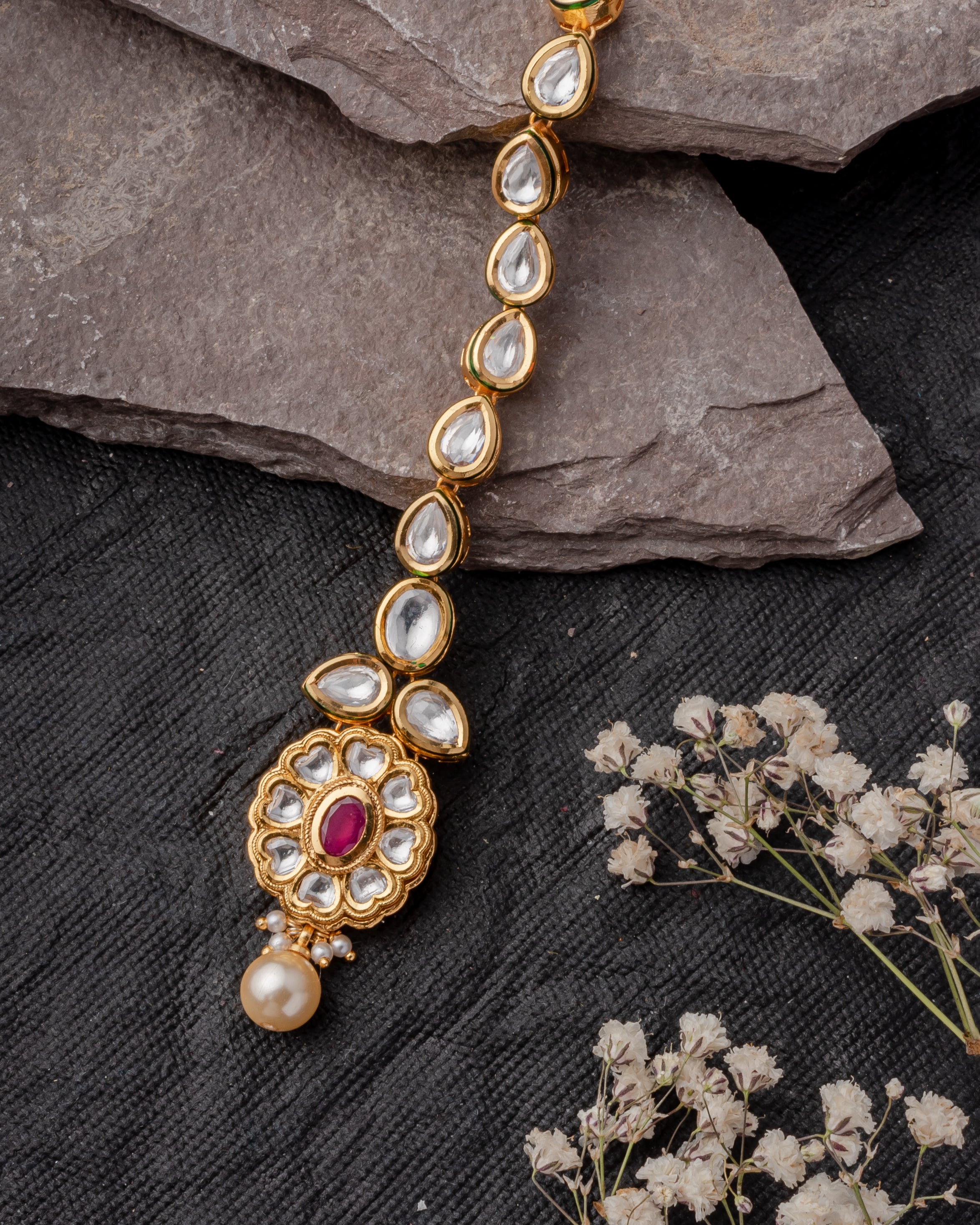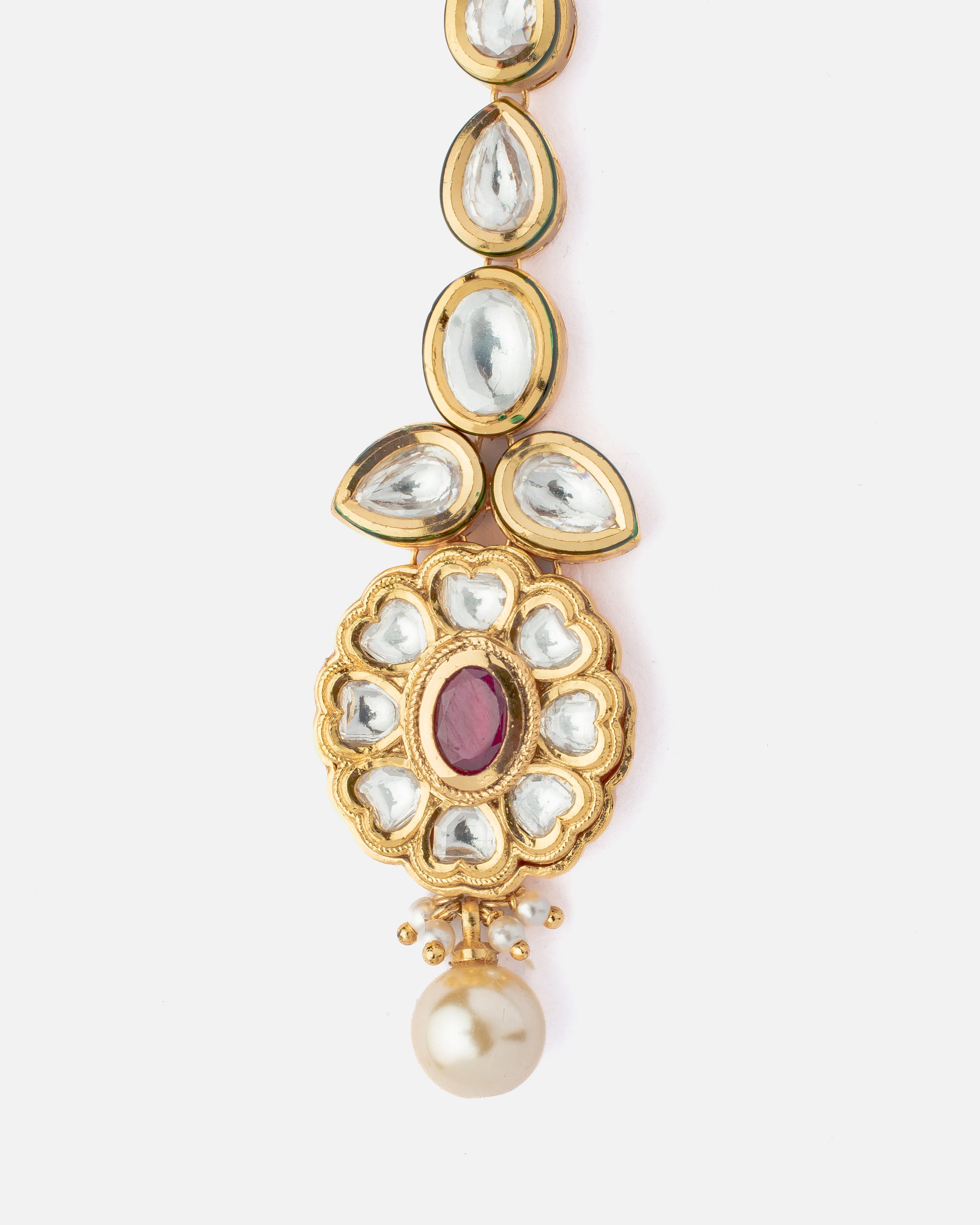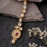 This exquisite Maangtikka features uncut polki stones, a central ruby-like gem, and a pearl drop, set in a gold-toned frame. A perfect blend of tradition and elegance, ideal for bridal and festive wear.