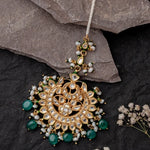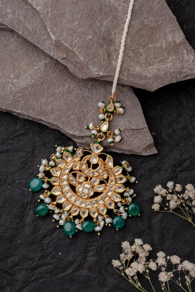 An elegant mangtika featuring a gold-toned base, intricate polki work, and rich green bead embellishments. Perfect for bridal and festive wear, adding a regal touch to traditional attire.