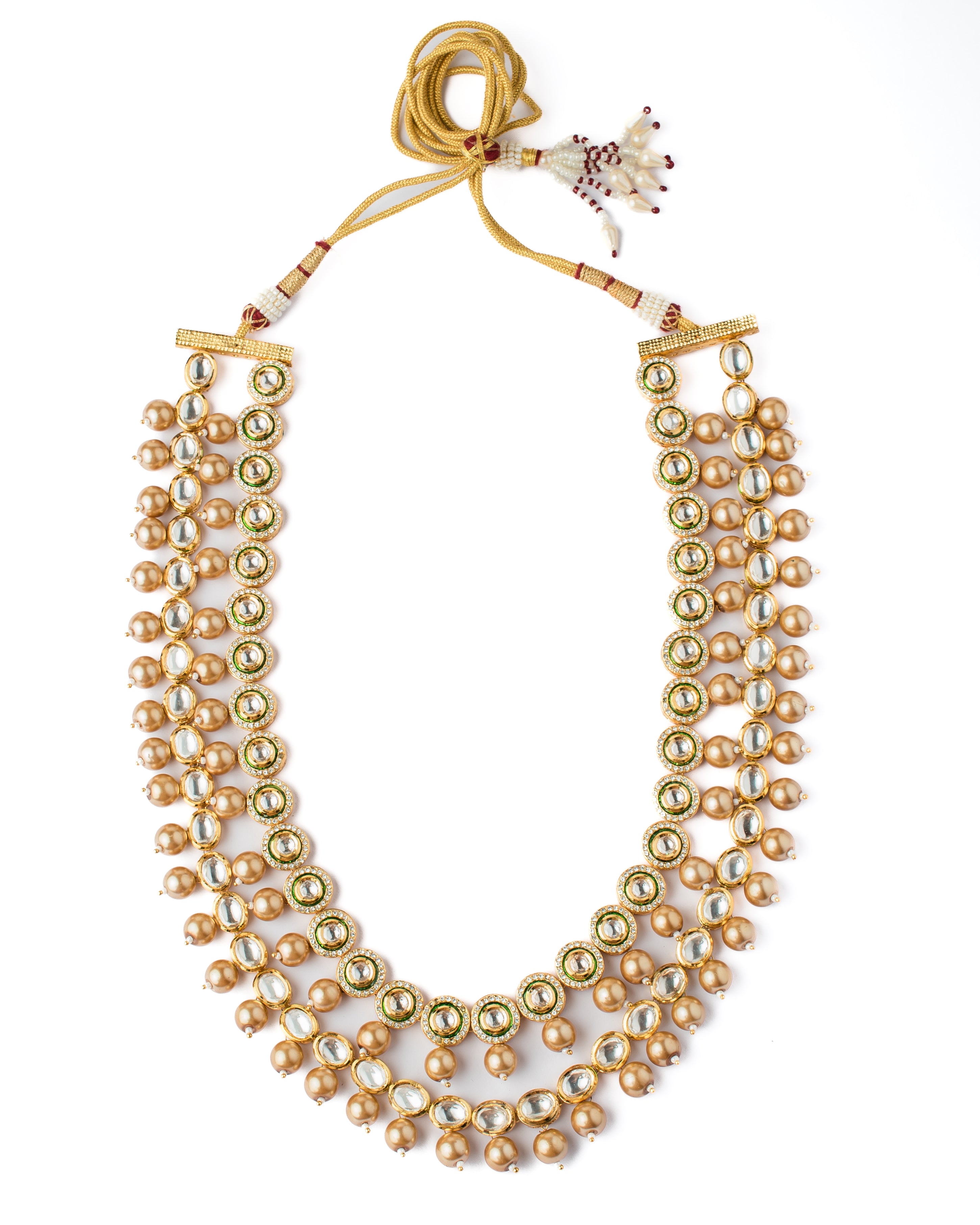- Design Excellence: Multi-layered necklace with golden beads and intricate Kundan embellishments.