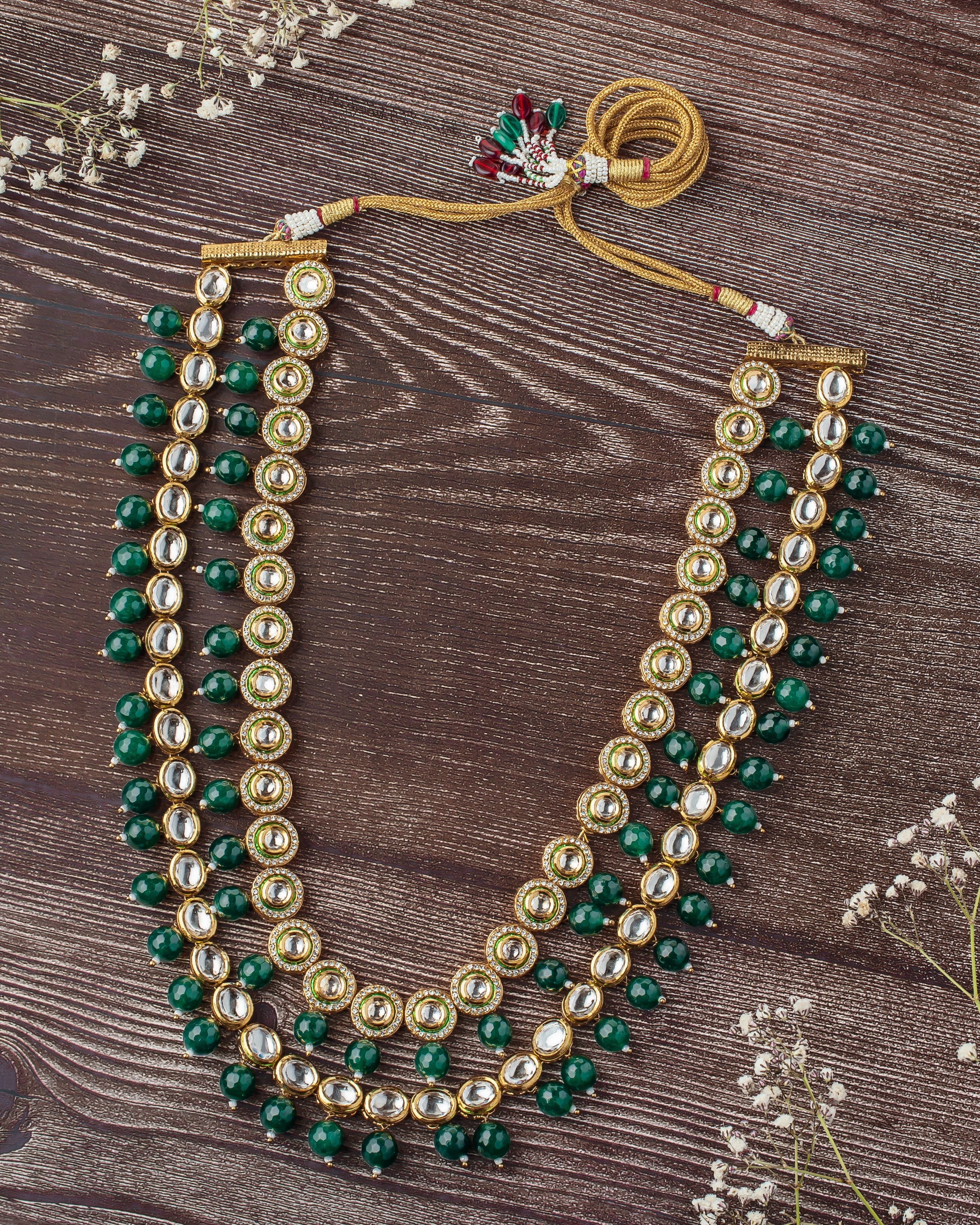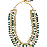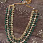 - Elegant Design: Multi-layered necklace with Kundan stones and green beads, exuding timeless elegance.