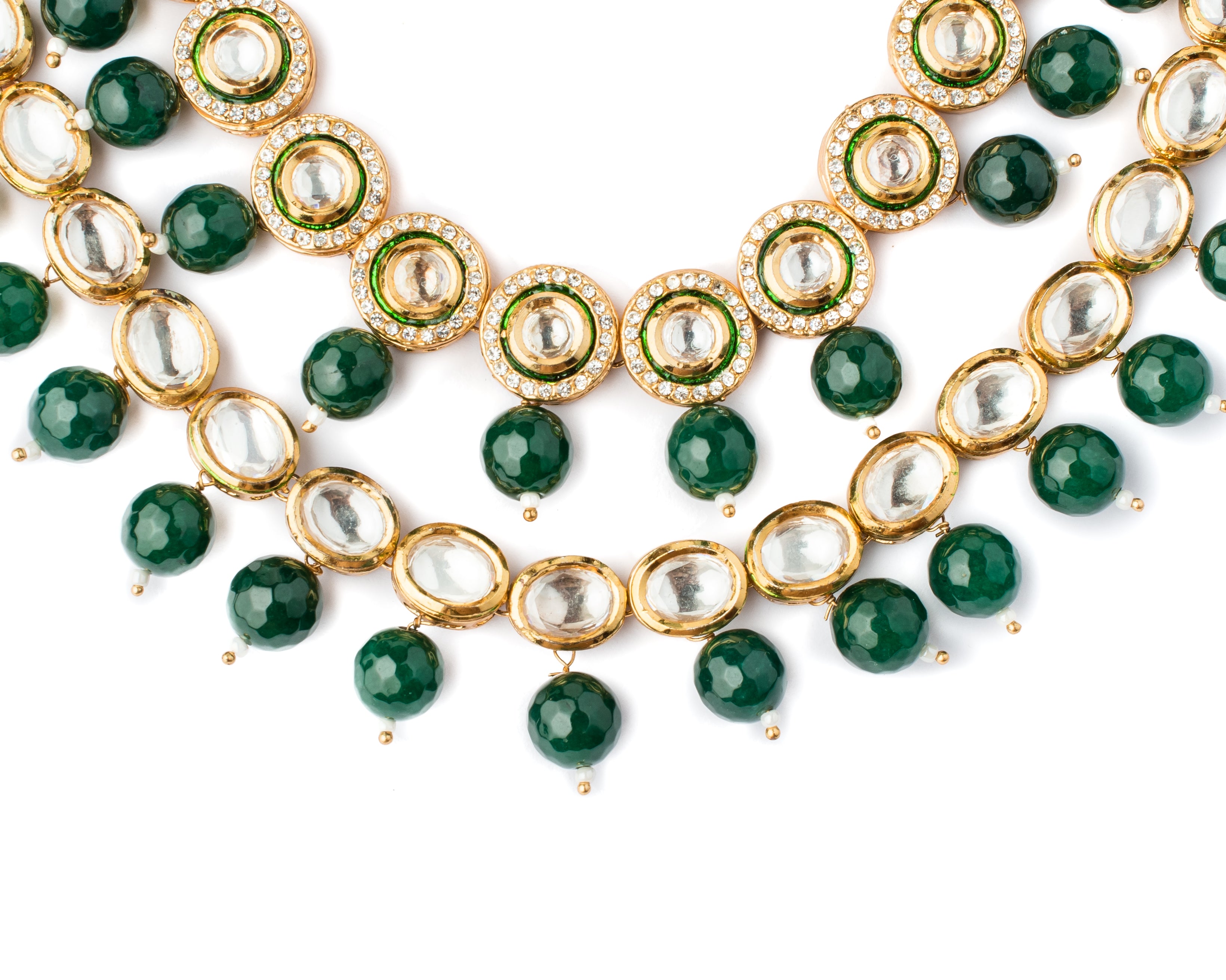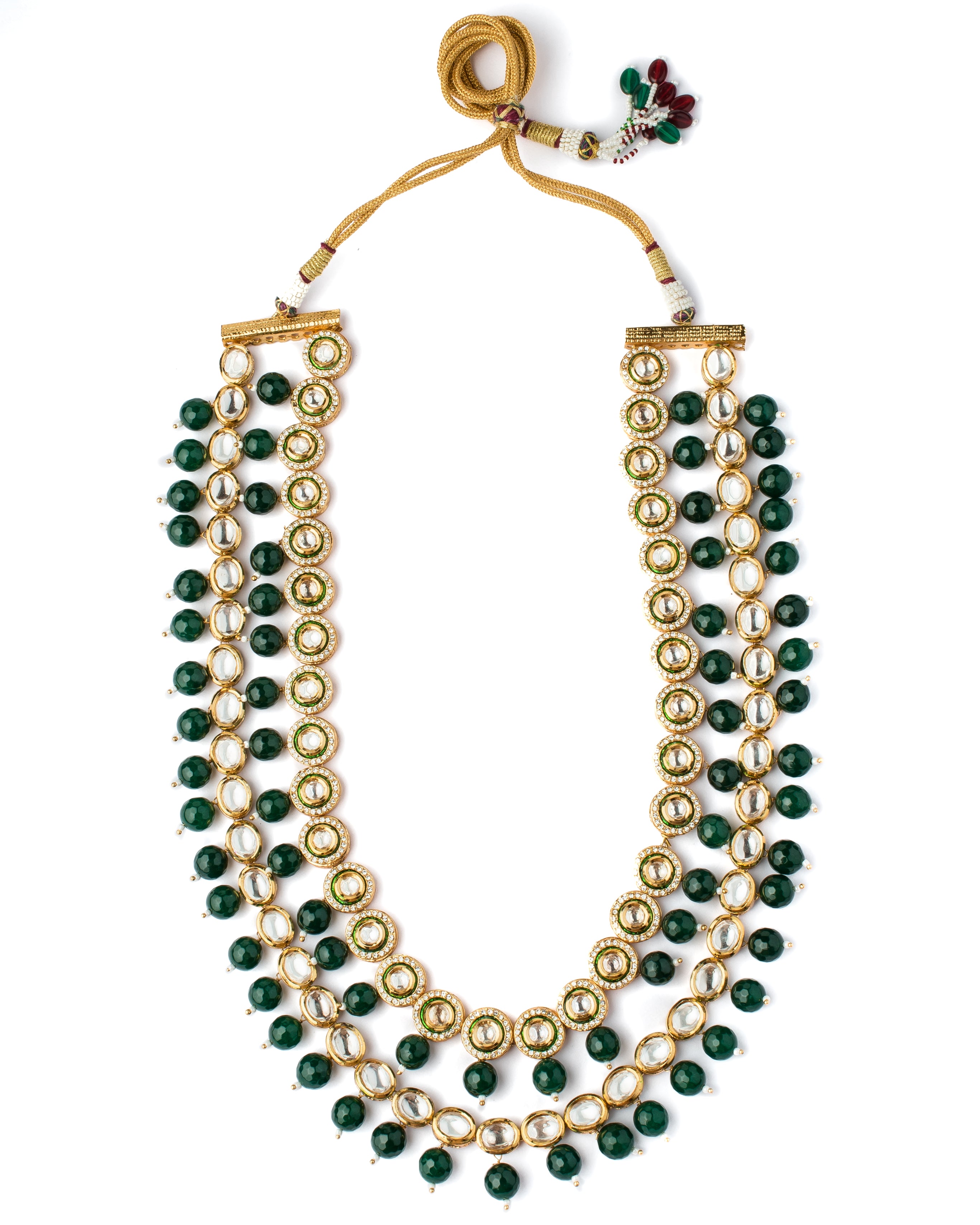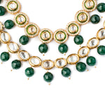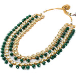 Exquisite multi-layered necklace featuring dazzling Kundan stones, vibrant green beads & intricate gold-tone detailing, perfect for special occasions & traditional attire. Elegant & timeless design.