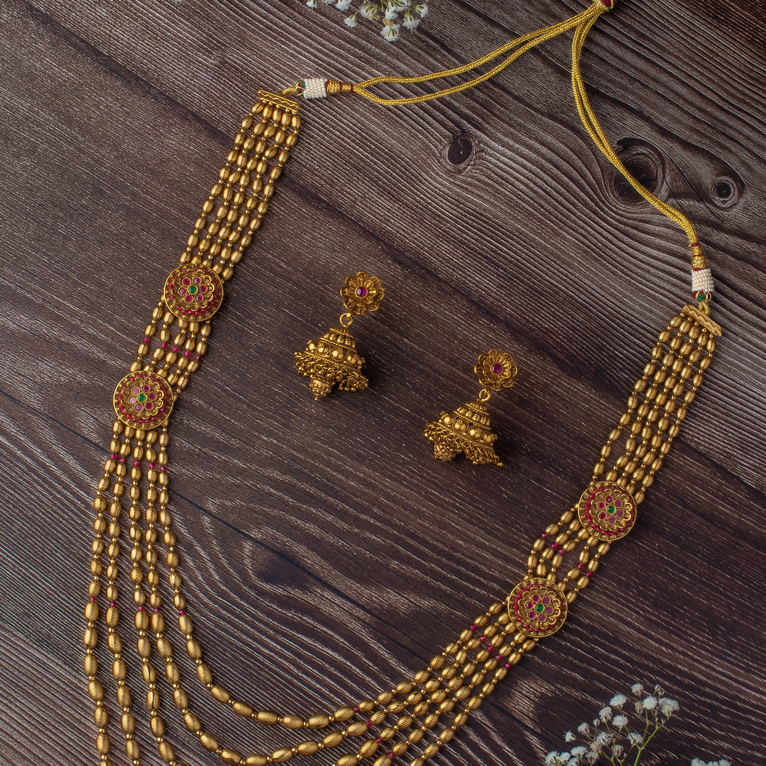 Isvaraah Gold Plated Womens Temple Long Necklace Set with Pair of Earrings (Freesize)