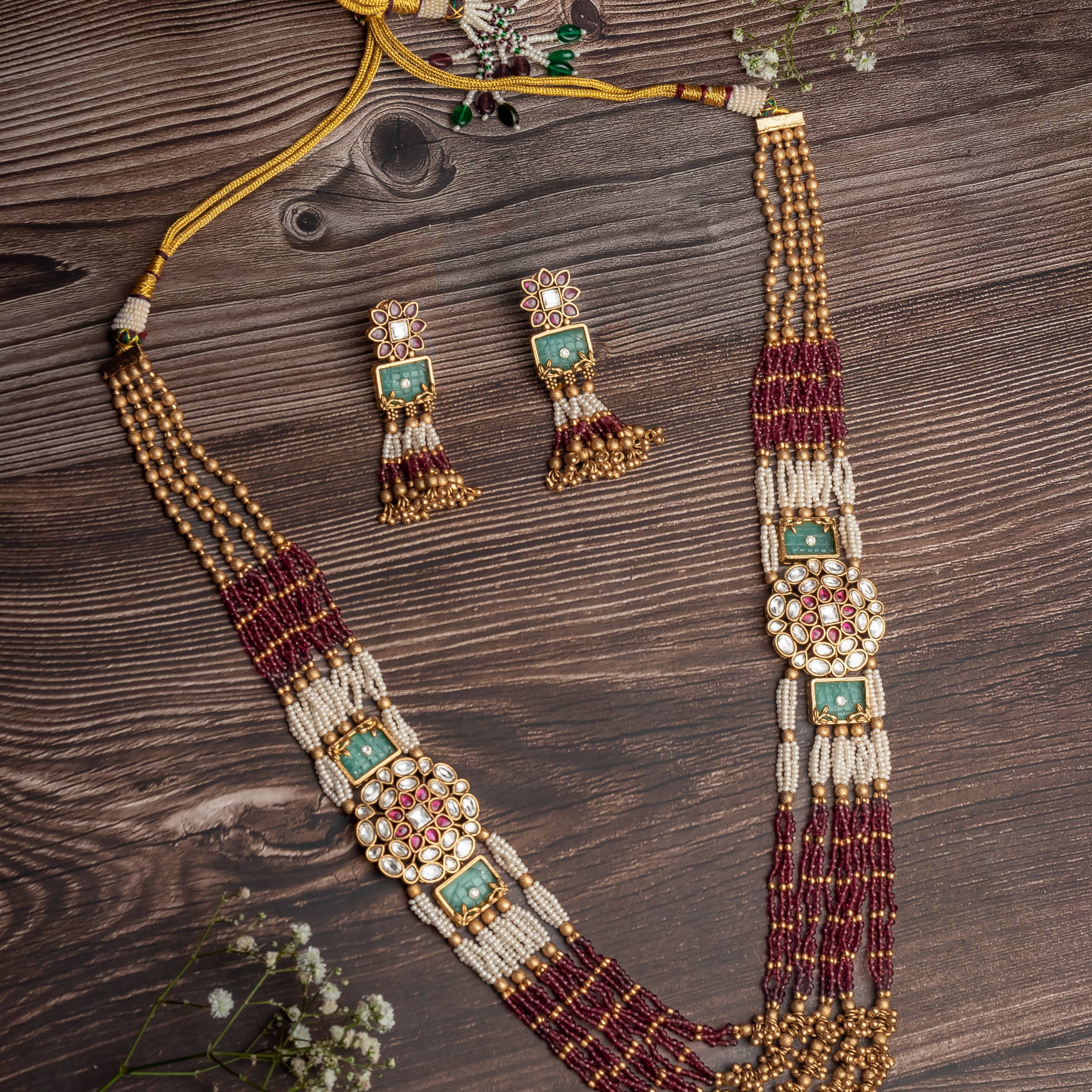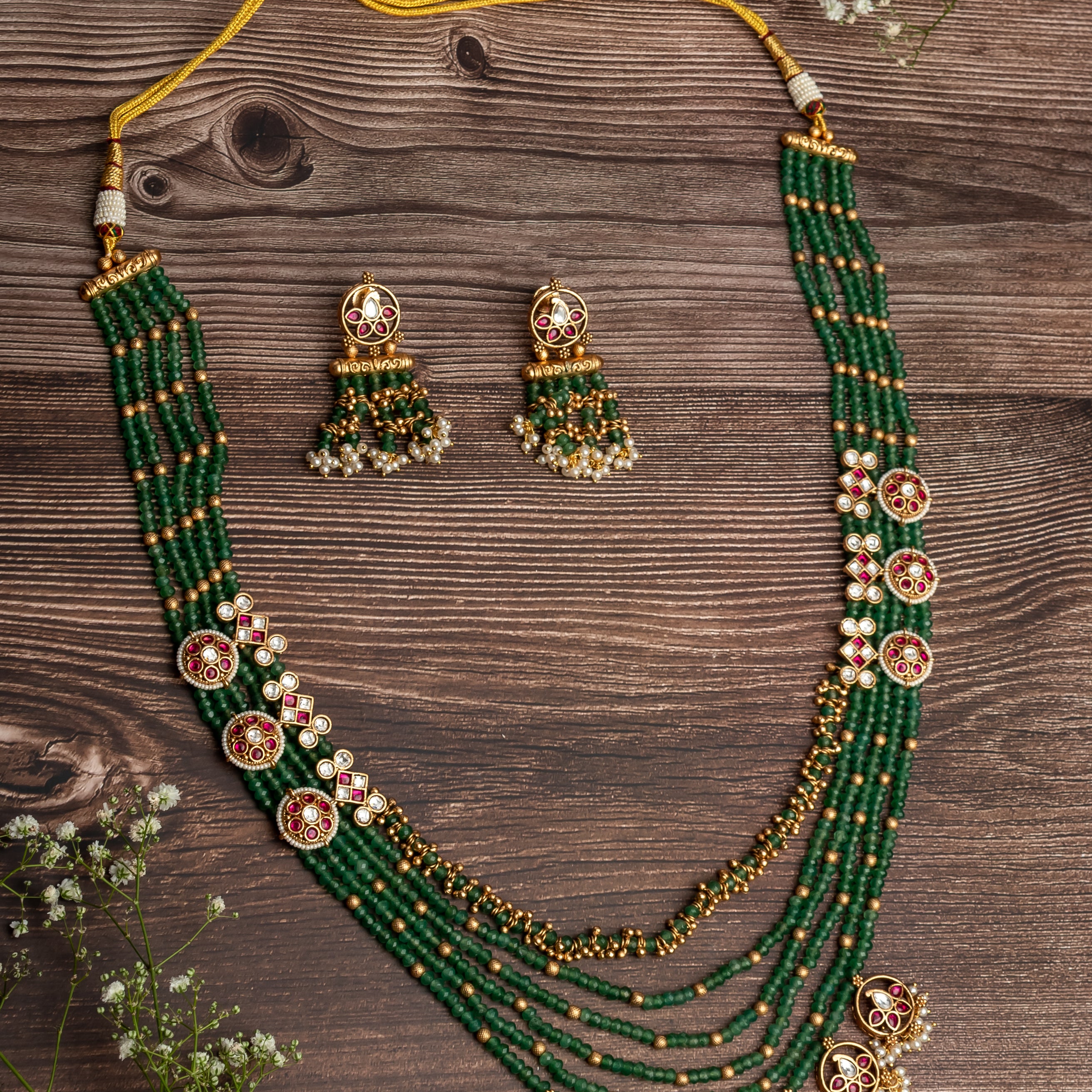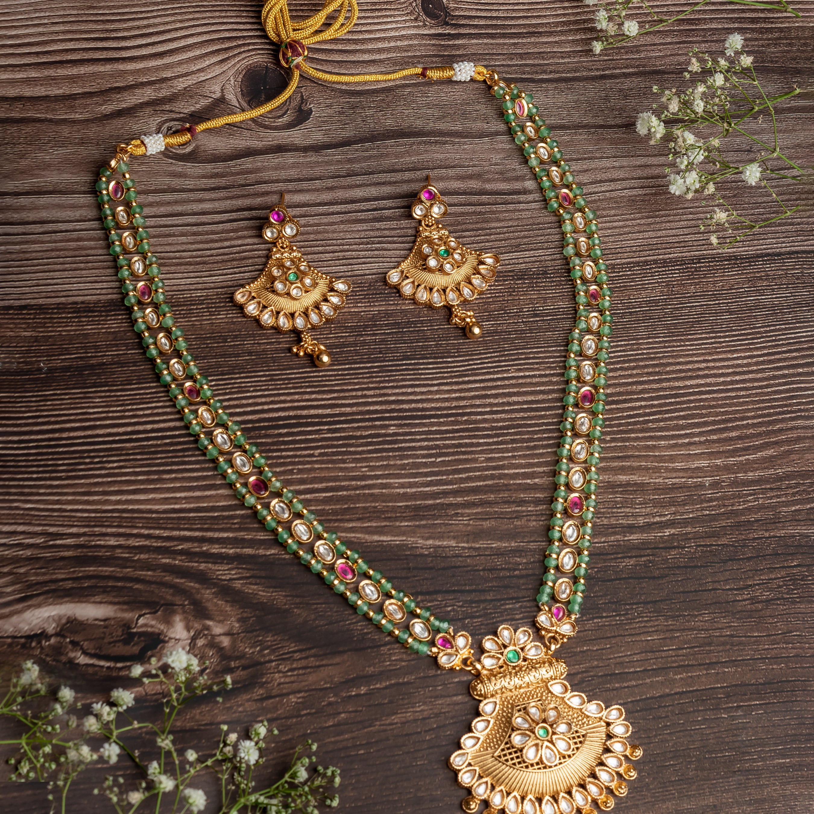 Isvaraah 2.0 Gold Plated Green Long Necklace Set with Pair of Earrings
