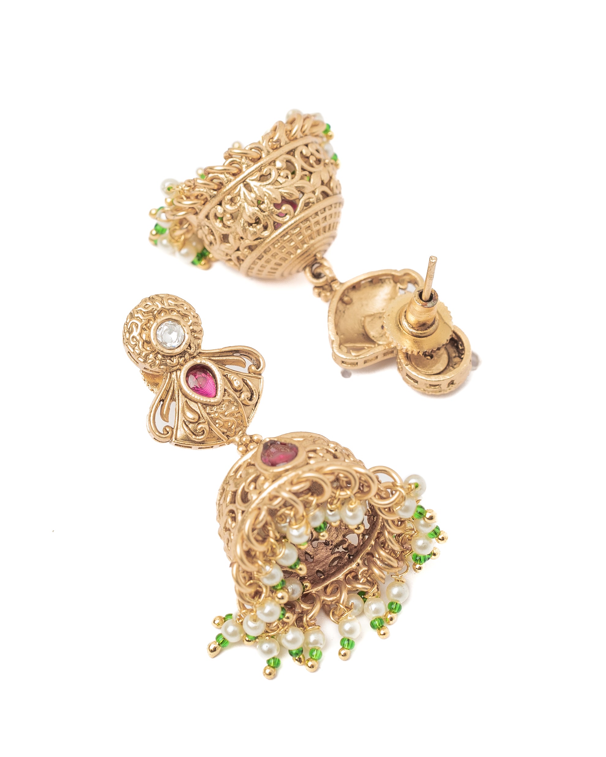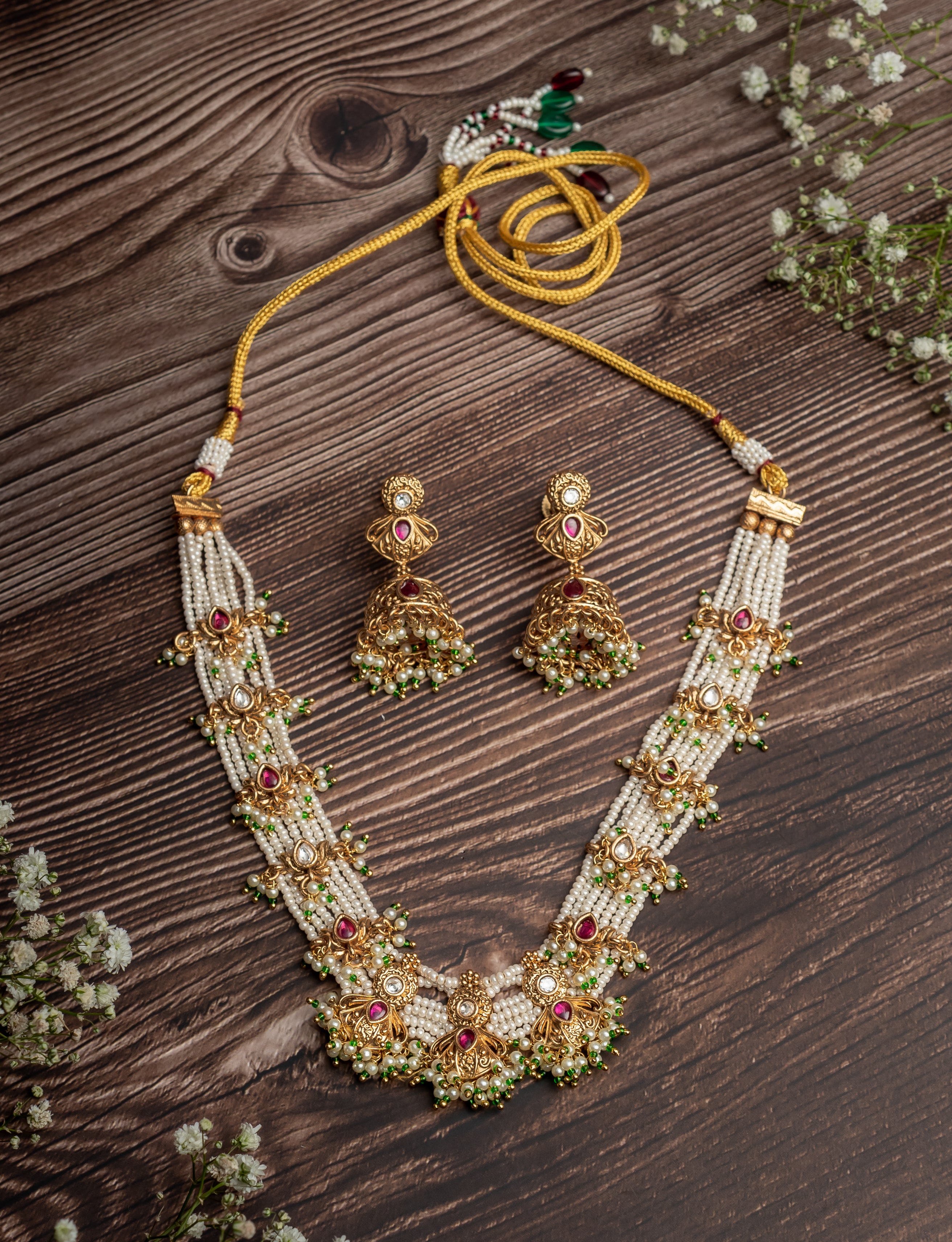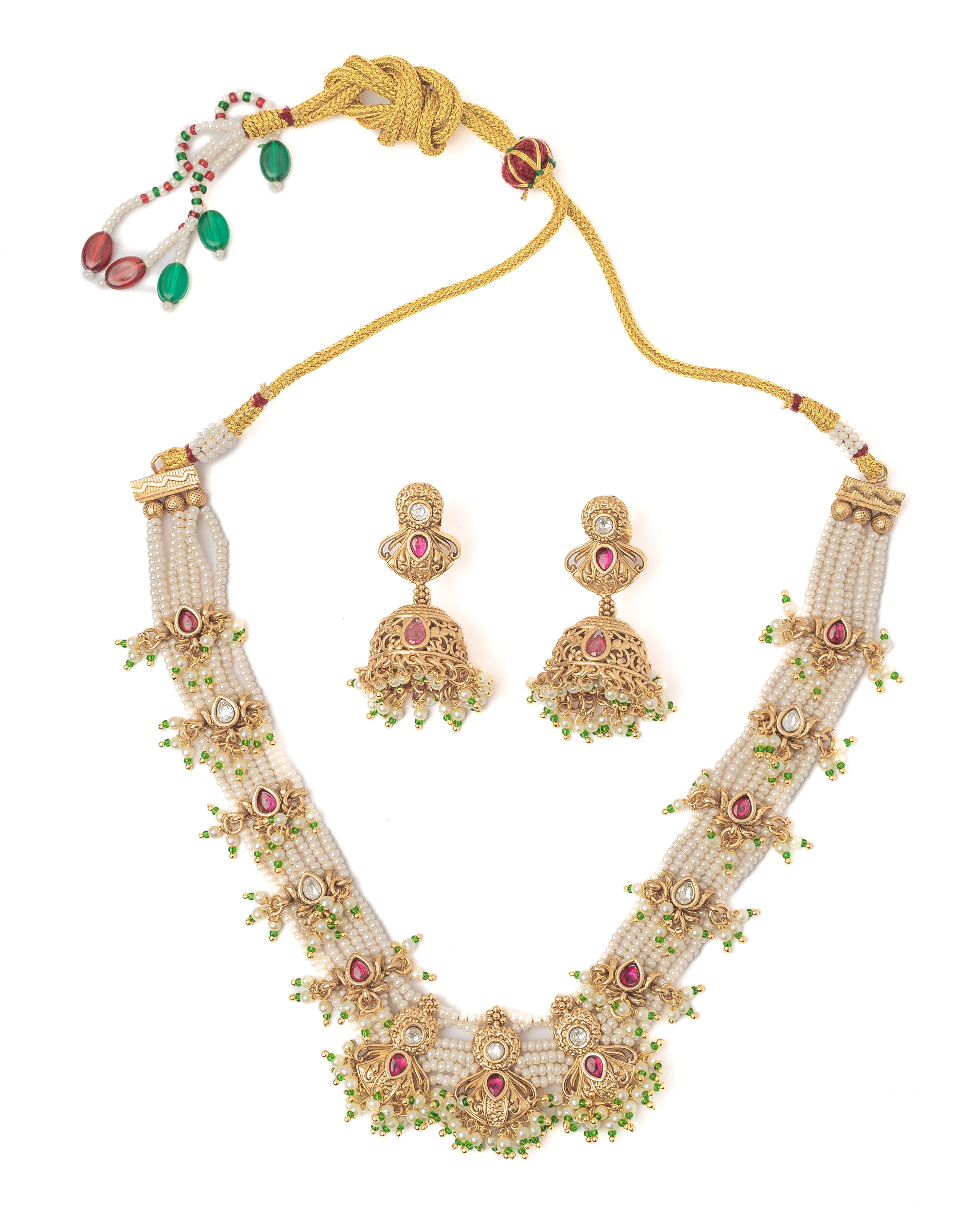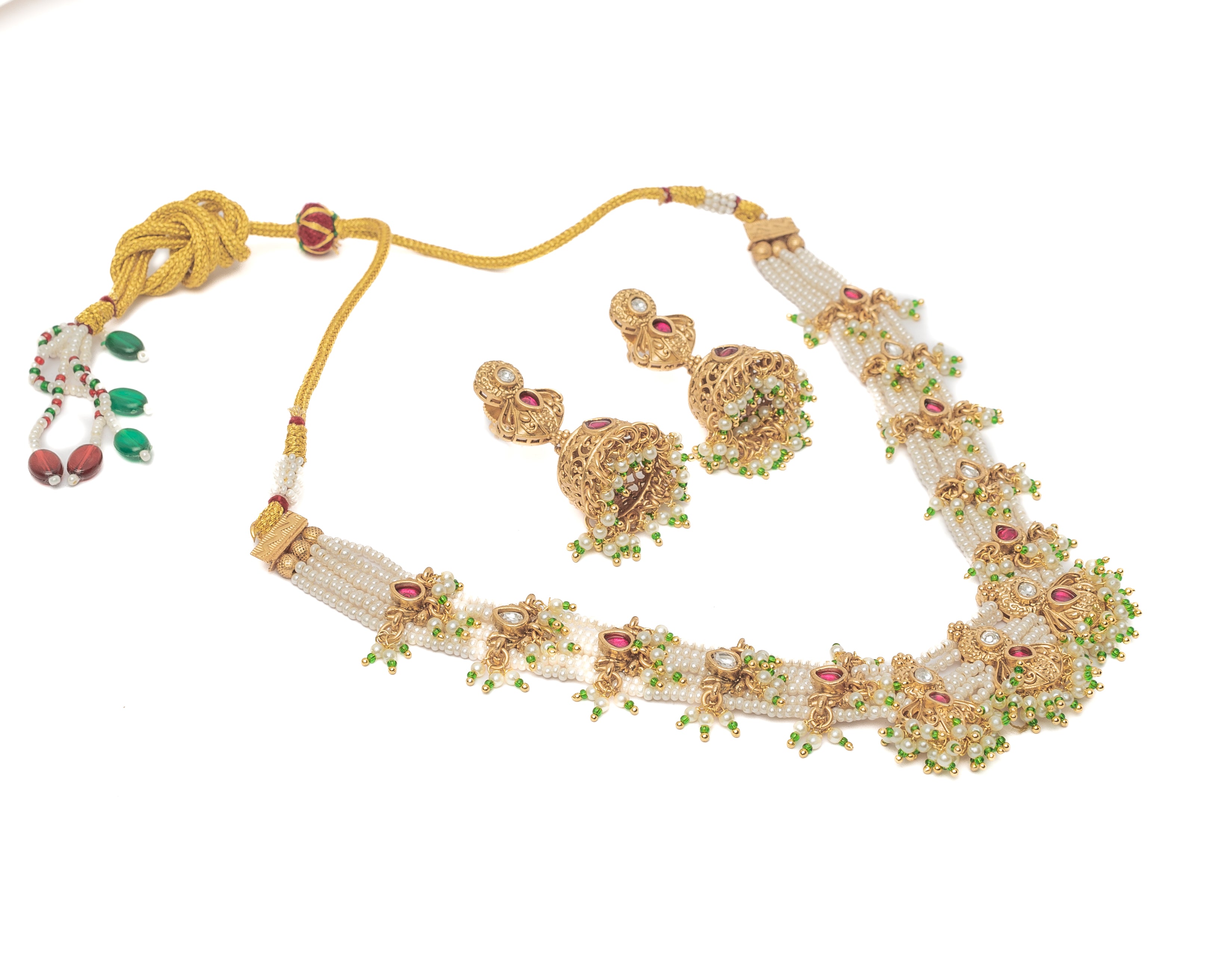 - Elegant Design: Features a pearl-adorned necklace and matching earrings with intricate craftsmanship.