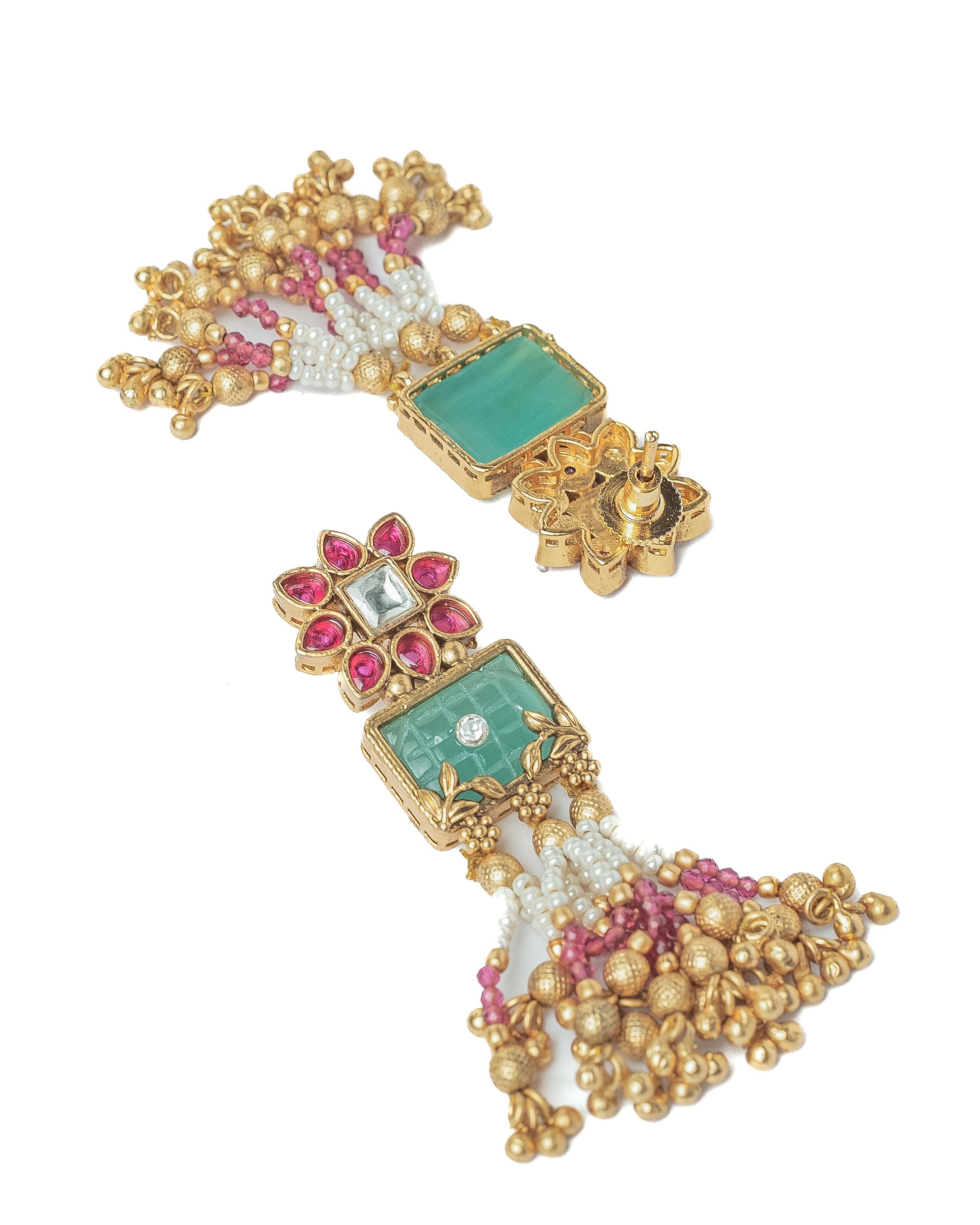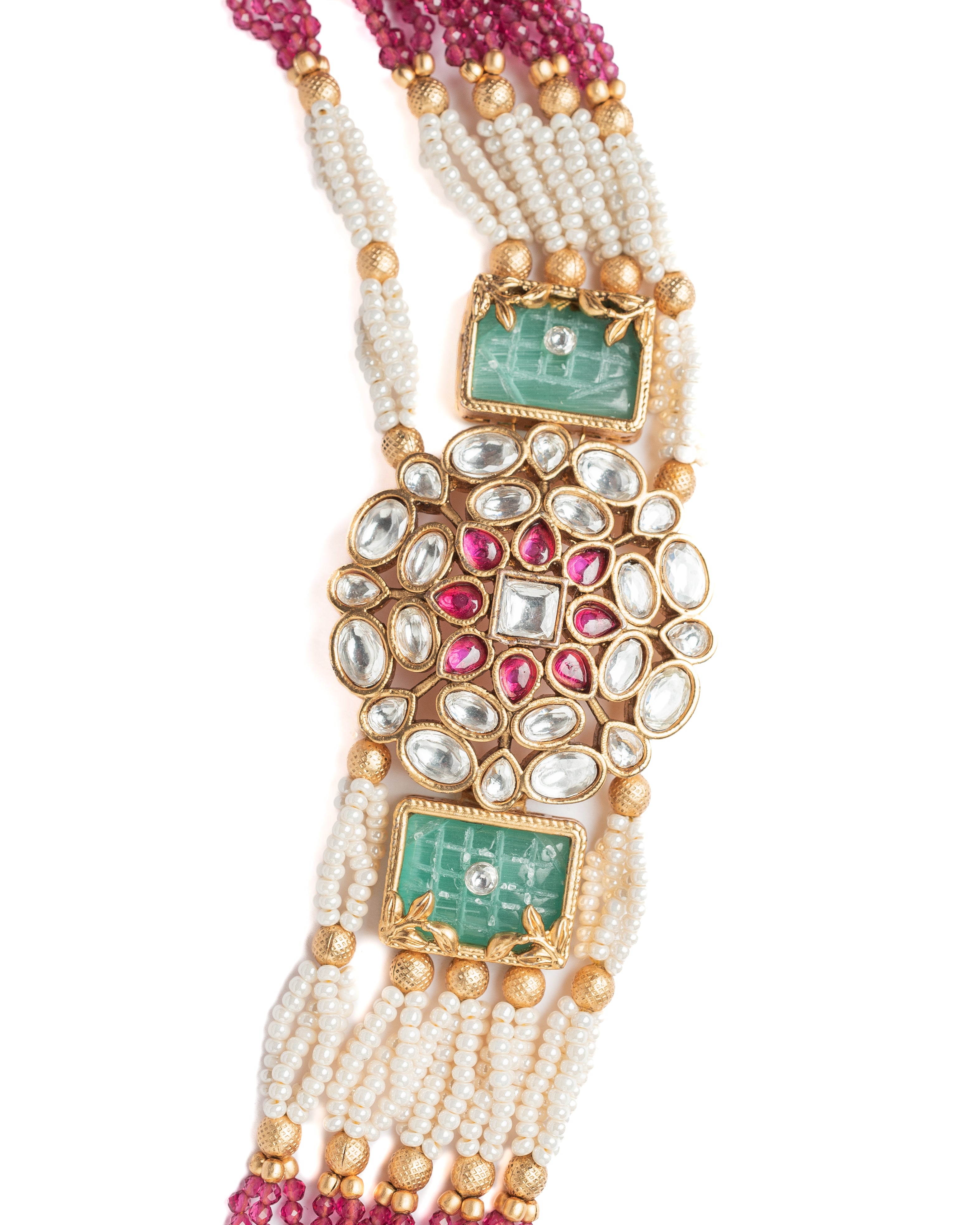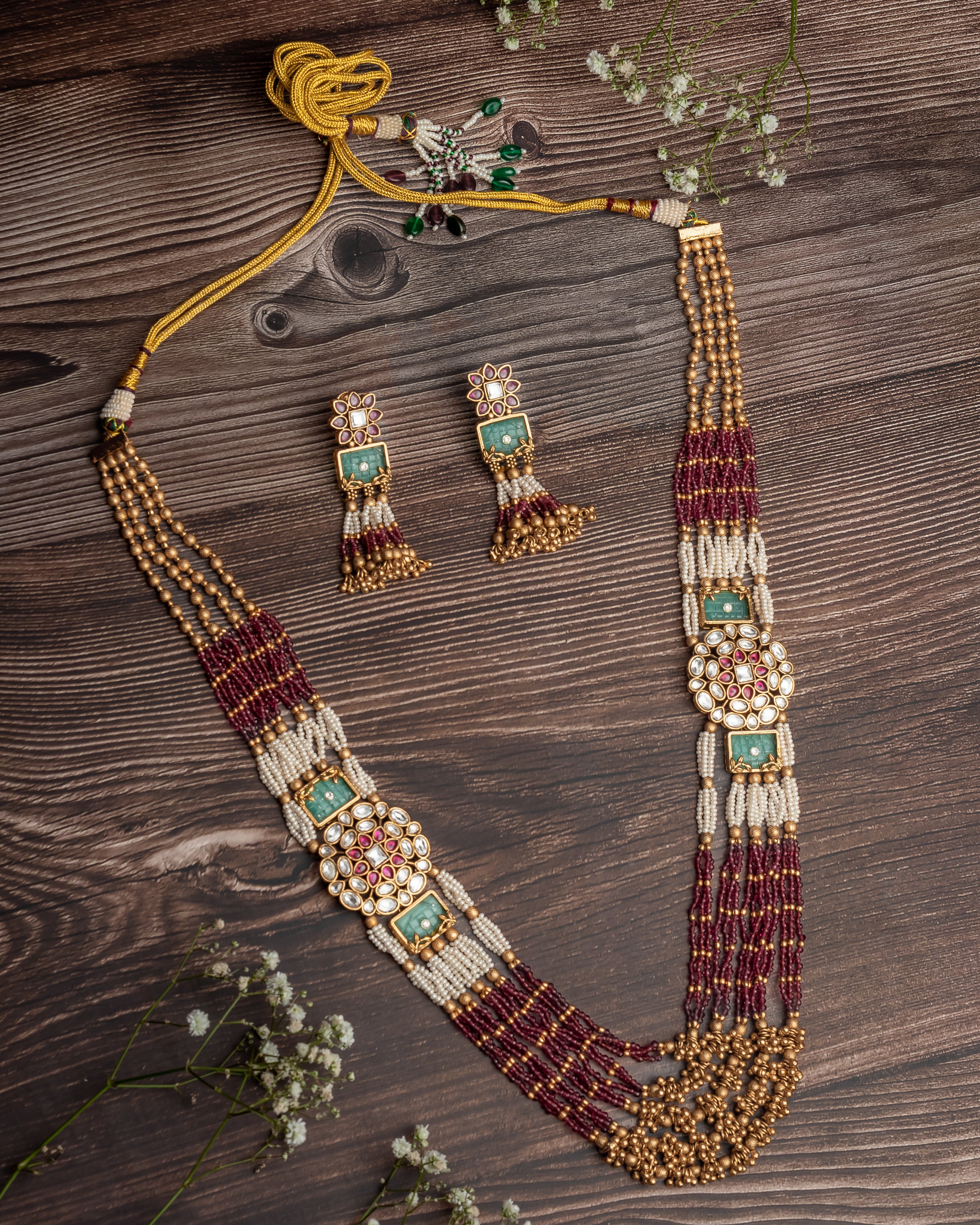 This exquisite set features a layered necklace with maroon and green beads, adorned with floral motifs and pearls, complemented by matching jhumka earrings. A graceful choice for traditional celebrations.