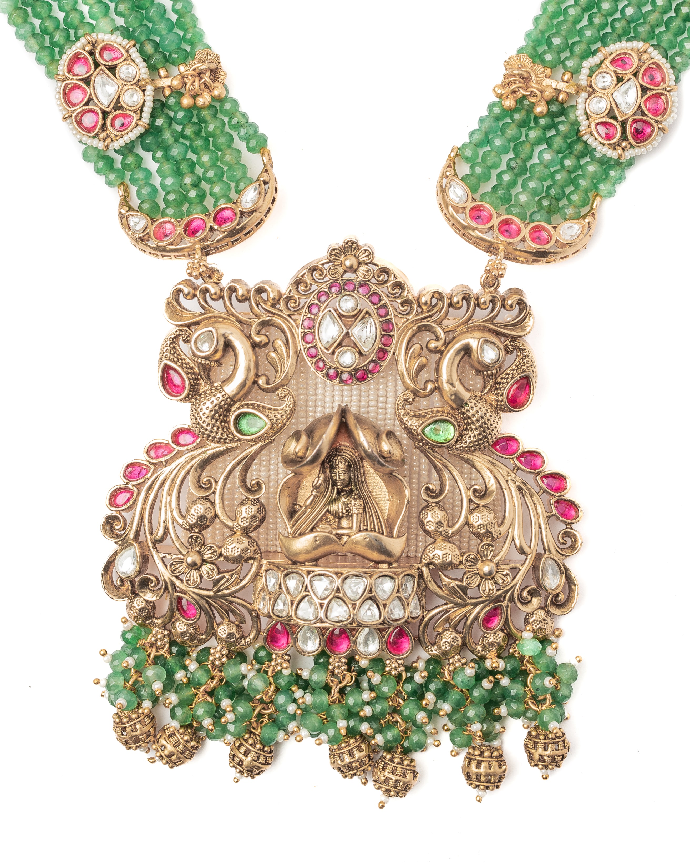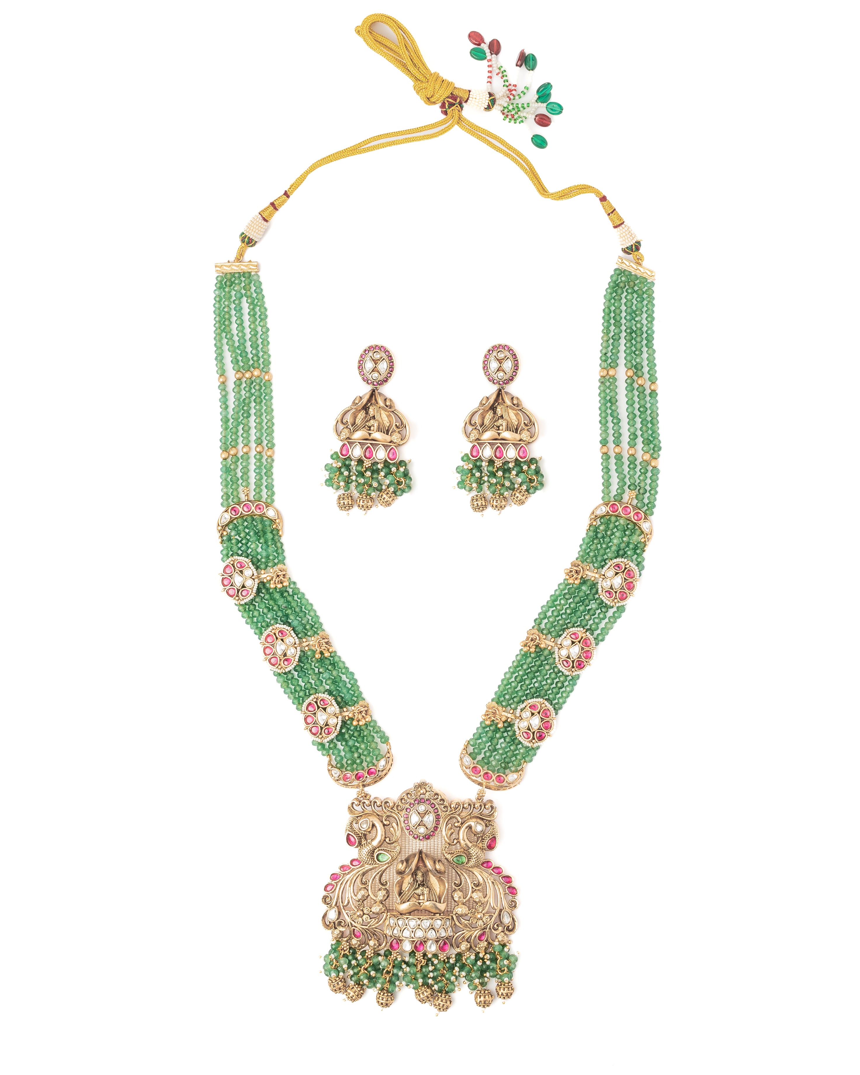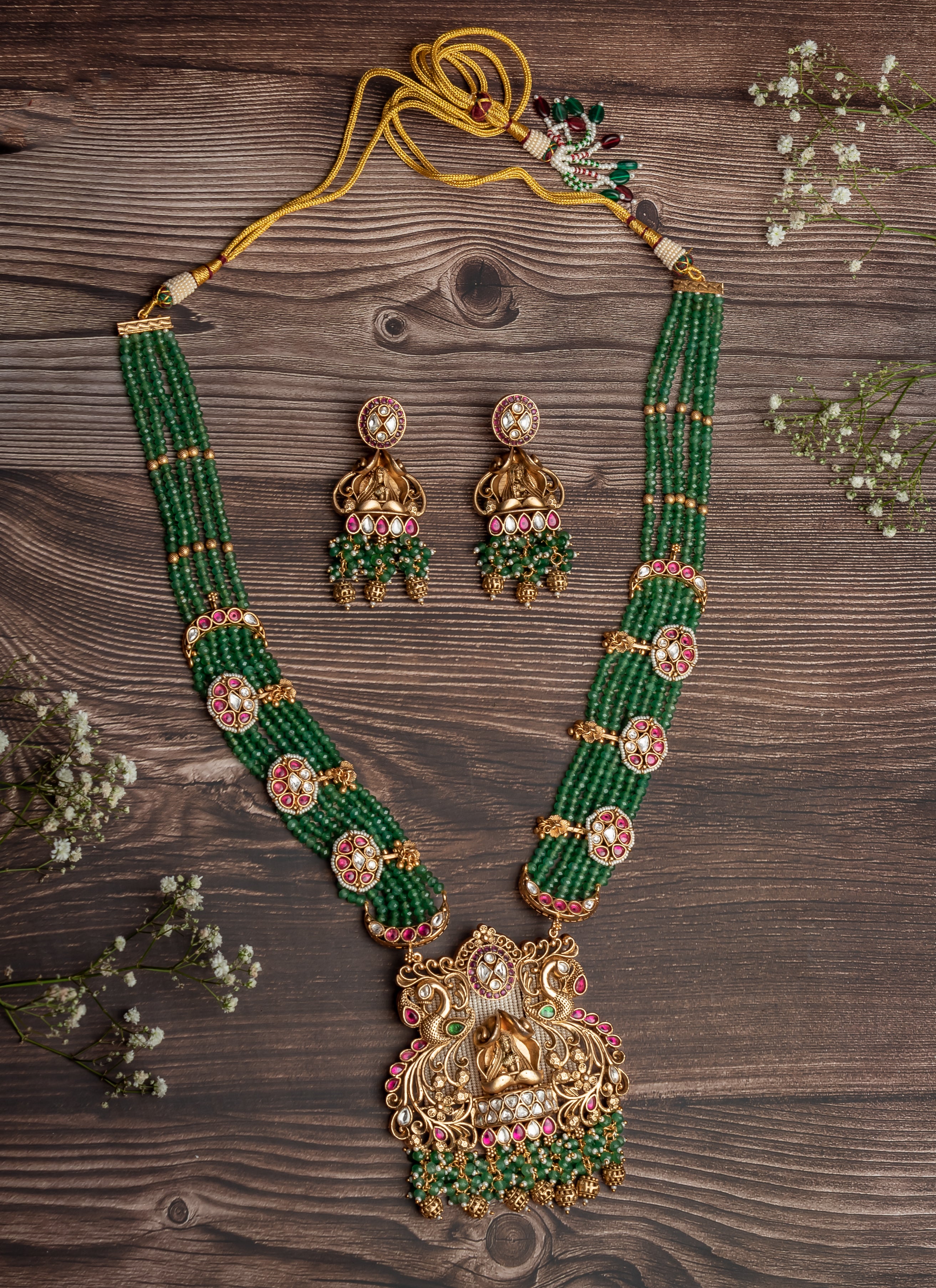 A traditional necklace set with layered green beads, floral gold accents, and a divine pendant, paired with matching earrings. Perfect for weddings and festive occasions, exuding cultural elegance and grace.