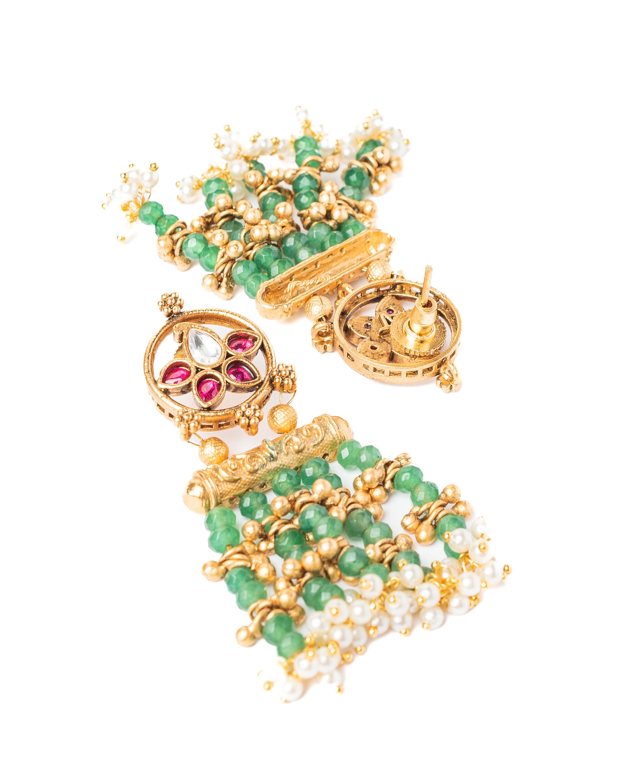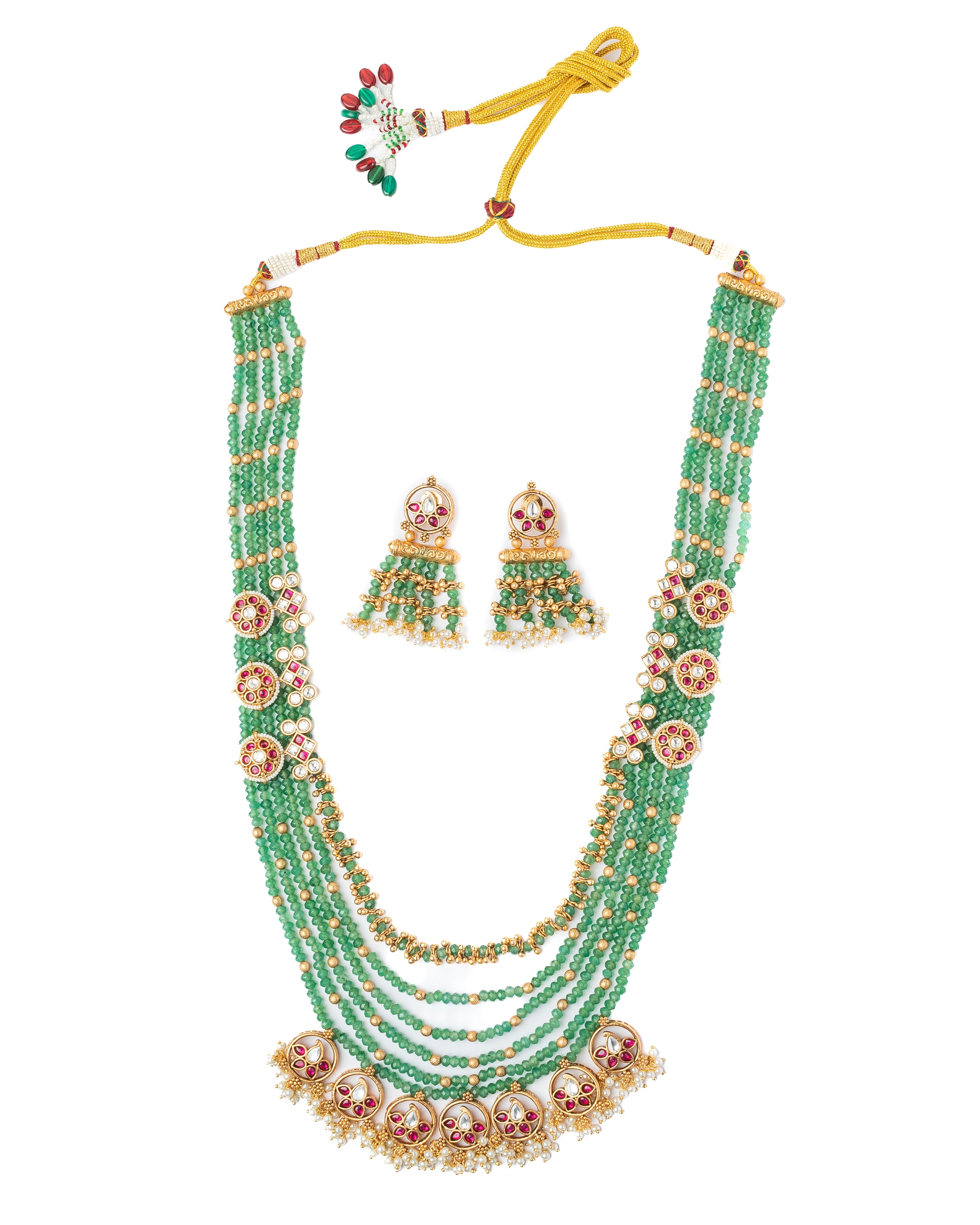 A stunning green beaded necklace with intricate gold and gemstone accents, paired with matching chandelier earrings. Perfect for traditional or festive occasions, blending elegance with cultural charm.