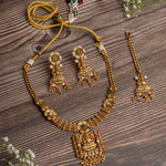 Elevate your festive look with this exquisite traditional jewelry set, featuring a stunning necklace, matching earrings, and a maang tikka. Adorned with intricate golden designs and colorful accents, it's perfect for weddings and celebrations.