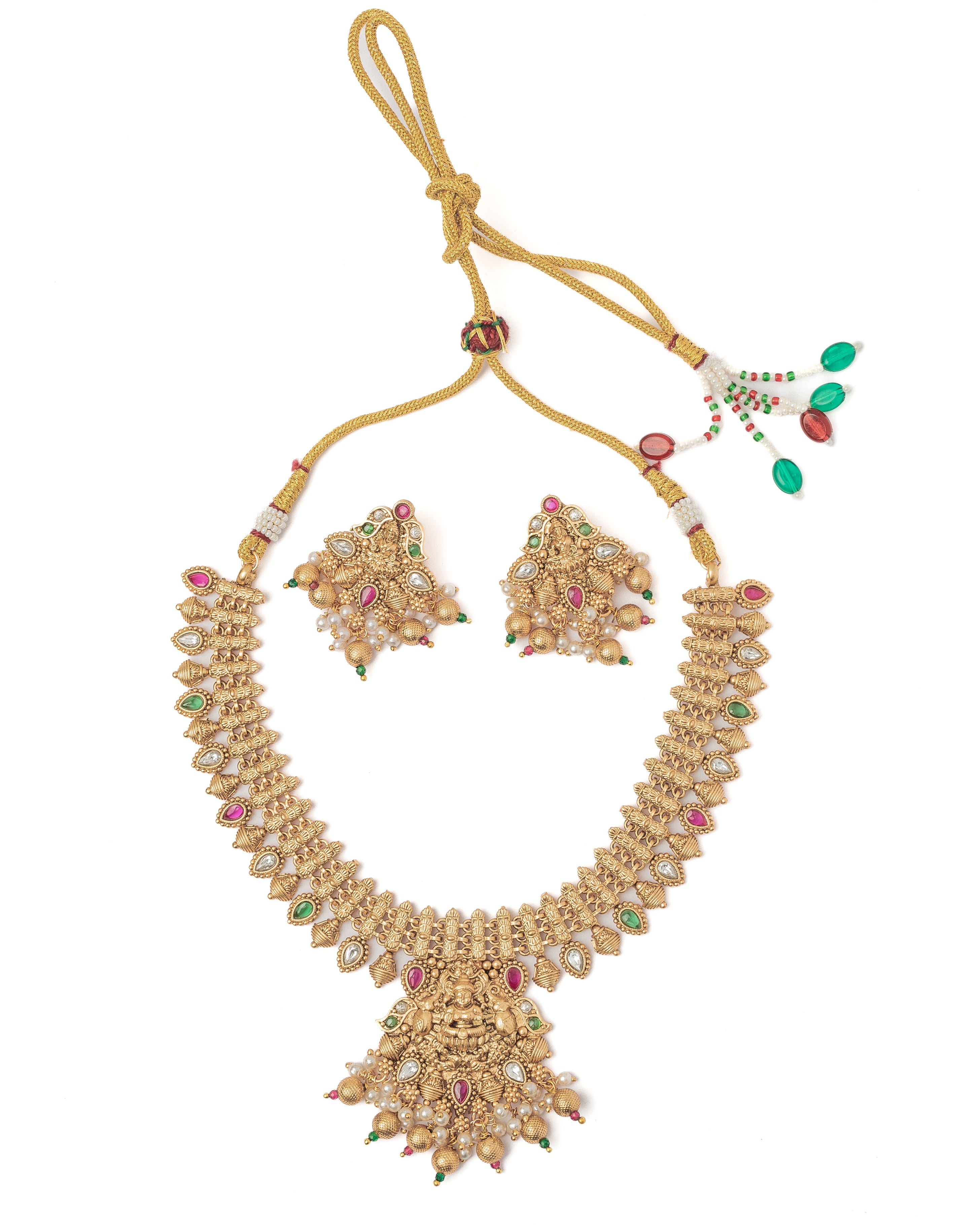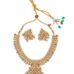 Enhance your elegance with this traditional jewelry set featuring a beautifully crafted necklace and matching earrings. Decorated with intricate golden details and vibrant accents, it's ideal for festive occasions and weddings.