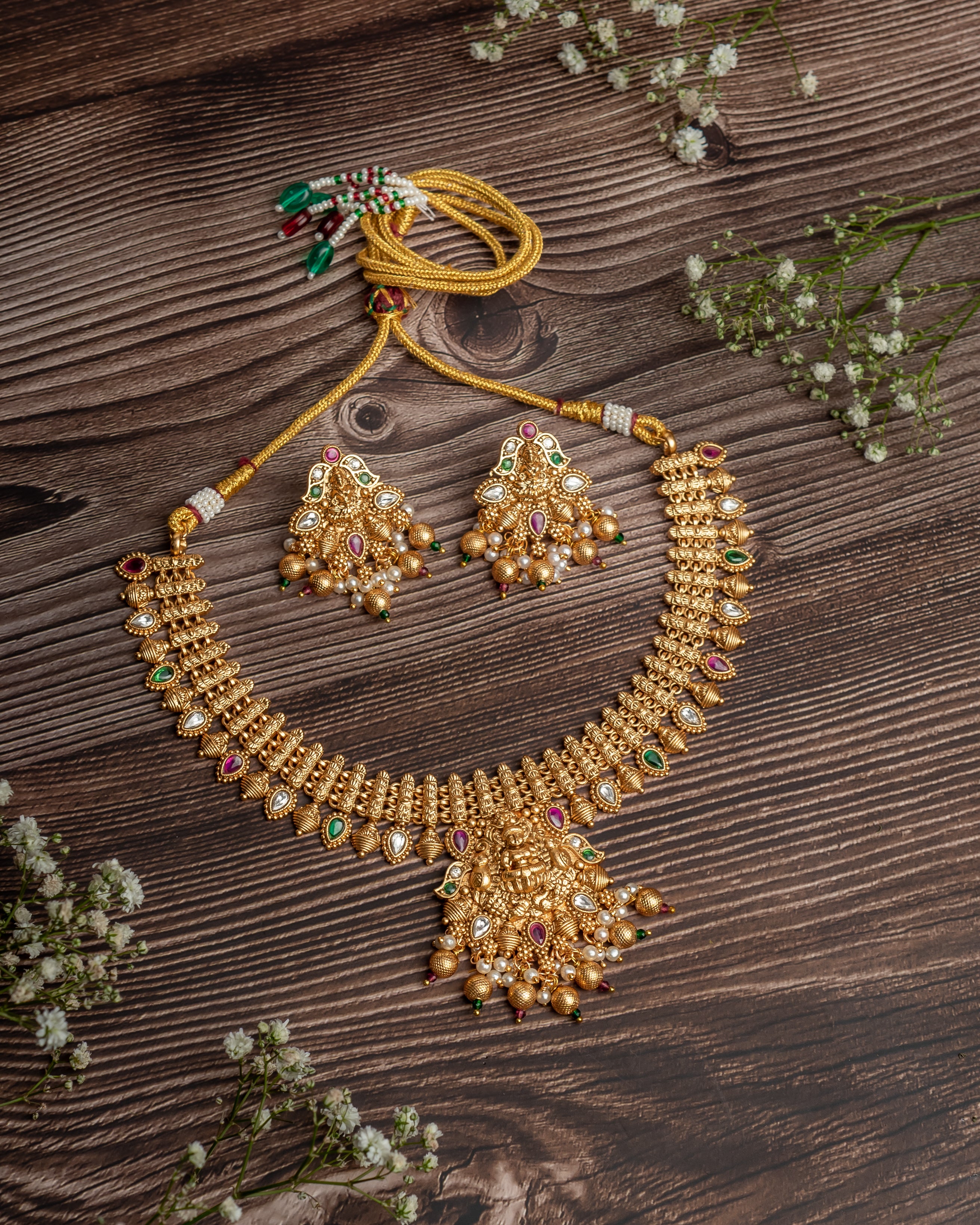 - Traditional Elegance: Features a stunning necklace and matching earrings with intricate golden designs, perfect for traditional events.