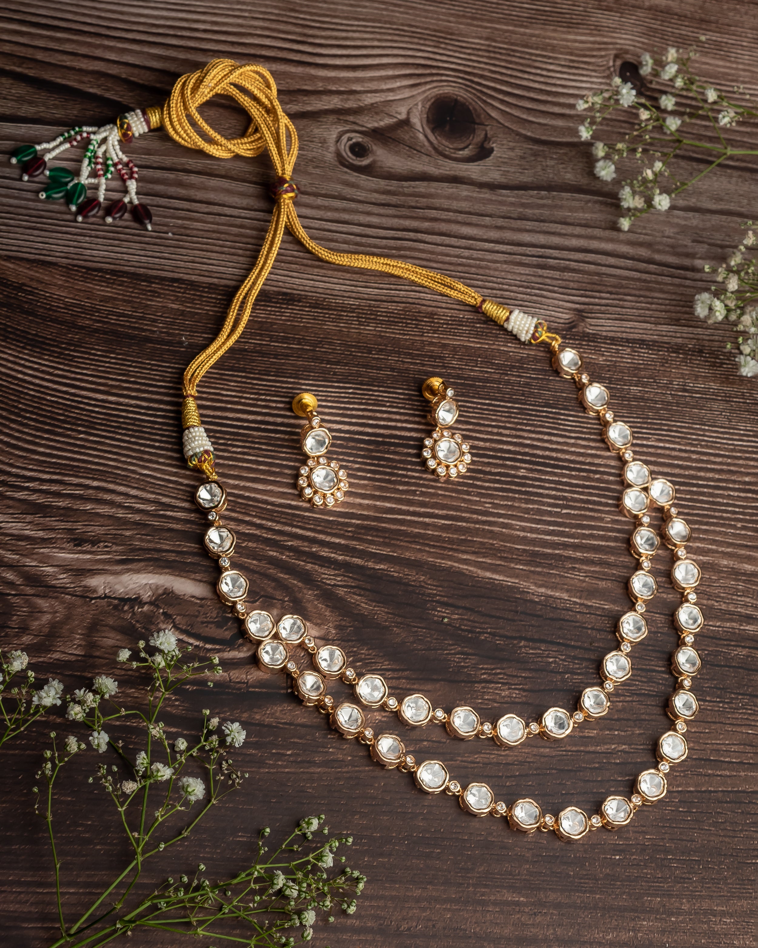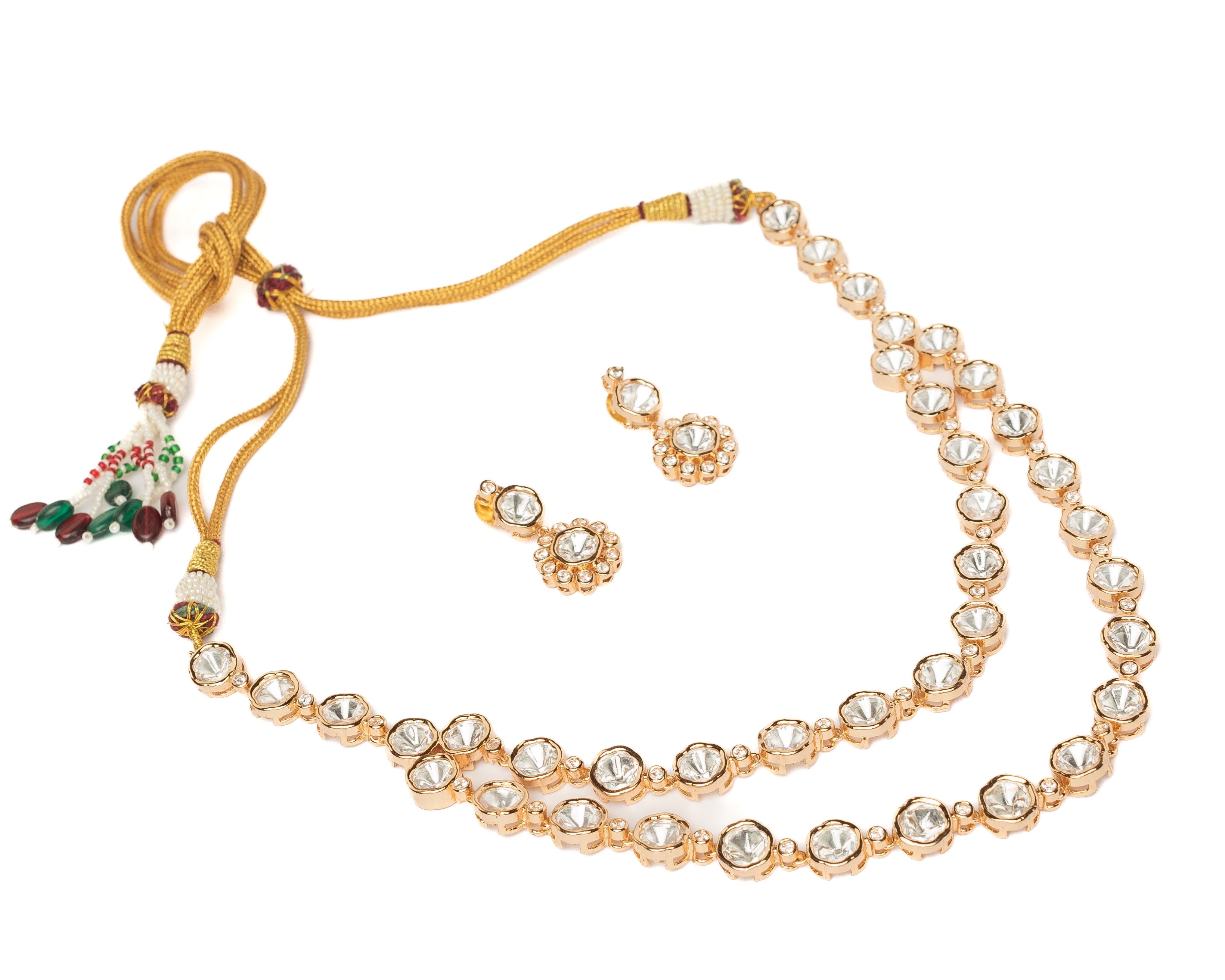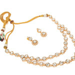 This elegant double-layered necklace set features shimmering white stones and a gold-toned finish. Paired with matching stud earrings, it is perfect for weddings, festive occasions, or traditional attire.