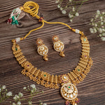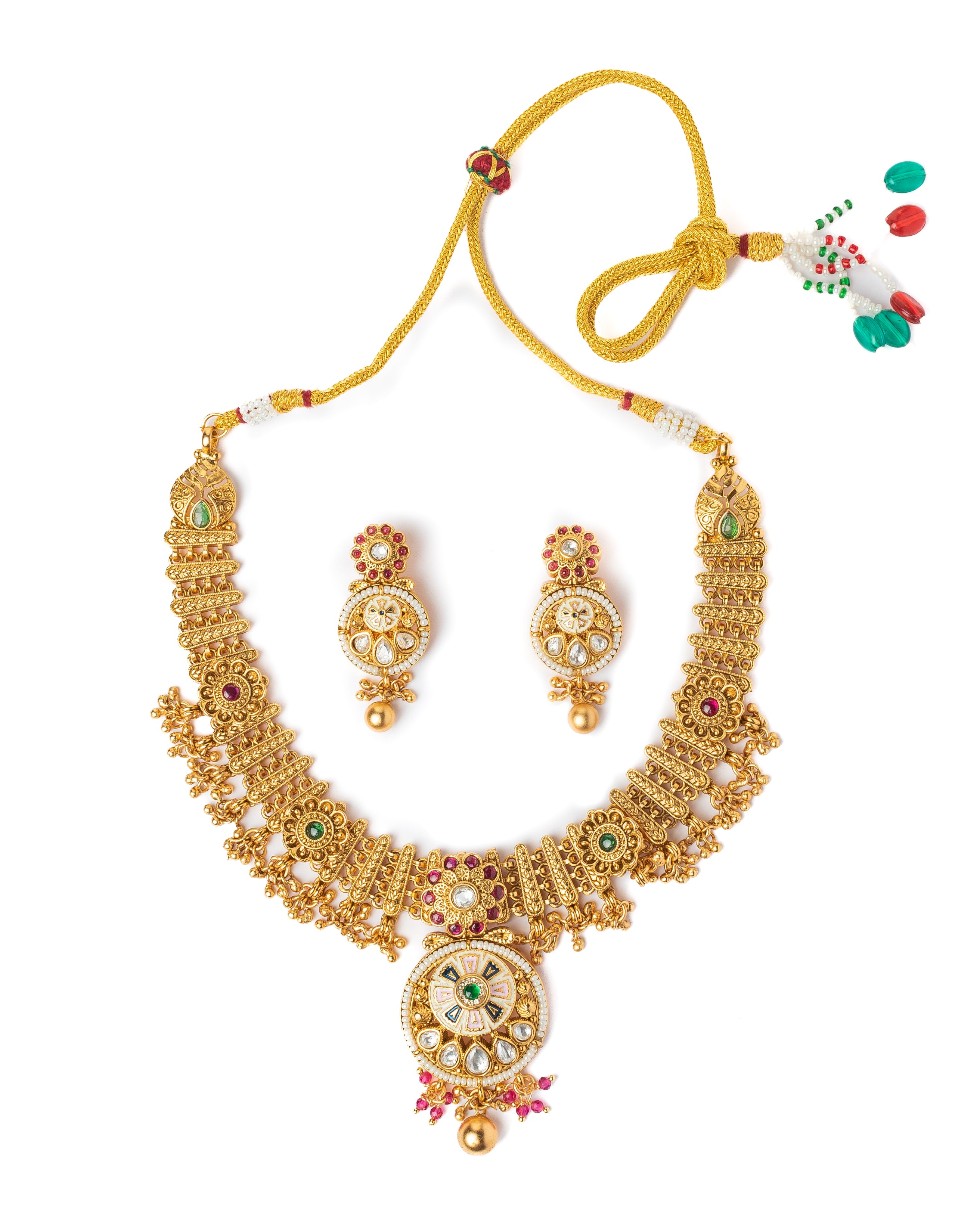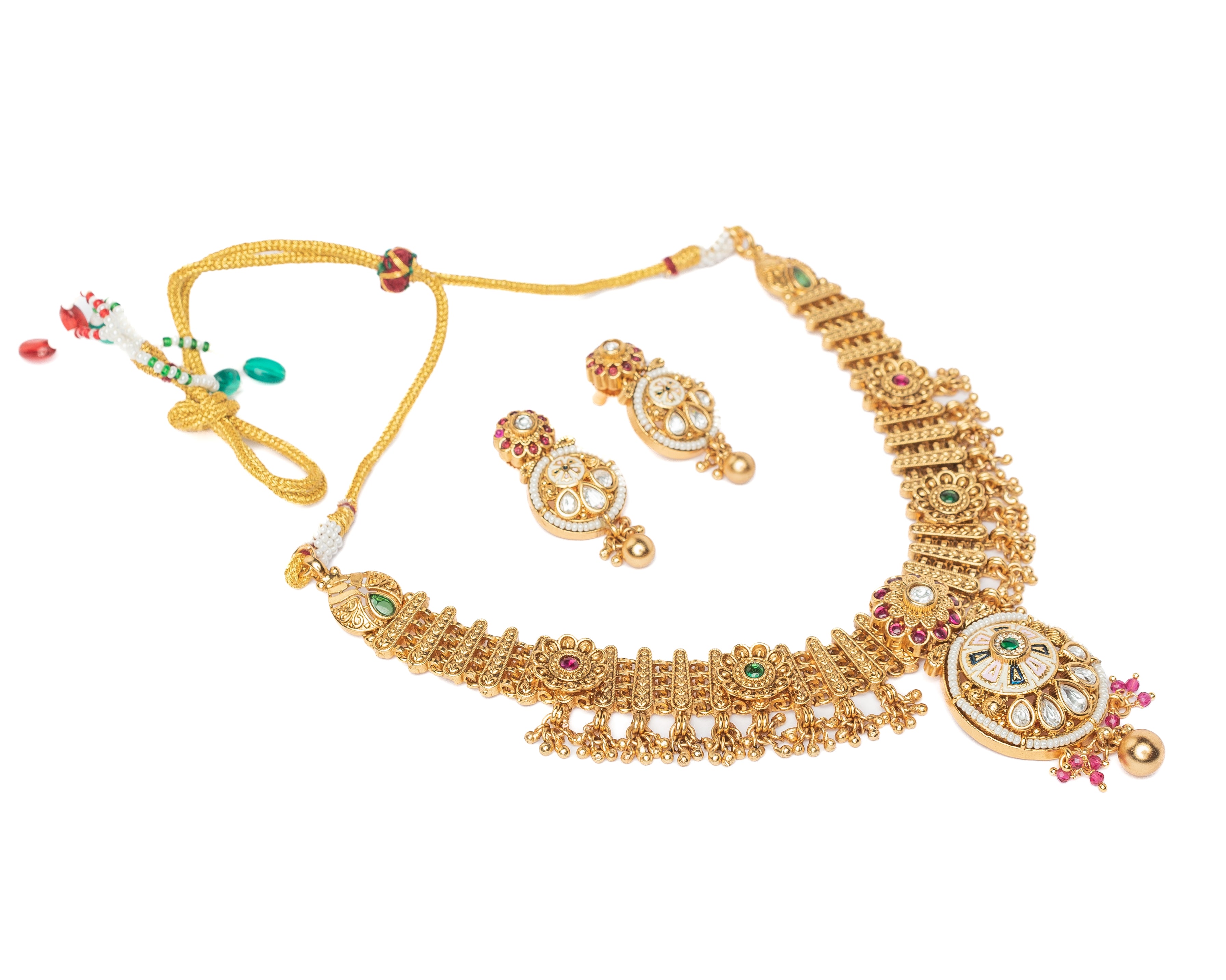This elegant jewelry set features a gold-plated necklace with intricate floral designs, green and pink stone accents, and a central pendant. Paired with matching earrings, it's perfect for traditional occasions.
