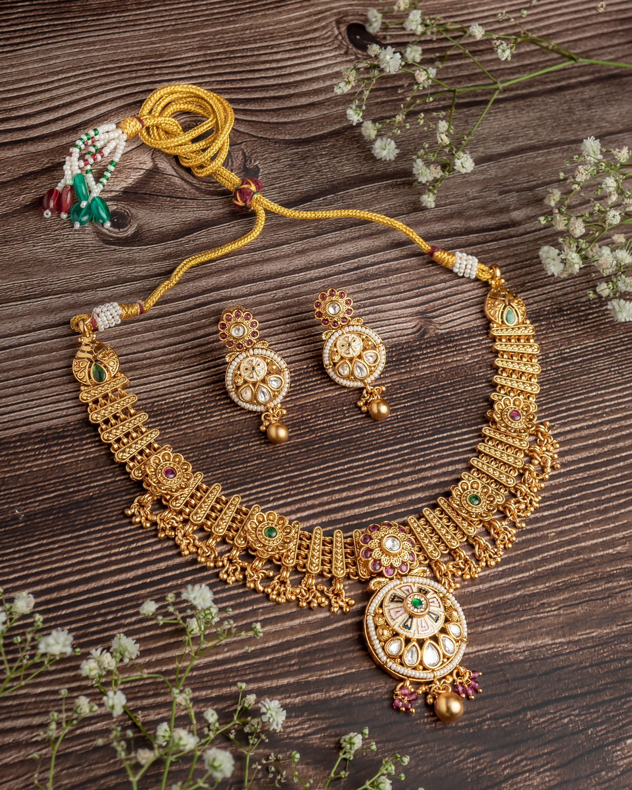 - Antique Gold Necklace Set: Features a stunning antique gold-plated necklace with matching earrings, ideal for a traditional look.