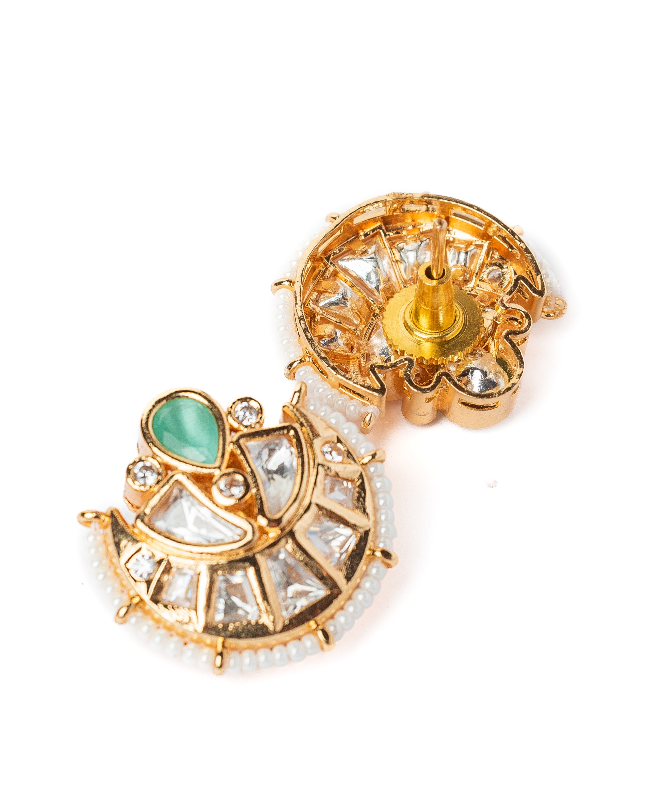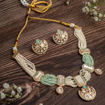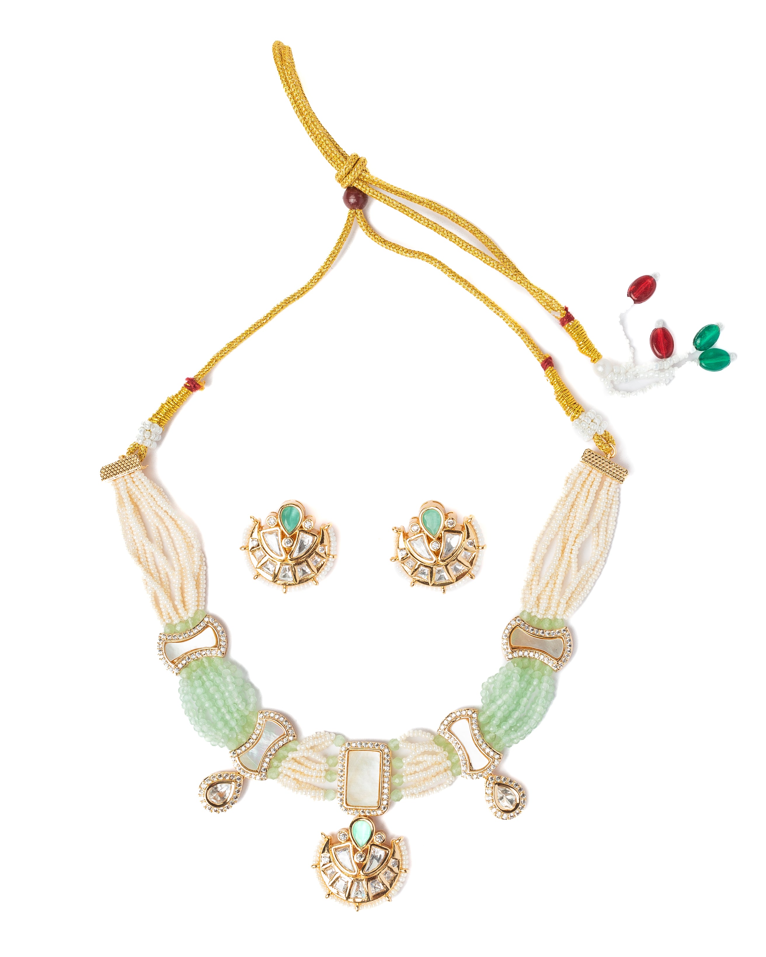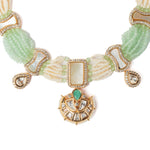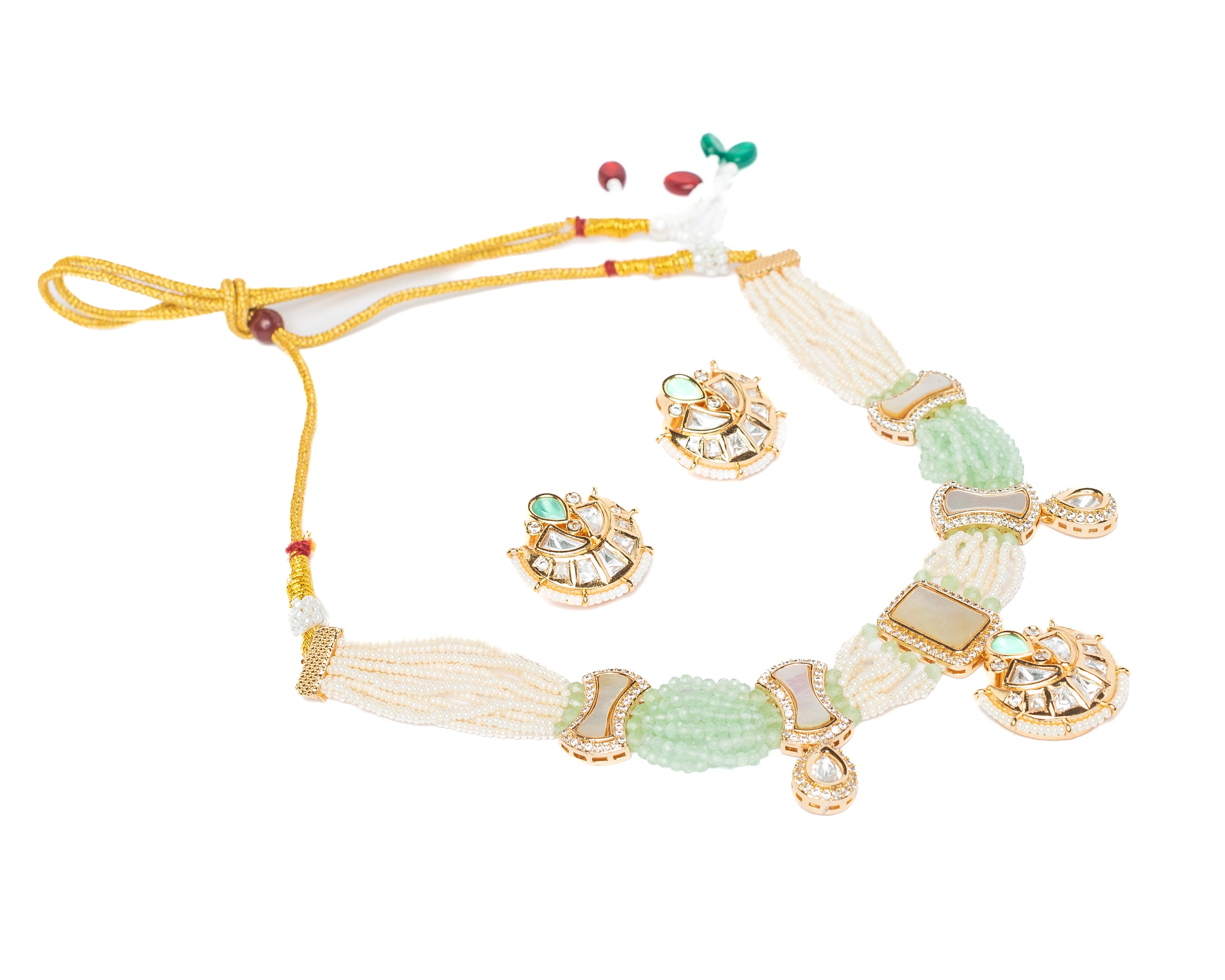 This elegant jewelry set features a stunning combination of pearls, green beads, and intricate gold accents. Perfect for weddings or festive occasions, it adds charm and sophistication to any outfit.