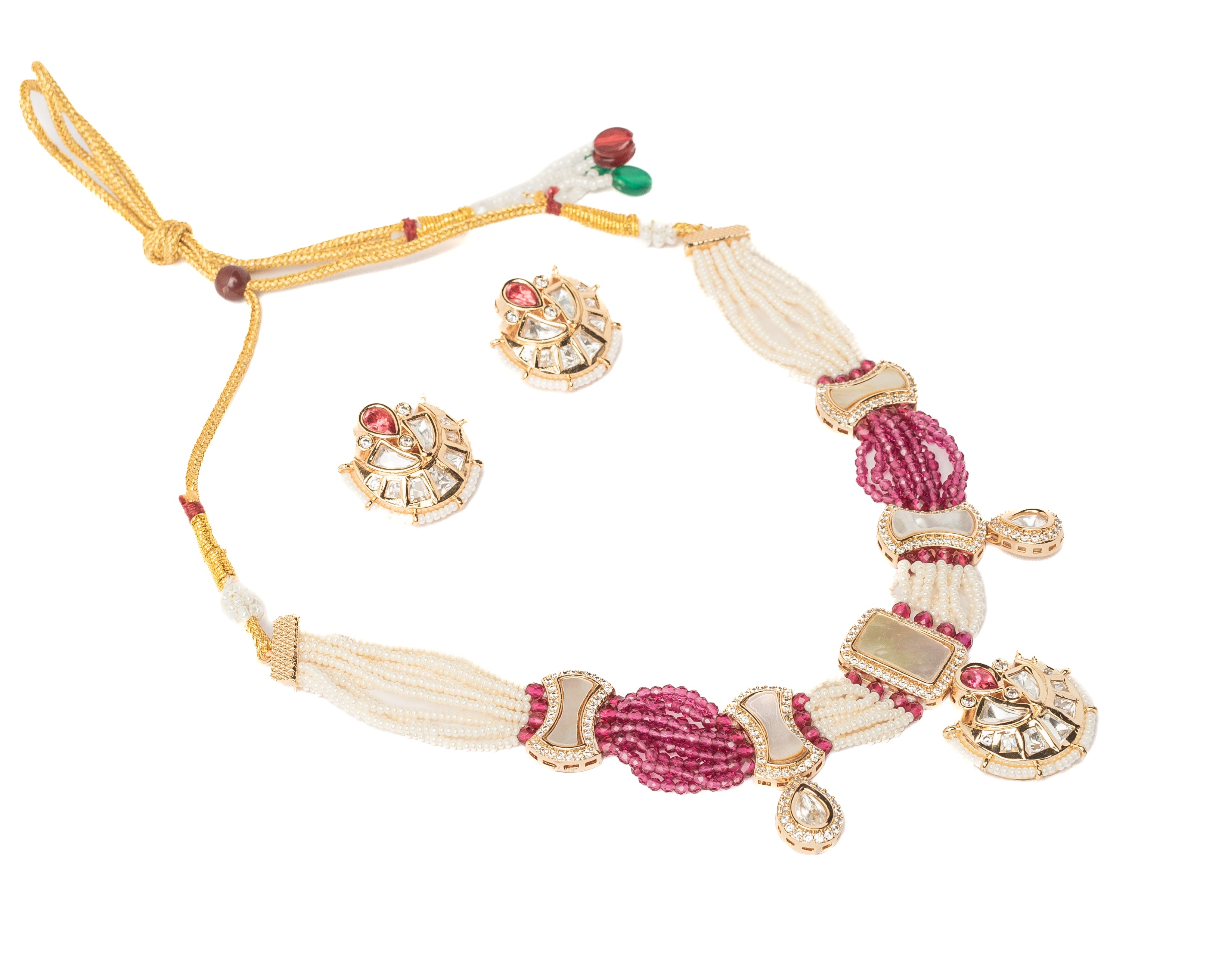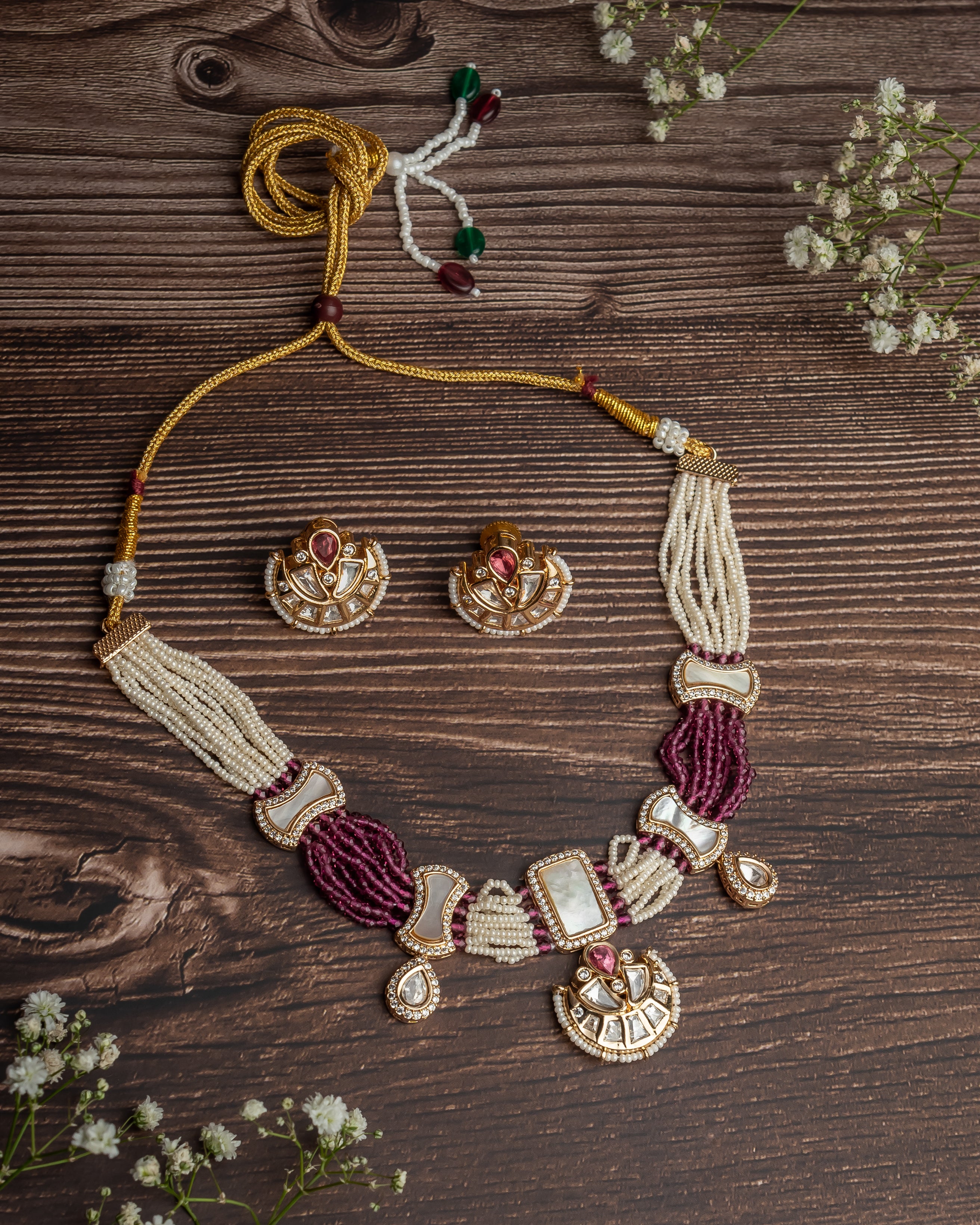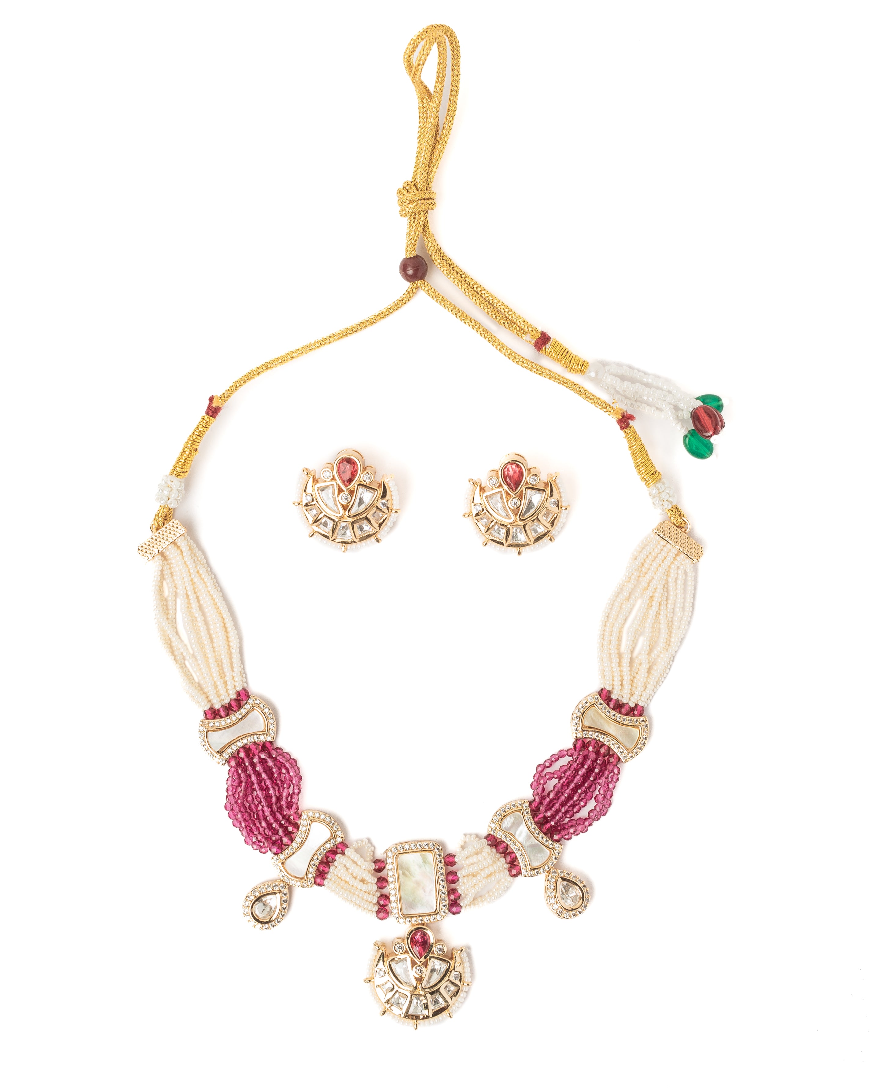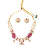 This exquisite jewelry set includes a pearl and maroon beaded necklace with gold-plated detailing and a central pendant. Paired with matching earrings, it's an ideal choice for adding elegance to festive attire.