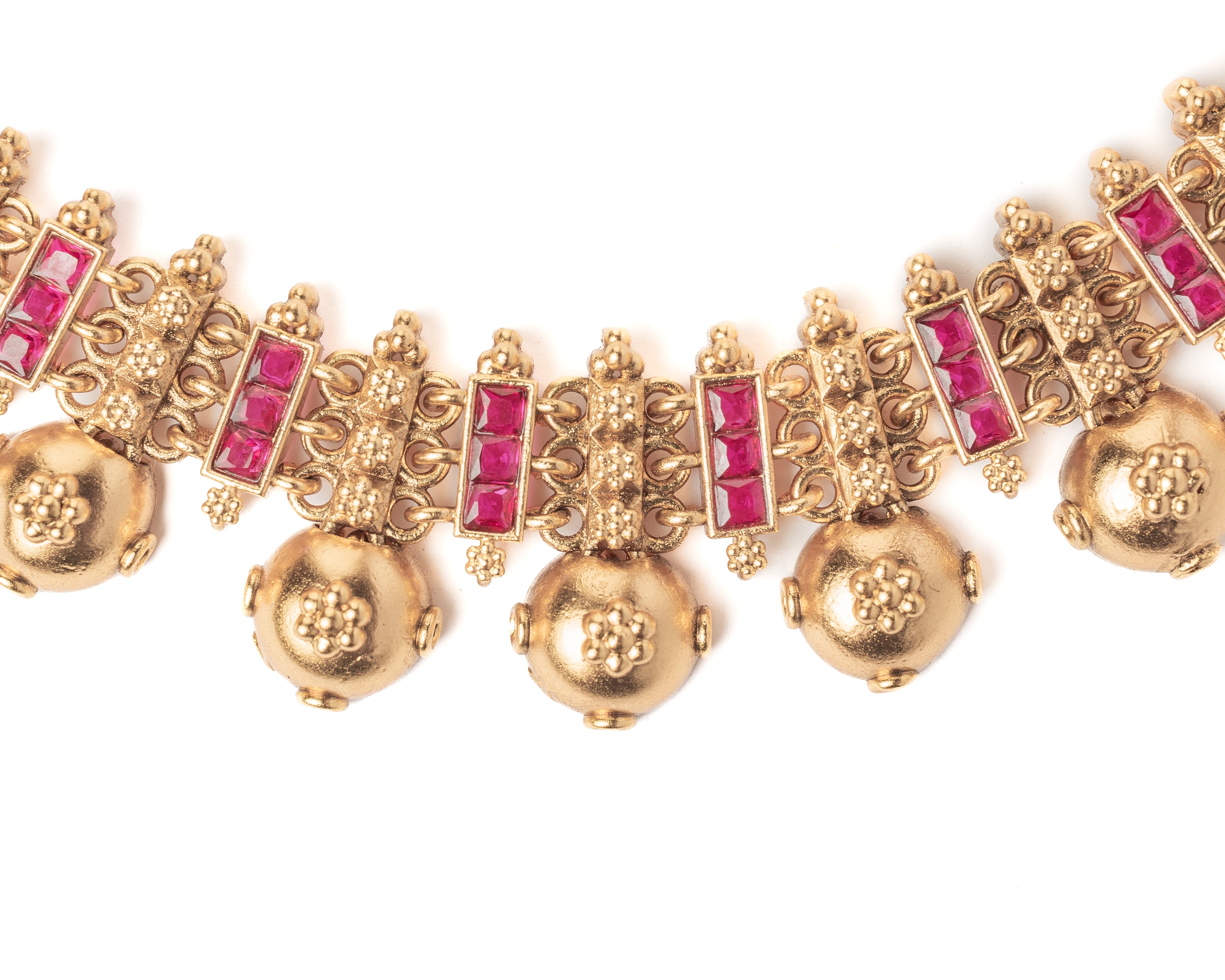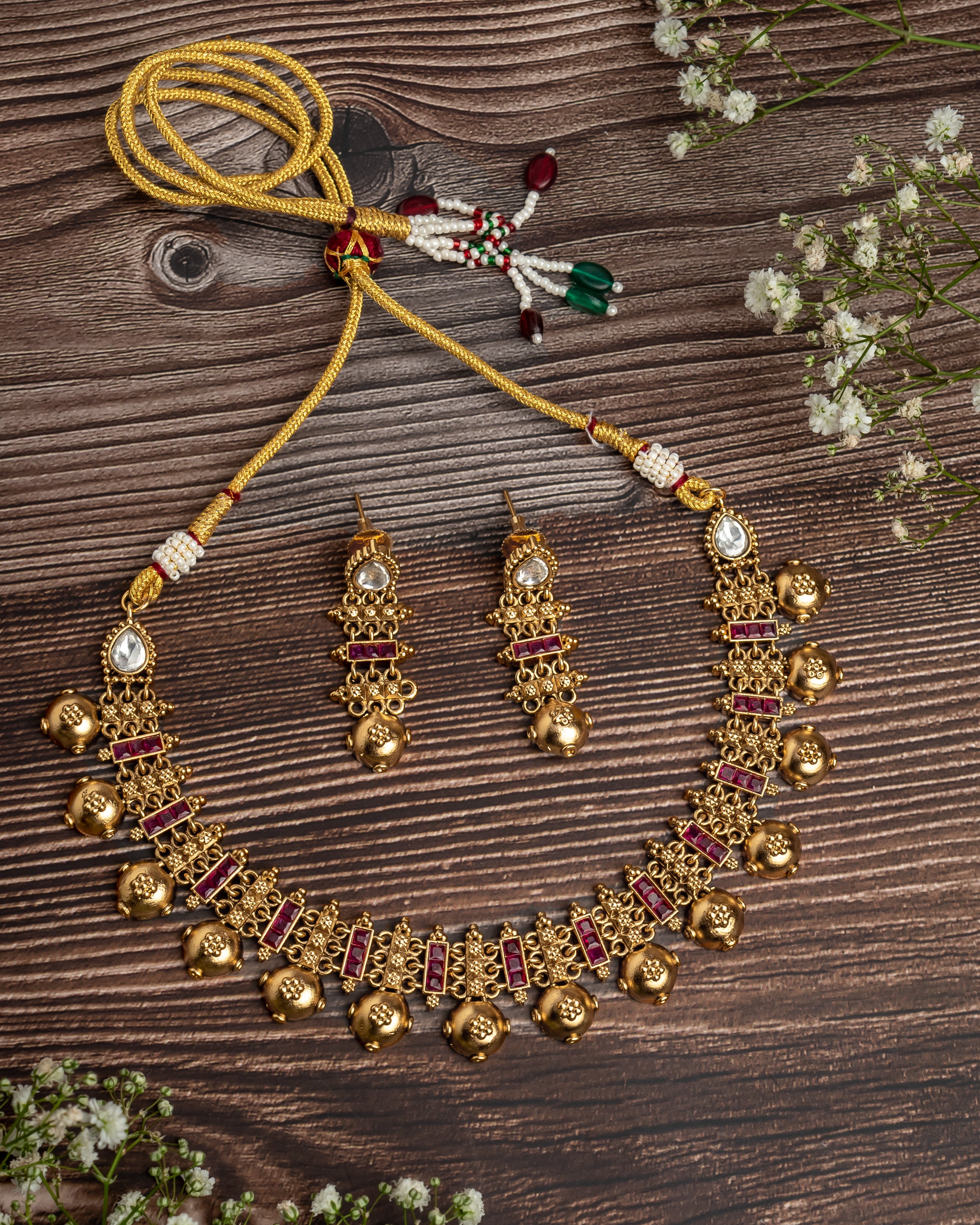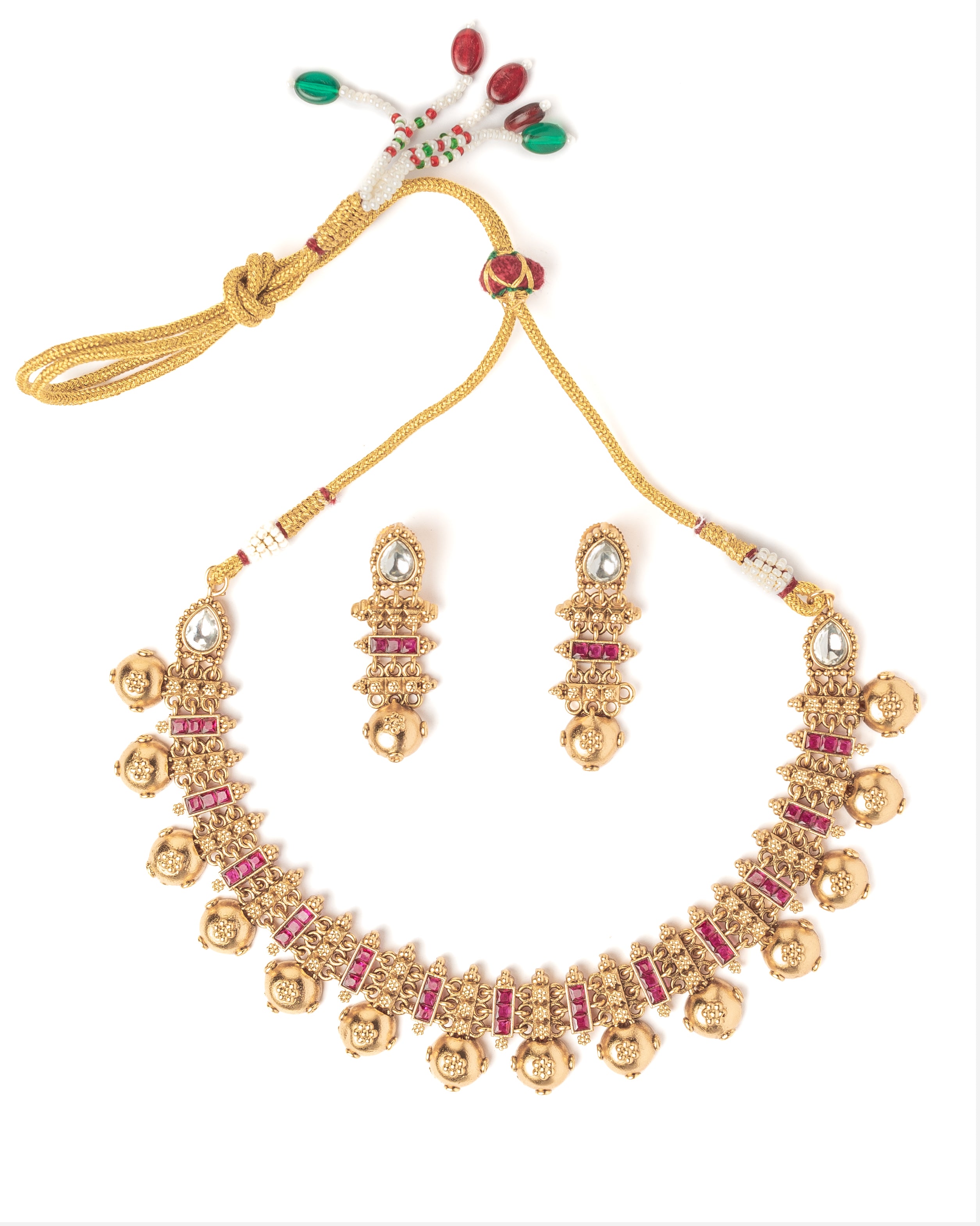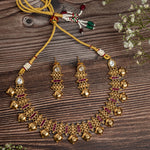 This gold-toned necklace set features intricate detailing, ruby accents, and jhumka-style earrings. Perfect for weddings and festive occasions, it adds a touch of traditional elegance to any ethnic ensemble.