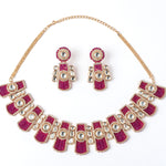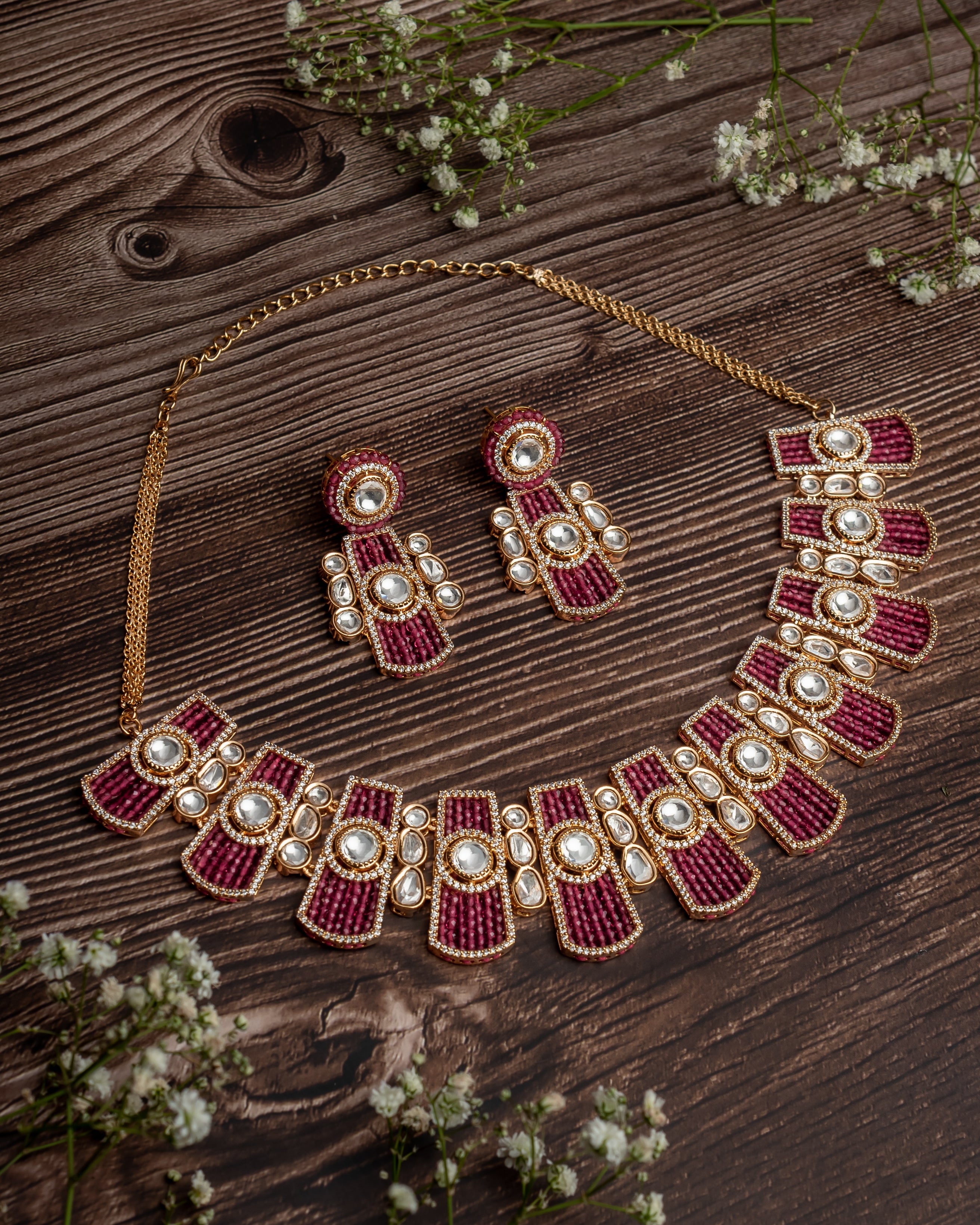 Elevate your style with this exquisite gold-toned necklace set featuring ruby-colored accents and intricate detailing. Perfect for weddings and festive occasions, it adds a regal touch to any traditional ensemble.