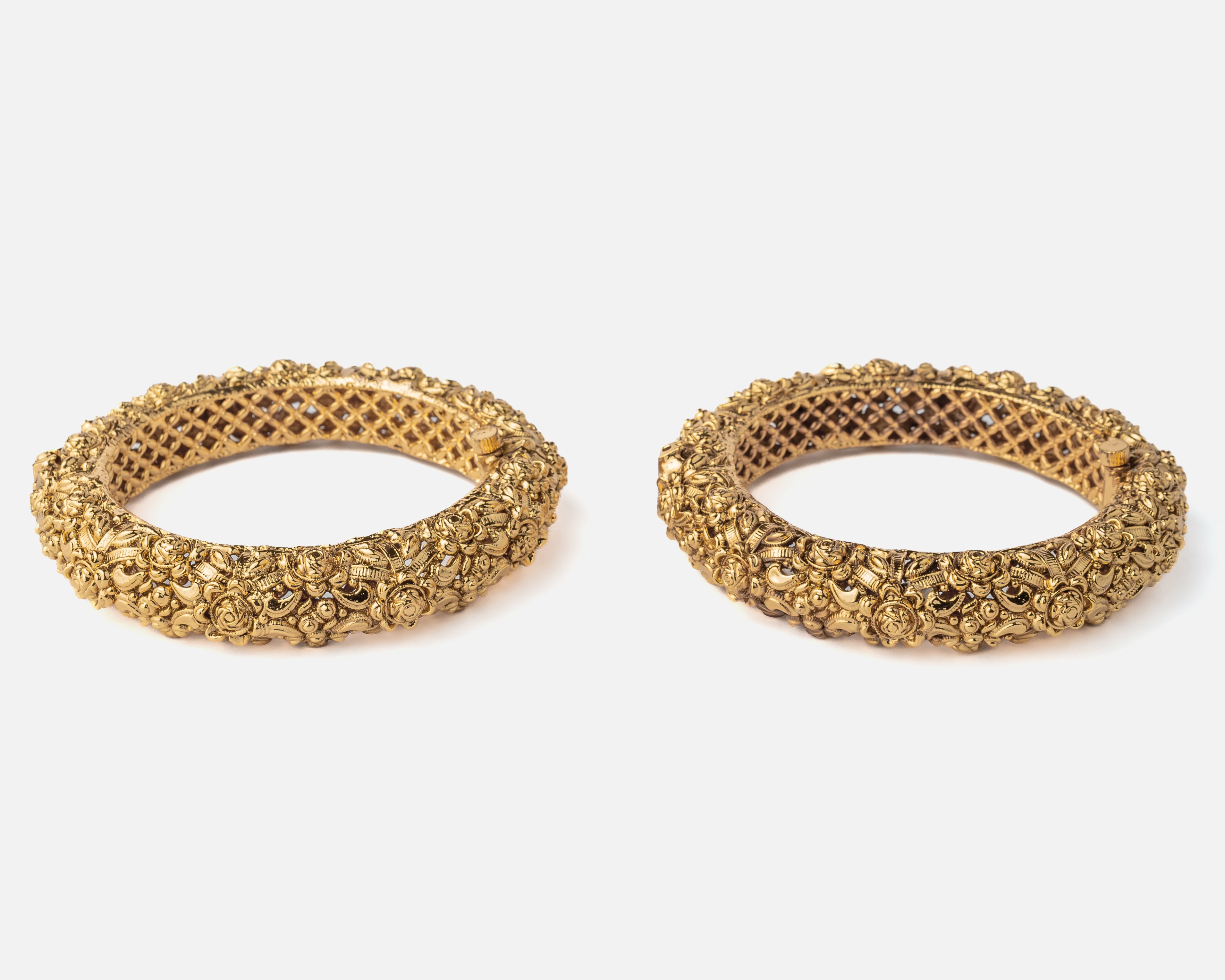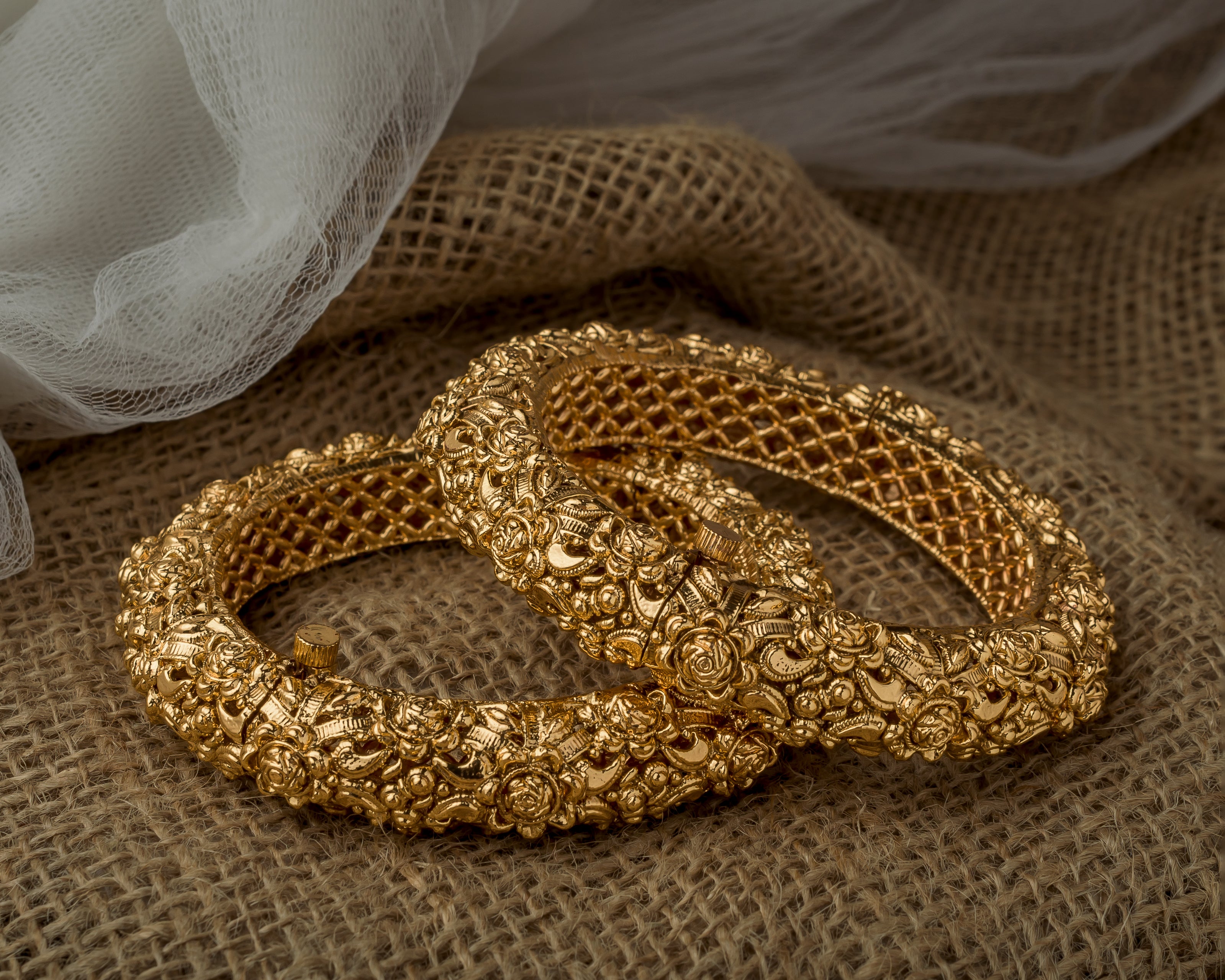 Luxurious gold-toned textured bangles with intricate craftsmanship. Designed for a bold and elegant statement, perfect for weddings, festive occasions, or special events. Durable, stylish, and timelessly chic.