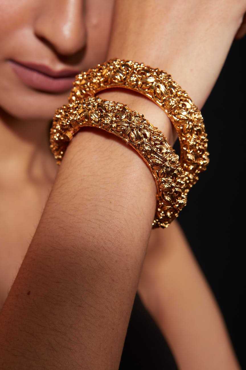 - Elegant Design – Bold gold-toned bangles with intricate textured detailing.