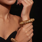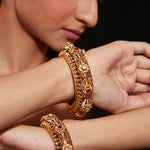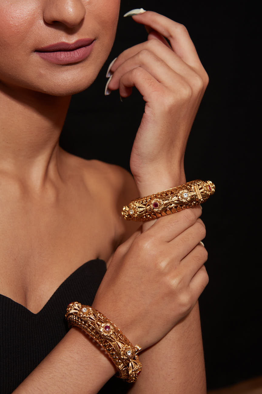 Elegant gold bangles adorned with intricate designs, sparkling gemstones, and fine craftsmanship. Perfect for special occasions, these statement pieces add a touch of luxury and tradition to any outfit.