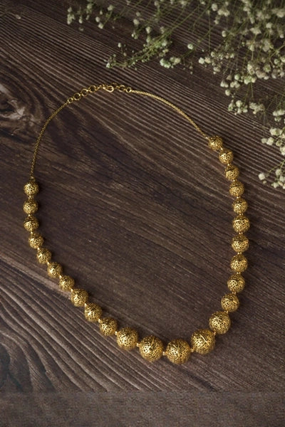 Make a bold style statement with this antique gold-tone necklace featuring intricately crafted filigree beads in a graduated design. Perfect for ethnic outfits, festive events, and traditional occasions.