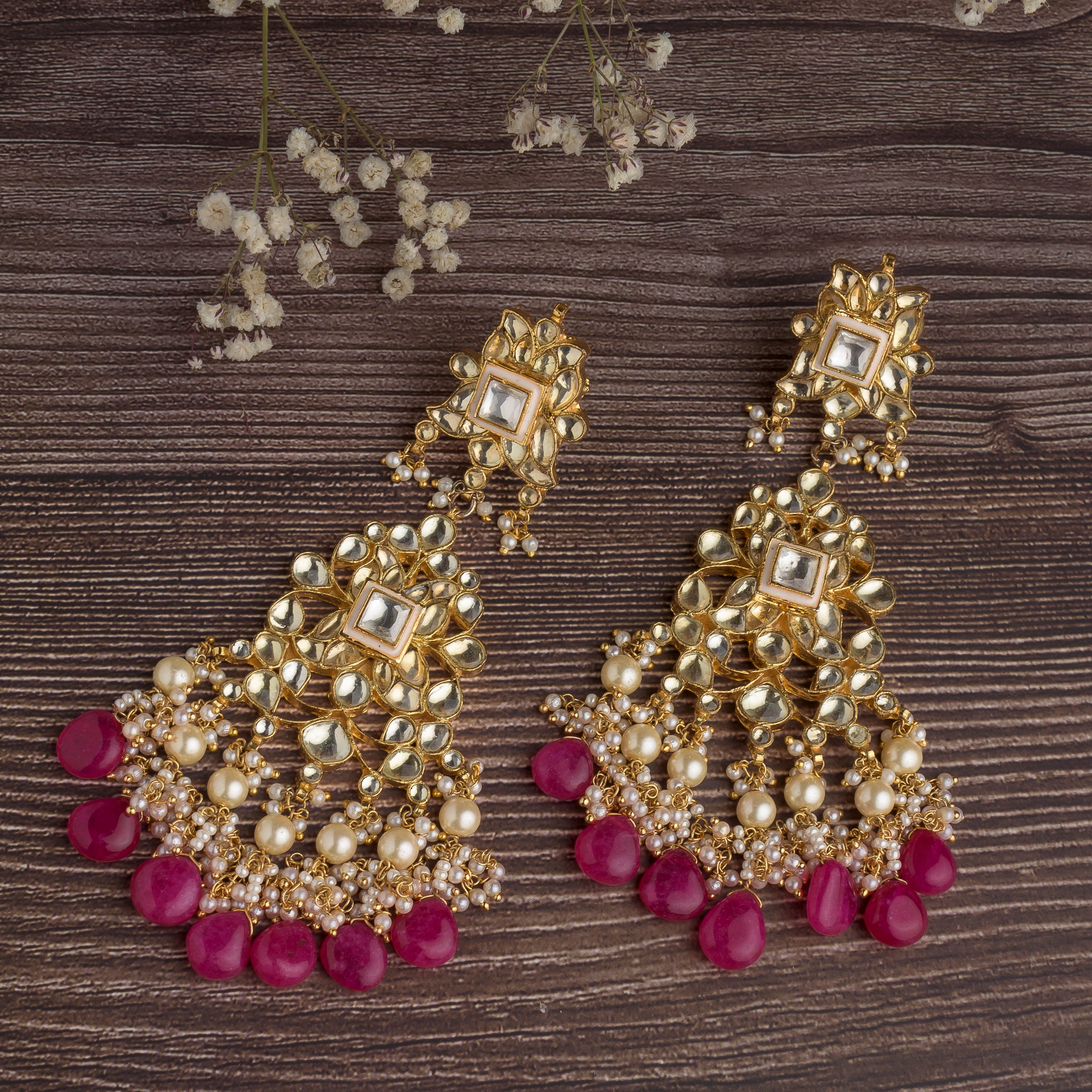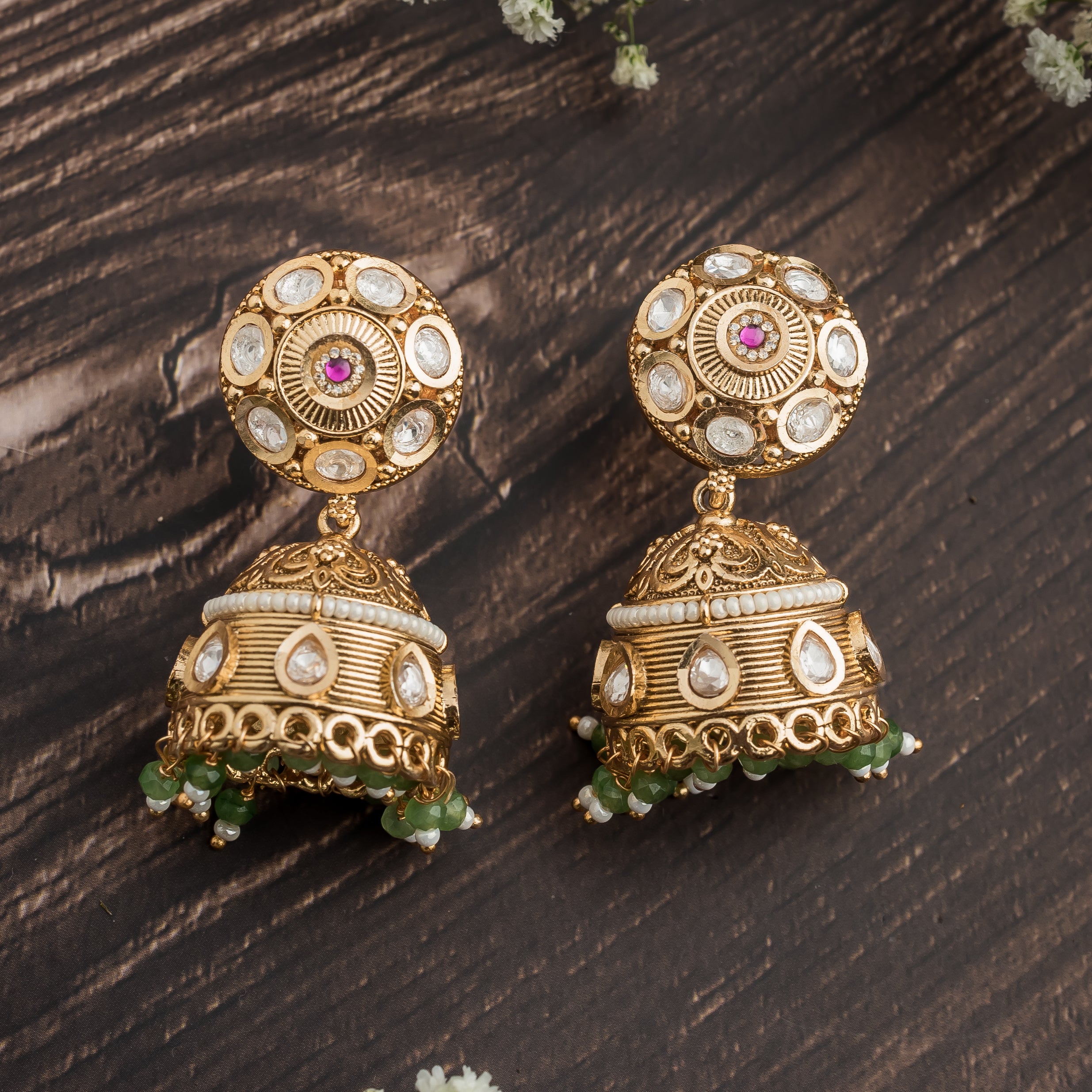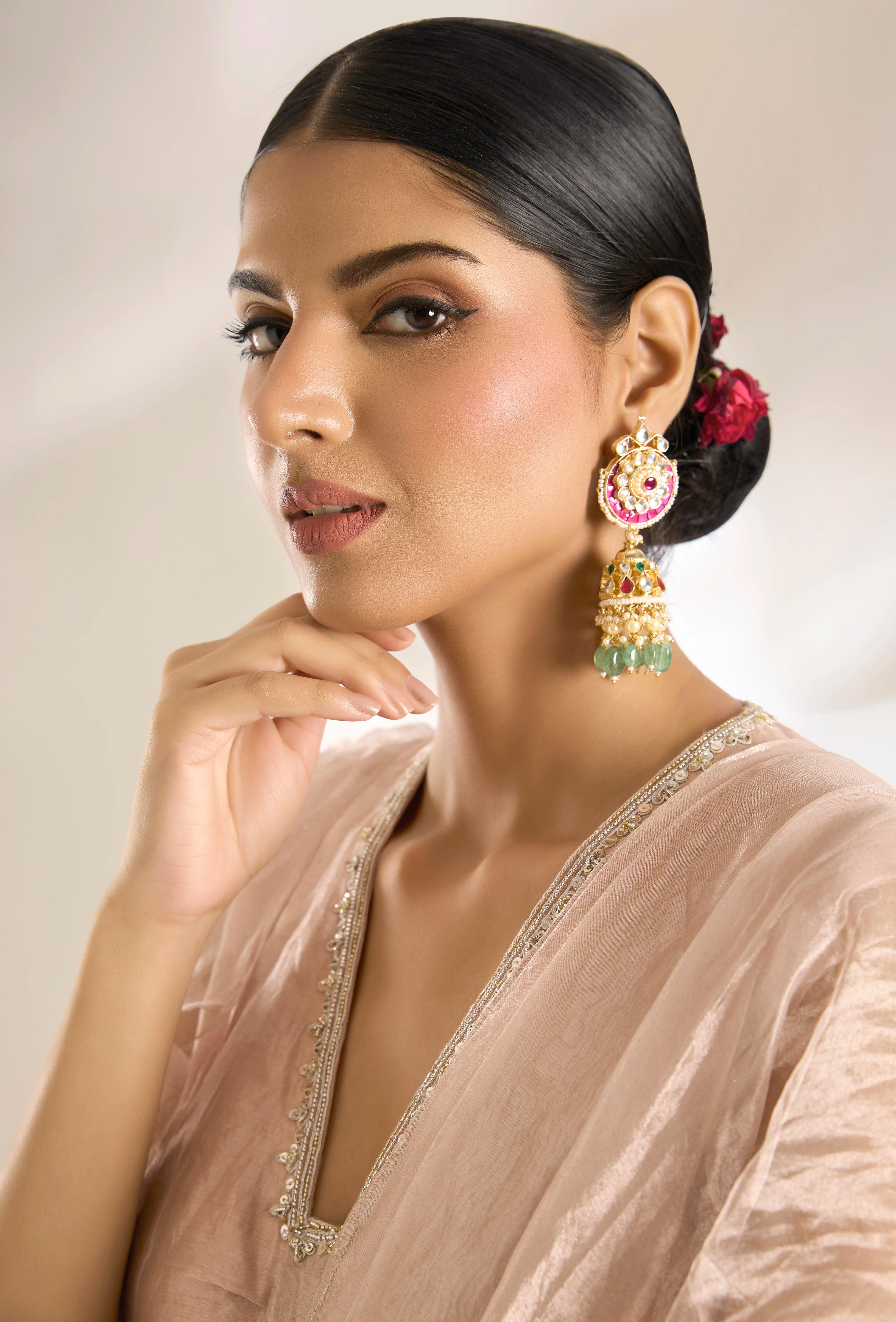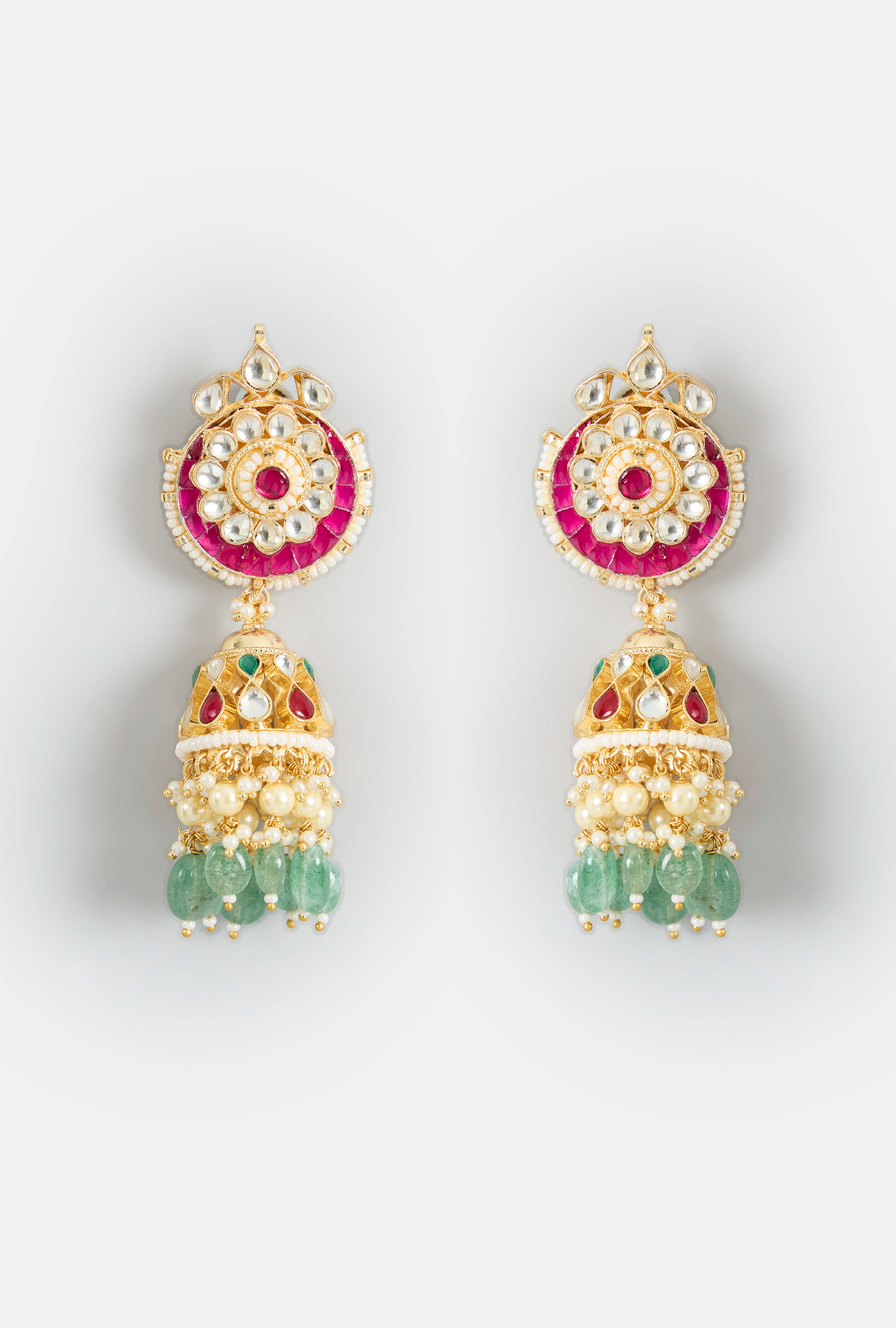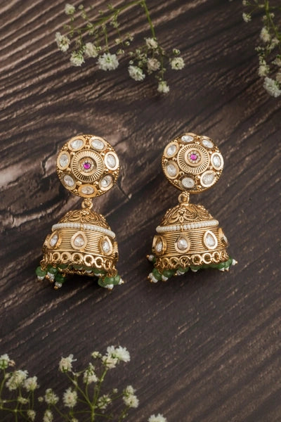 Gold Plated Kundan Studded With Pink Synthetic Stone Green Beads Drop Jhumka Earrings