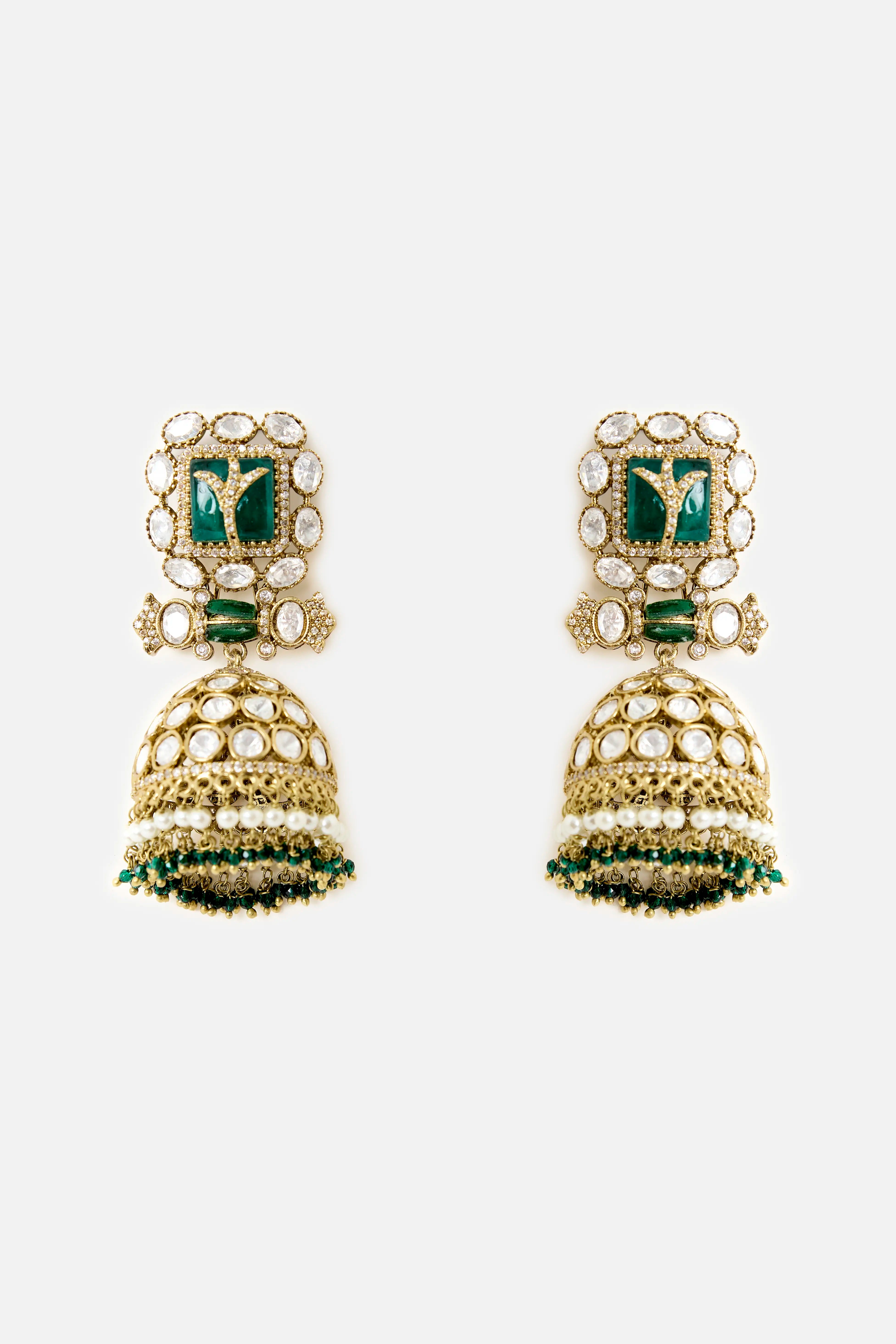 Stunning gold-tone jhumka earrings adorned with green and pink stones, finished with pearl detailing. A perfect statement accessory for weddings, festive occasions, and traditional ensembles.