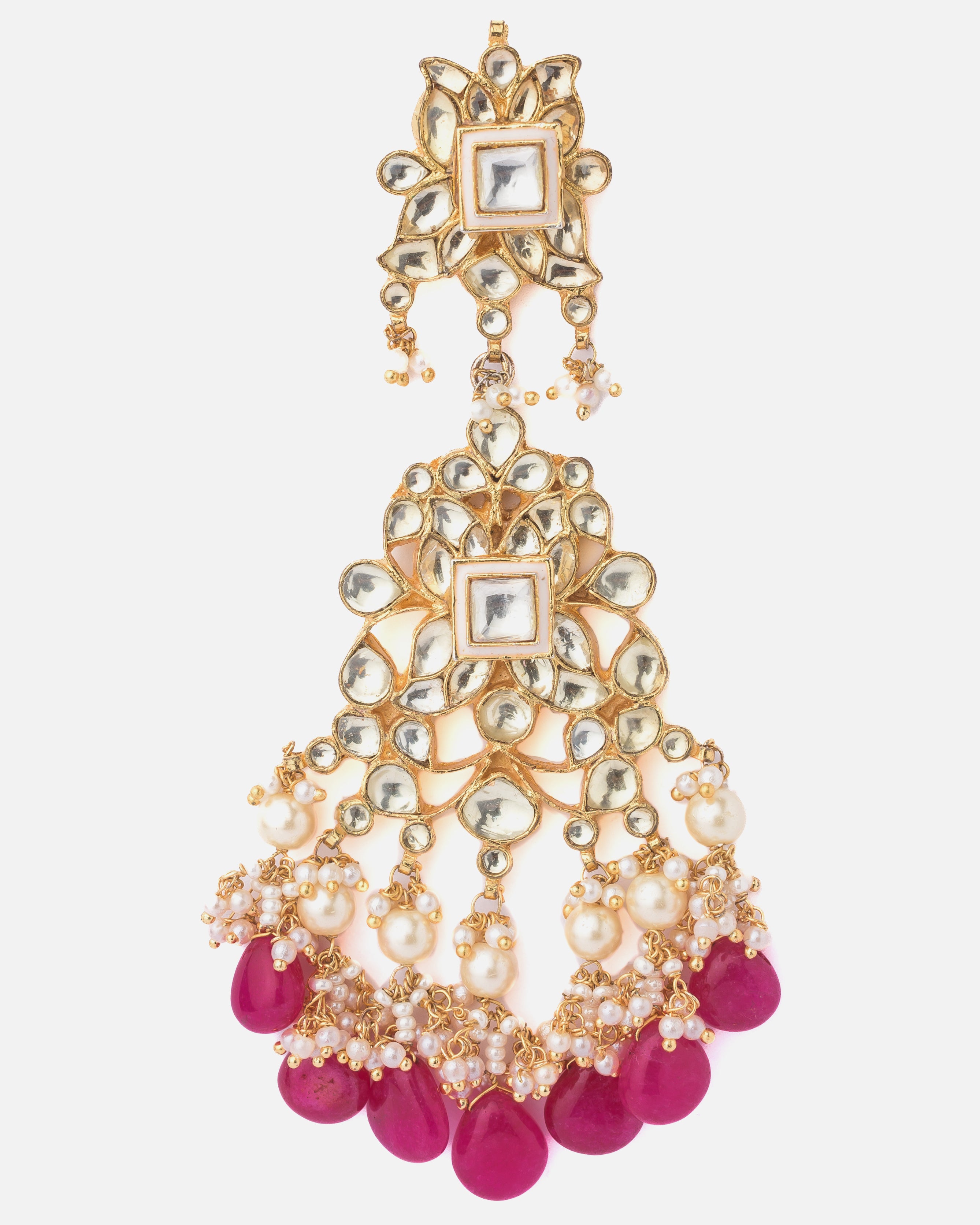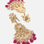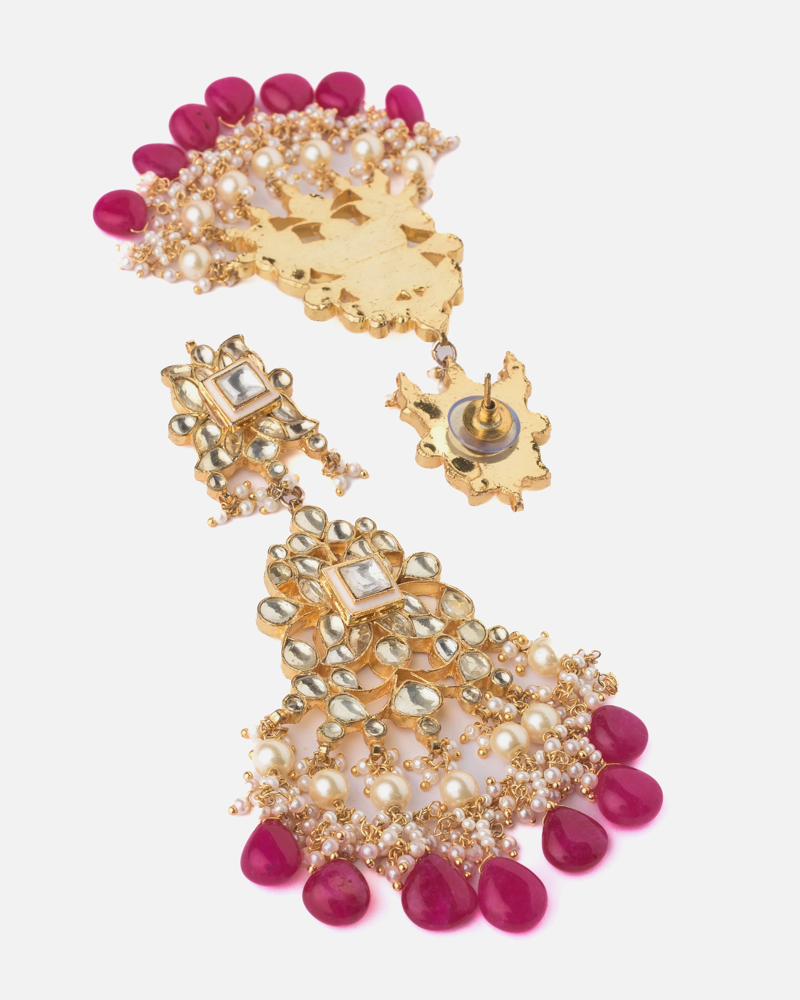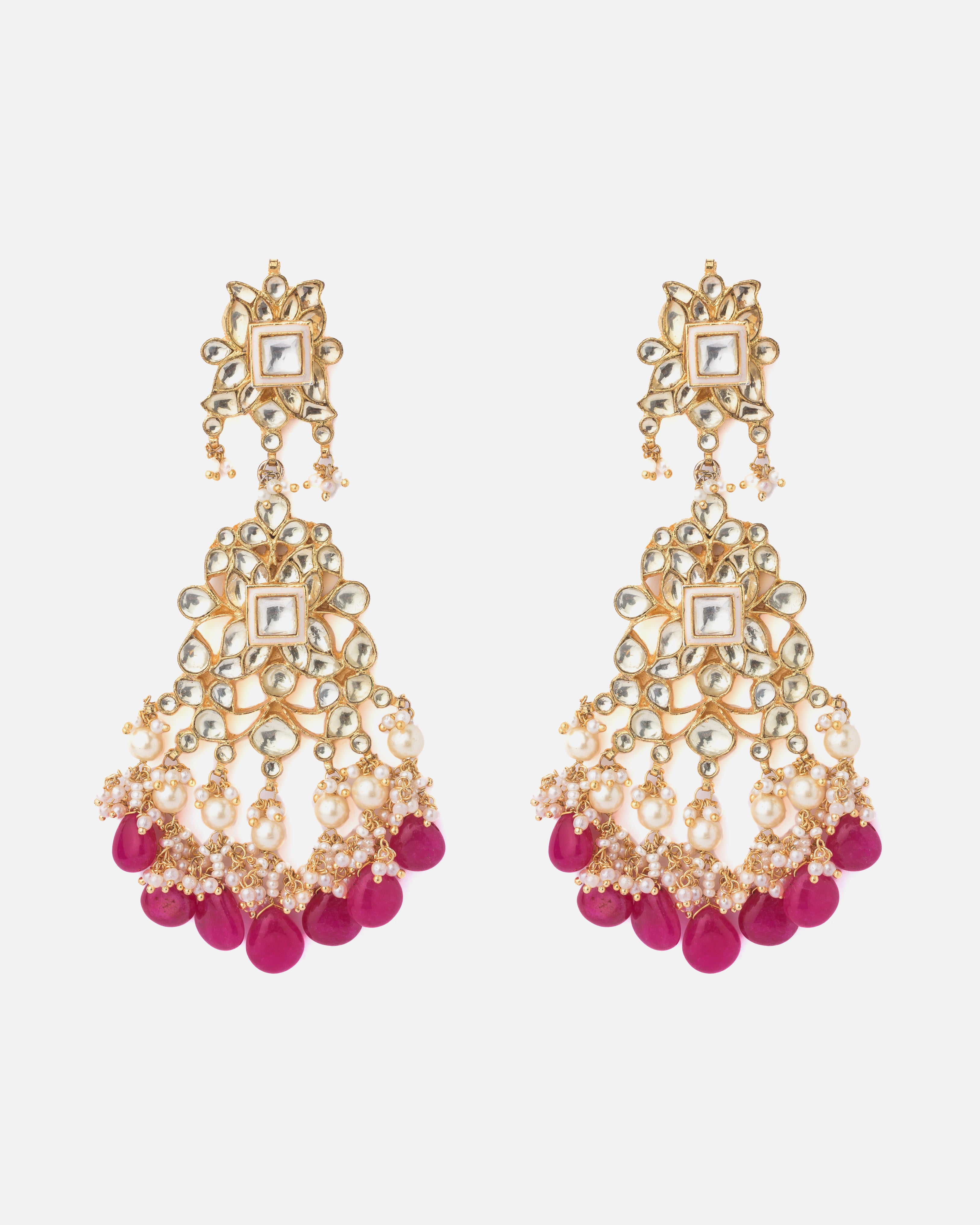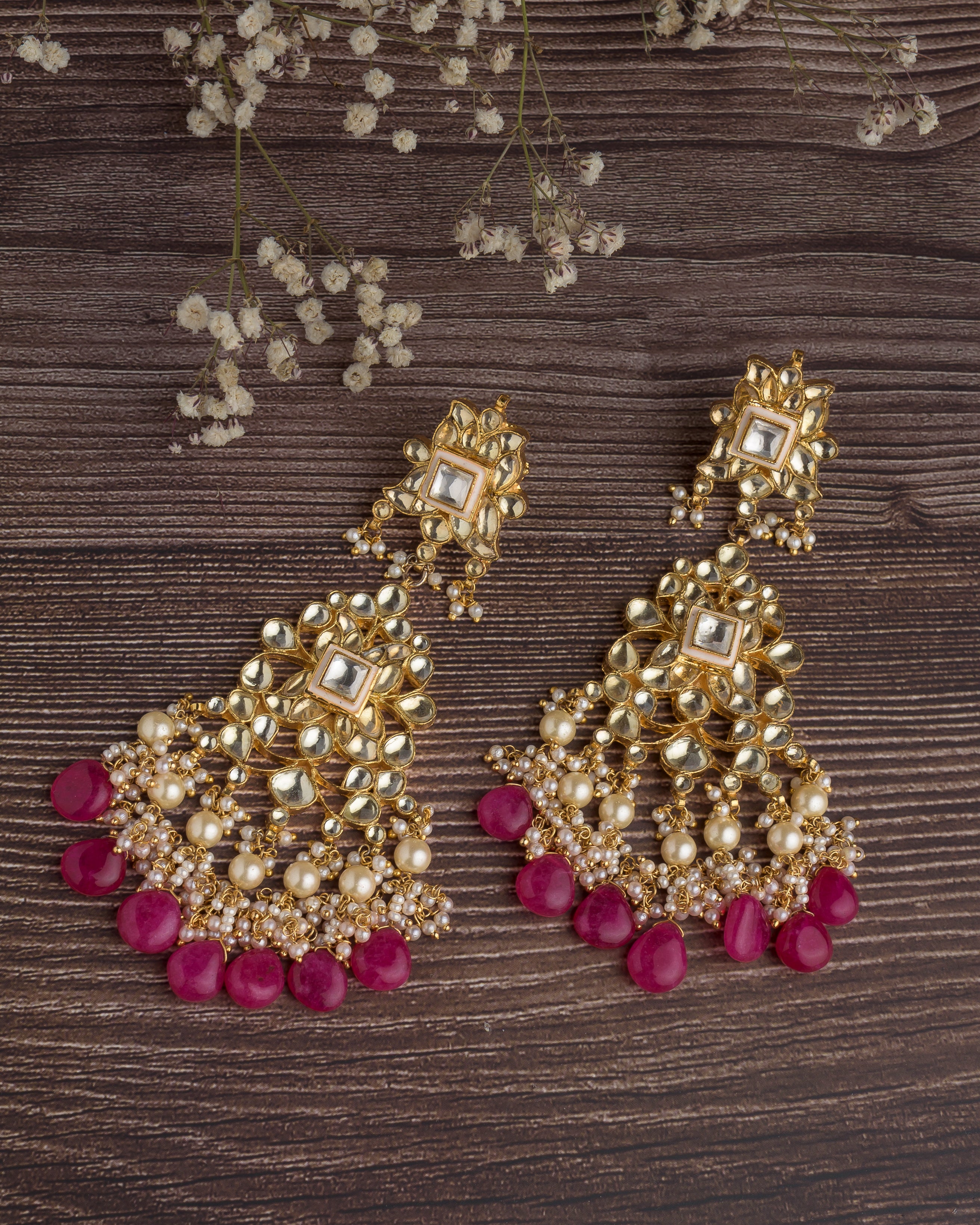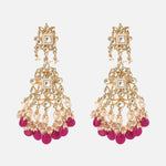 Elegant gold-plated Jhumka earrings adorned with sparkling Kundan stones and delicate pearl accents. Featuring vibrant pink beads, these statement earrings blend traditional charm with modern elegance, perfect for festive wear.