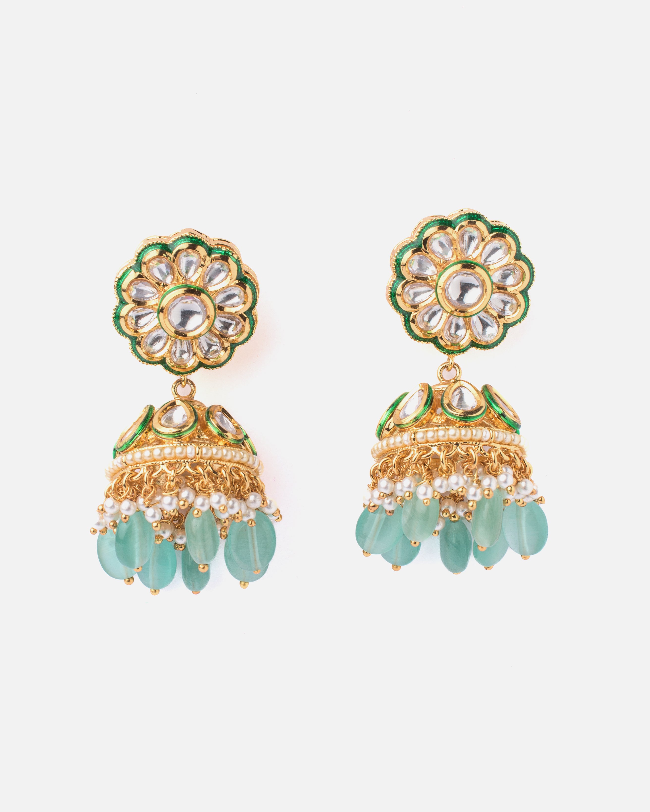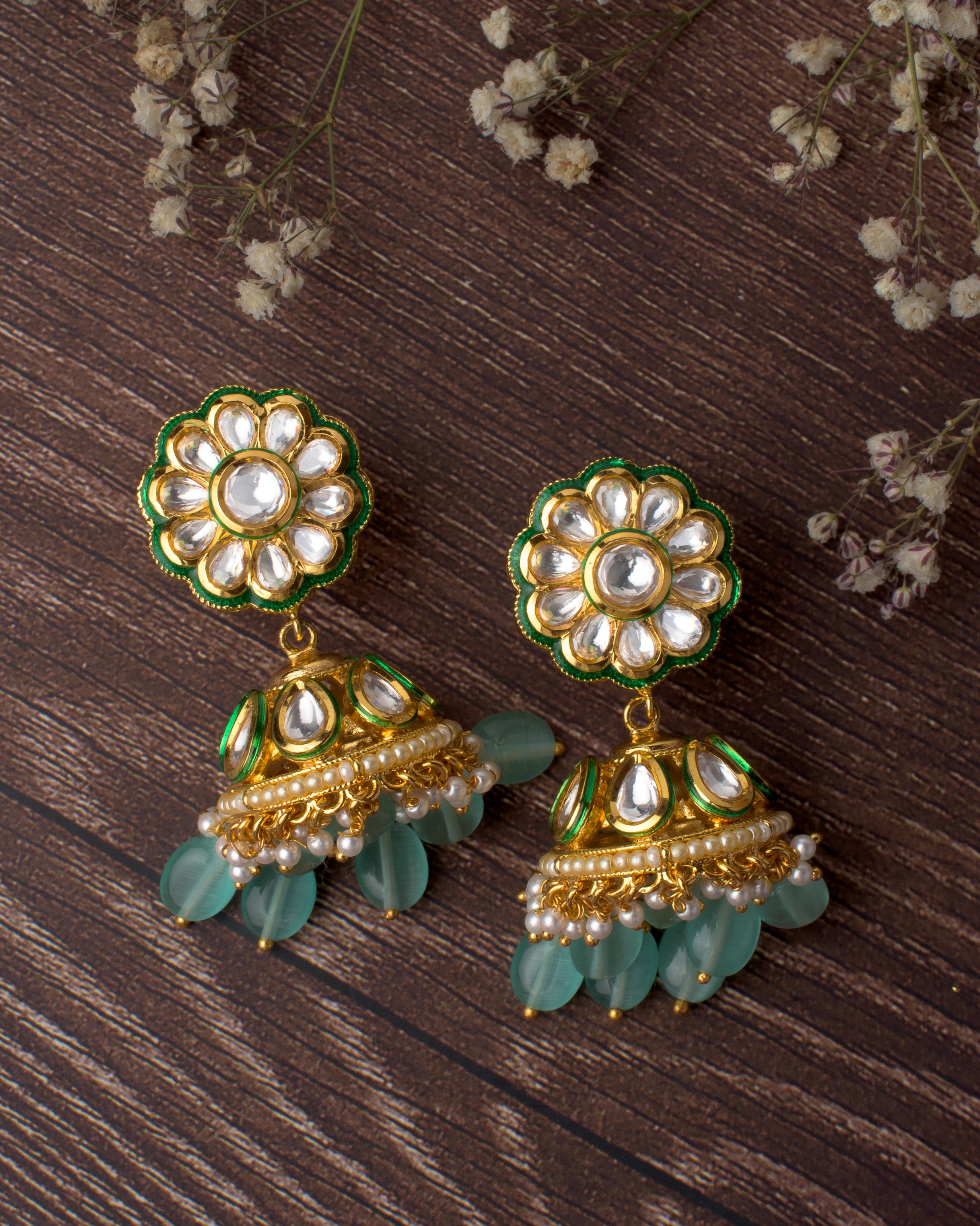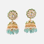 Add a touch of tradition with these floral Kundan earrings. Embellished with green beads and pearls, they exude elegance—perfect for festive or ethnic occasions. Lightweight & stylish!