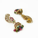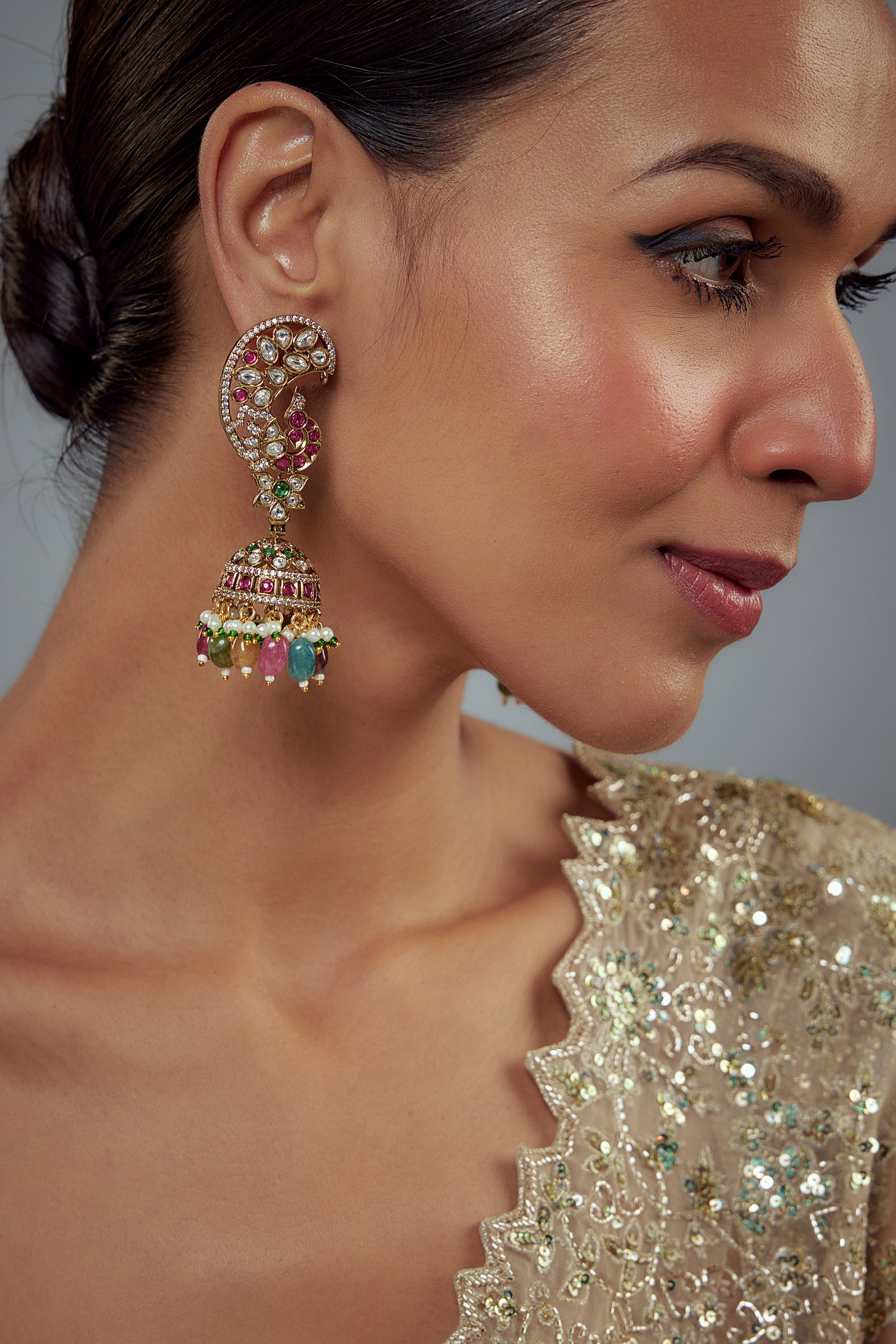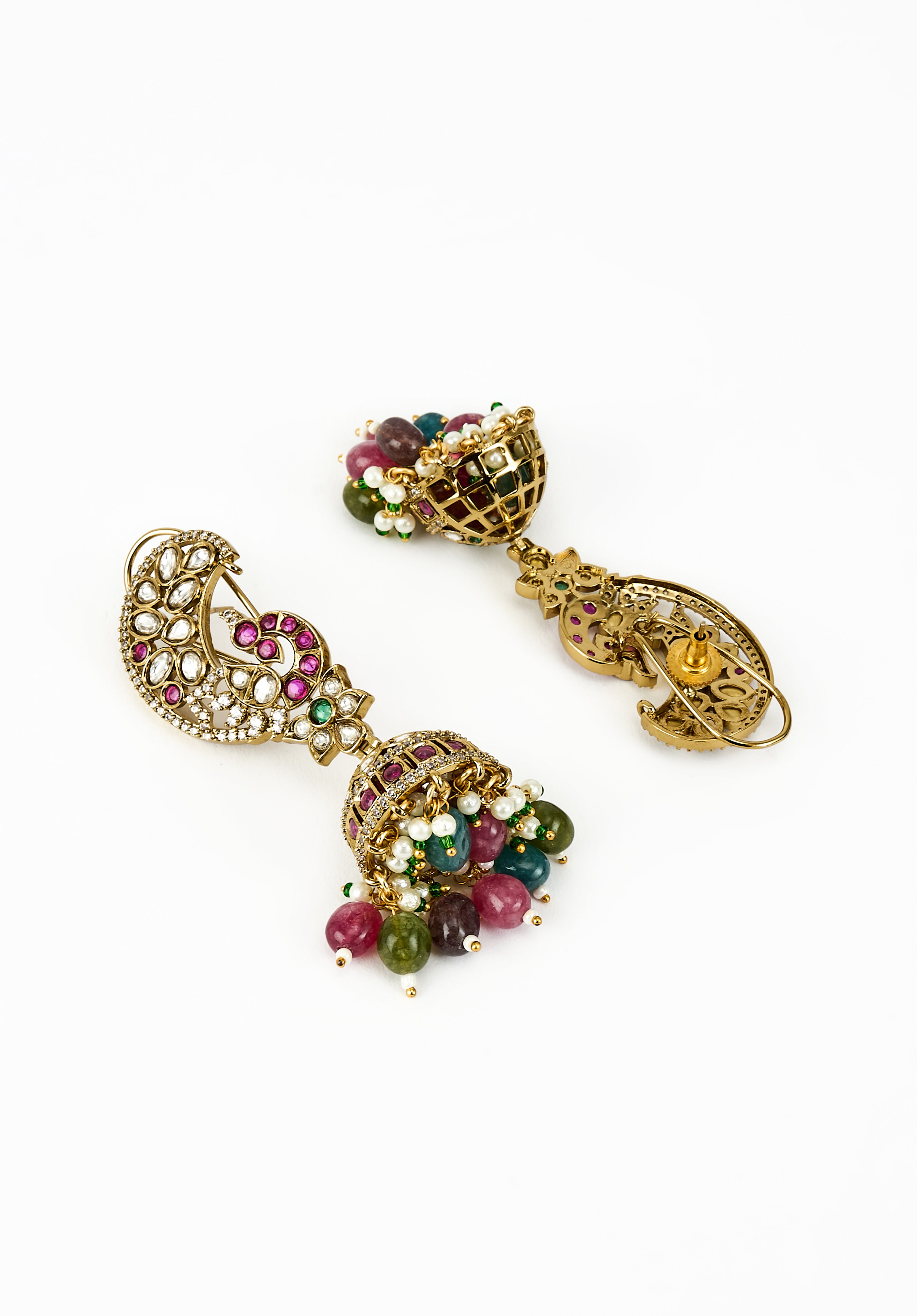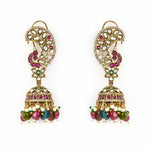 Adorn style with these intricately designed earrings featuring a peacock-inspired motif, embellished with vibrant stones & delicate beads. Perfect for traditional occasions & adding a regal charm.