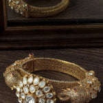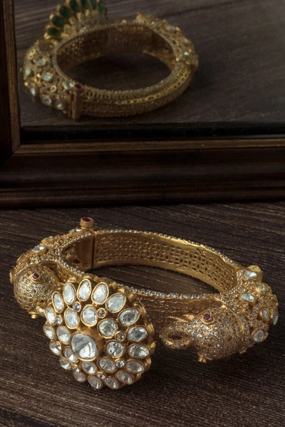This majestic bangle showcases a dazzling floral centrepiece surrounded by intricate kundan-style stones, with ornate elephant-head accents, combining regal charm and traditional craftsmanship for a royal look.