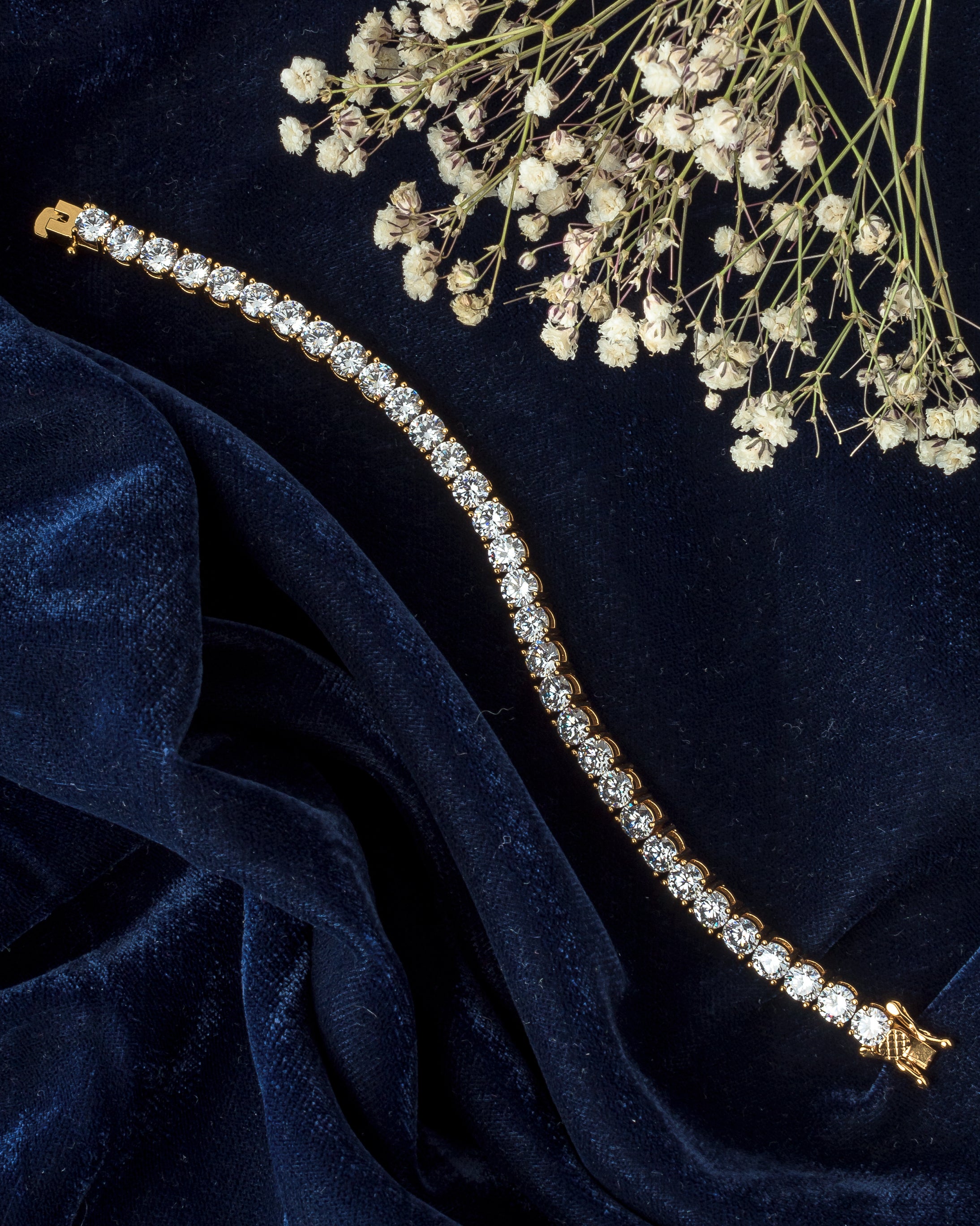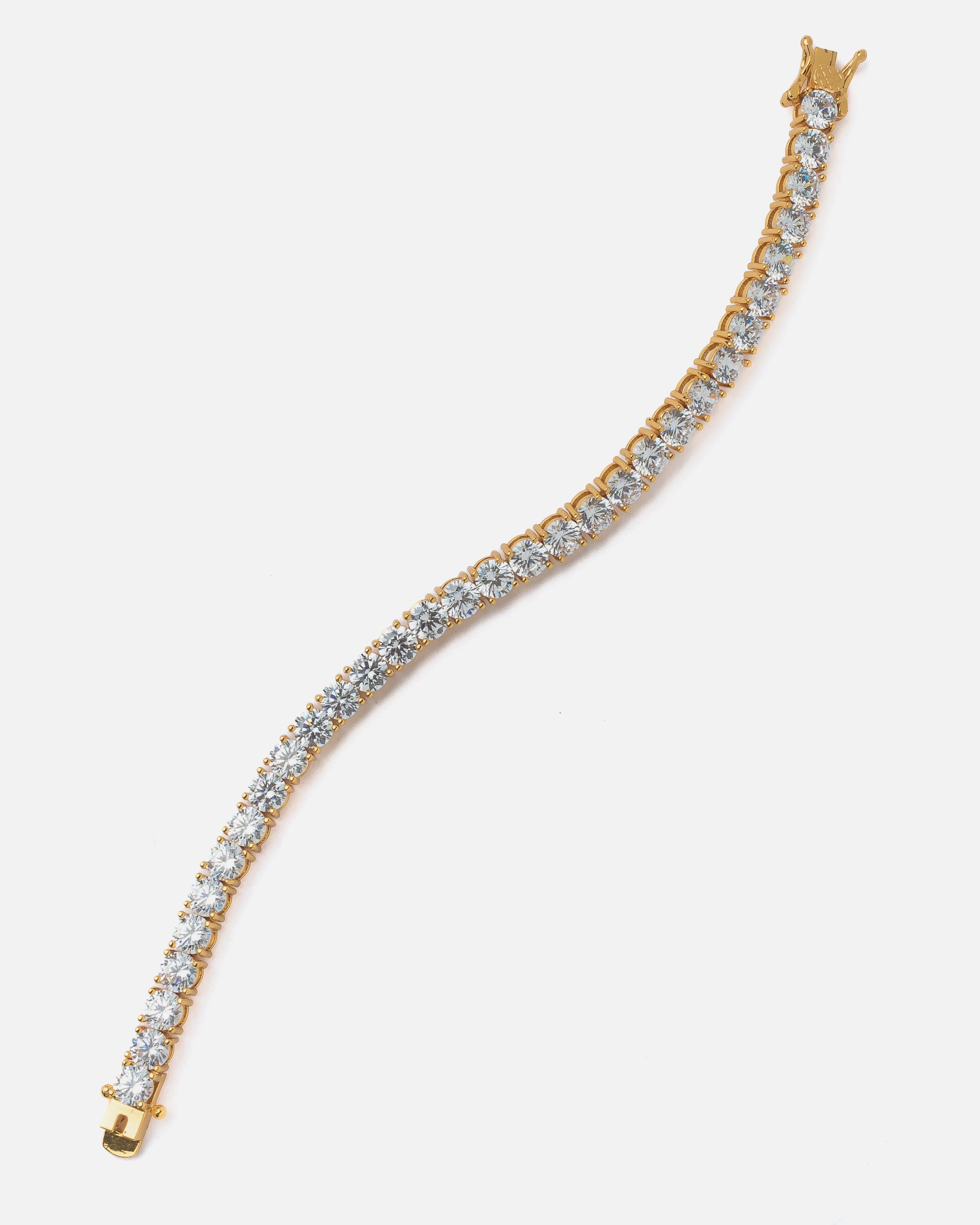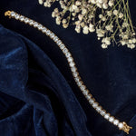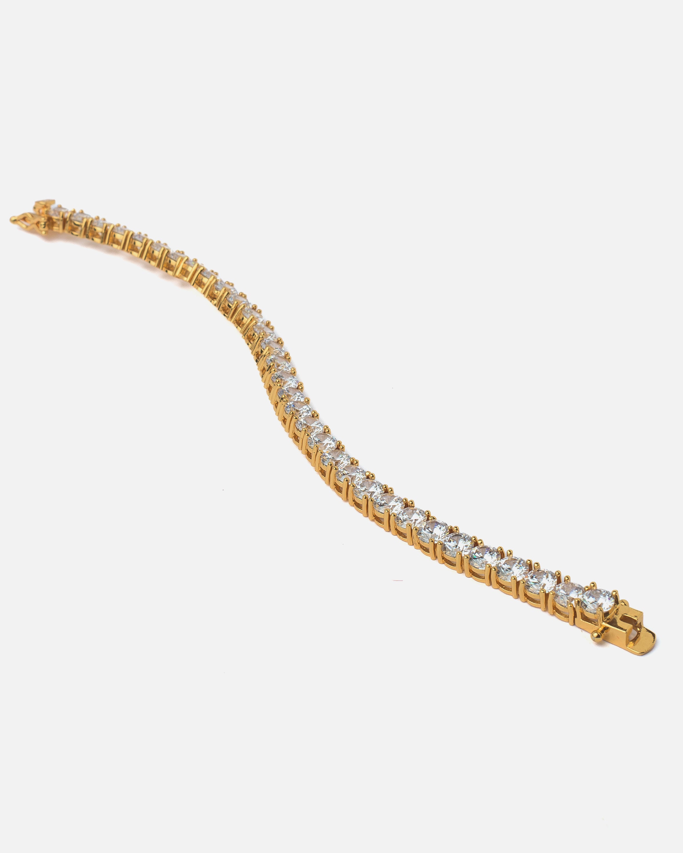 Elevate your style with this exquisite gold-plated tennis bracelet, adorned with a dazzling row of round-cut white stones. Perfect for both festive occasions and elegant everyday wear.