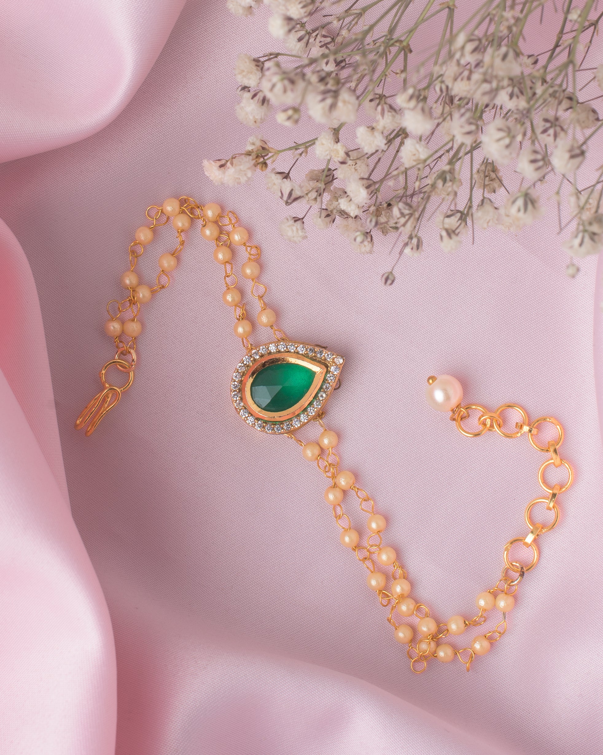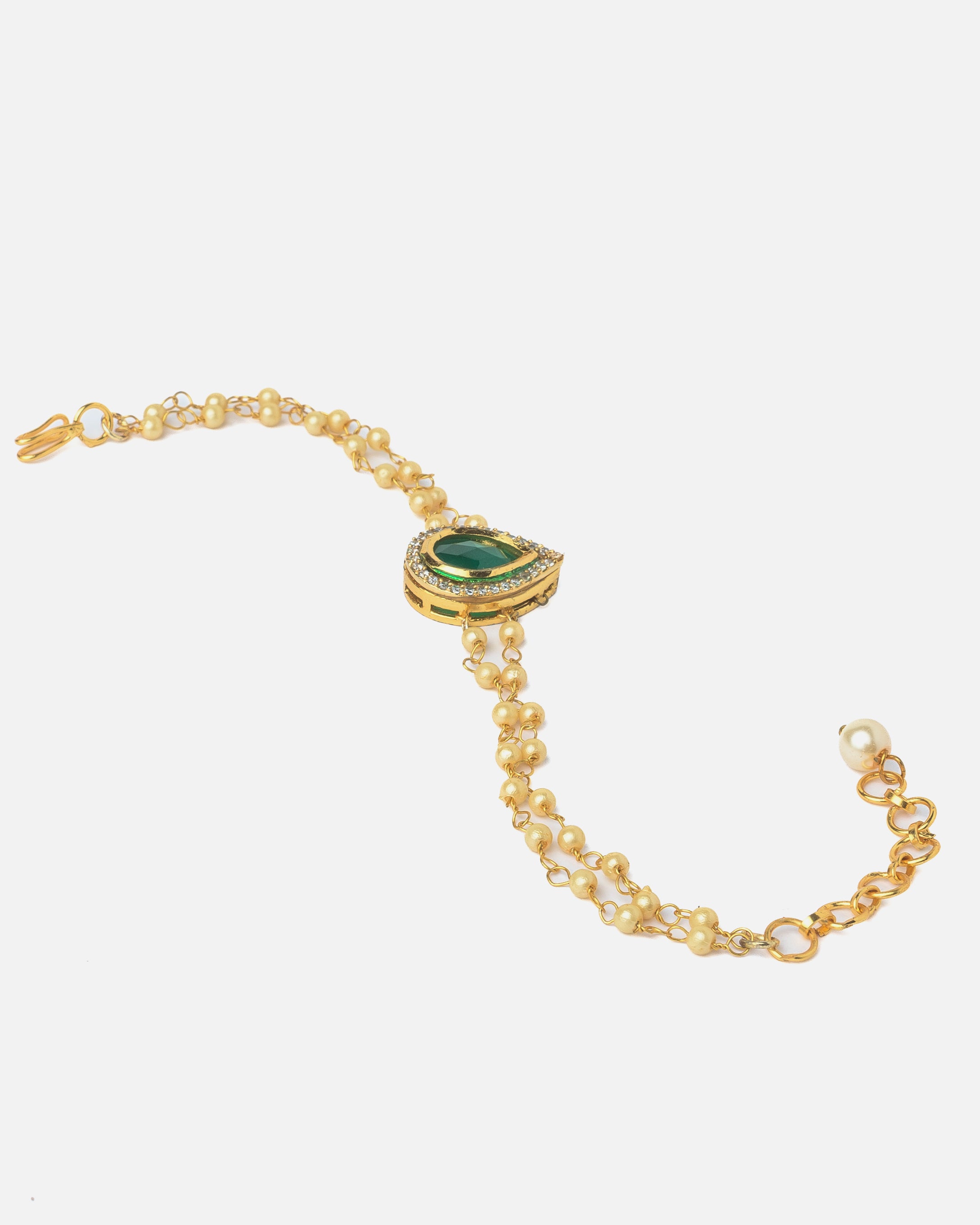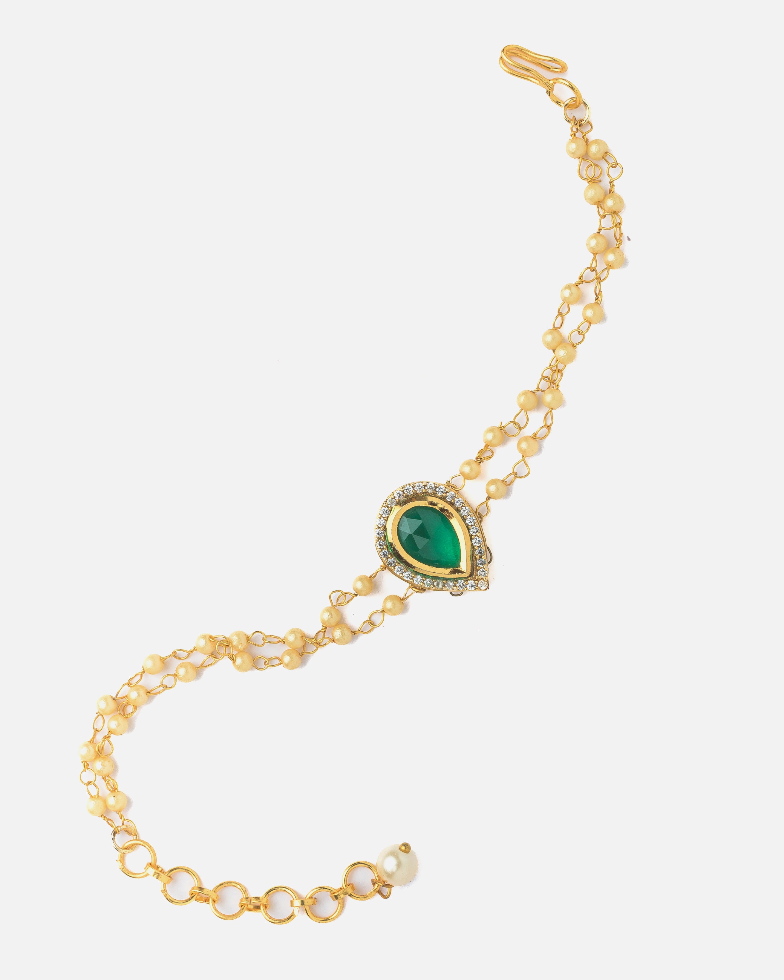 This elegant bracelet features a beautiful green teardrop gemstone surrounded by sparkling diamonds, set in gold with a delicate chain of lustrous pearls. A perfect accessory to add a touch of sophistication to any outfit.