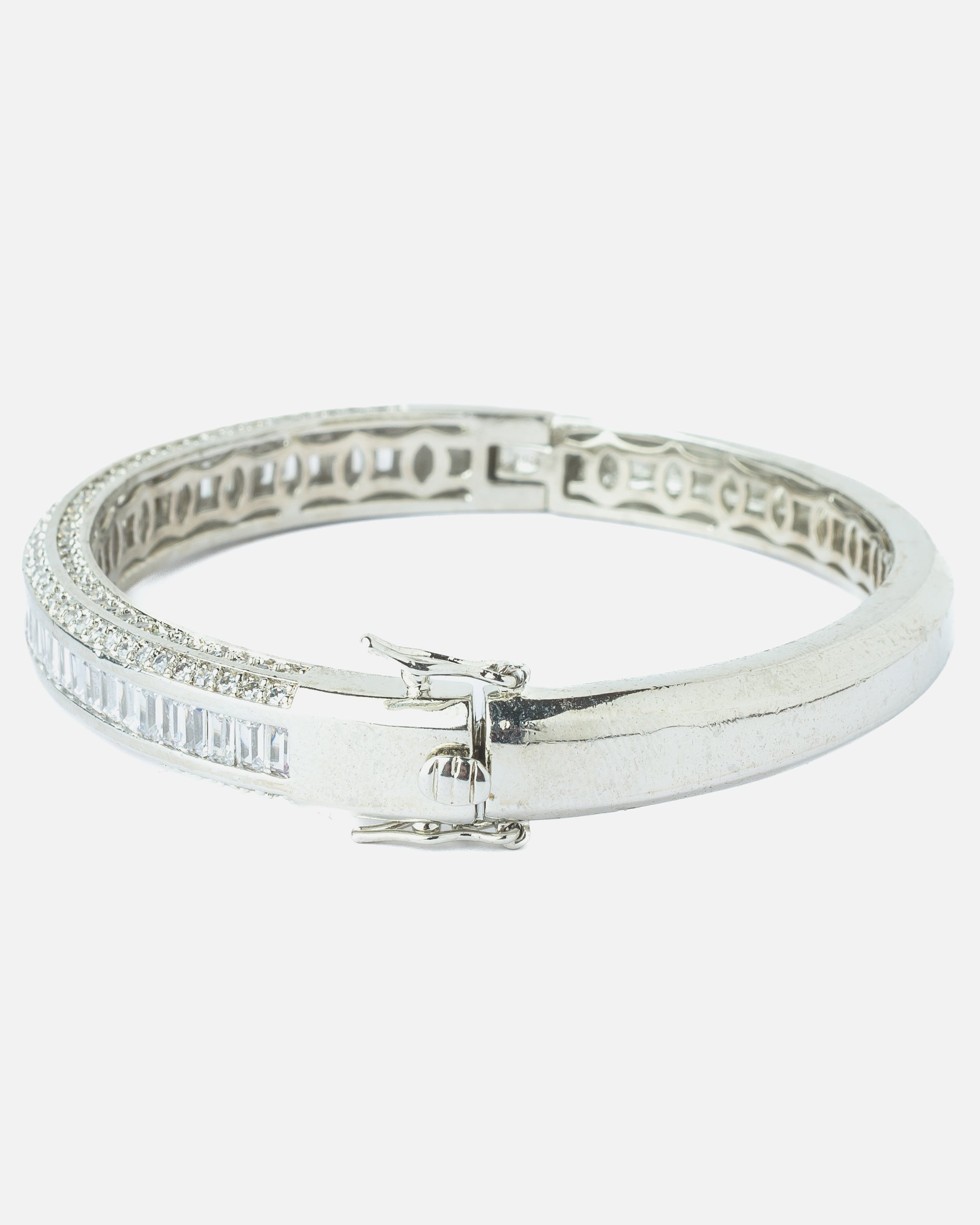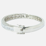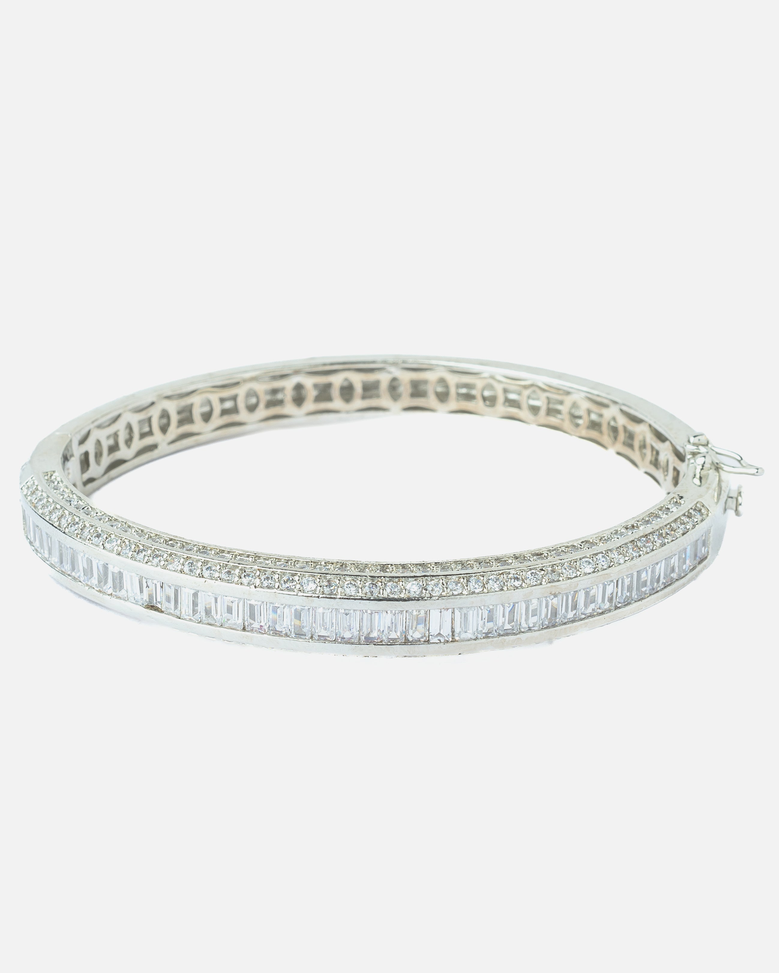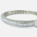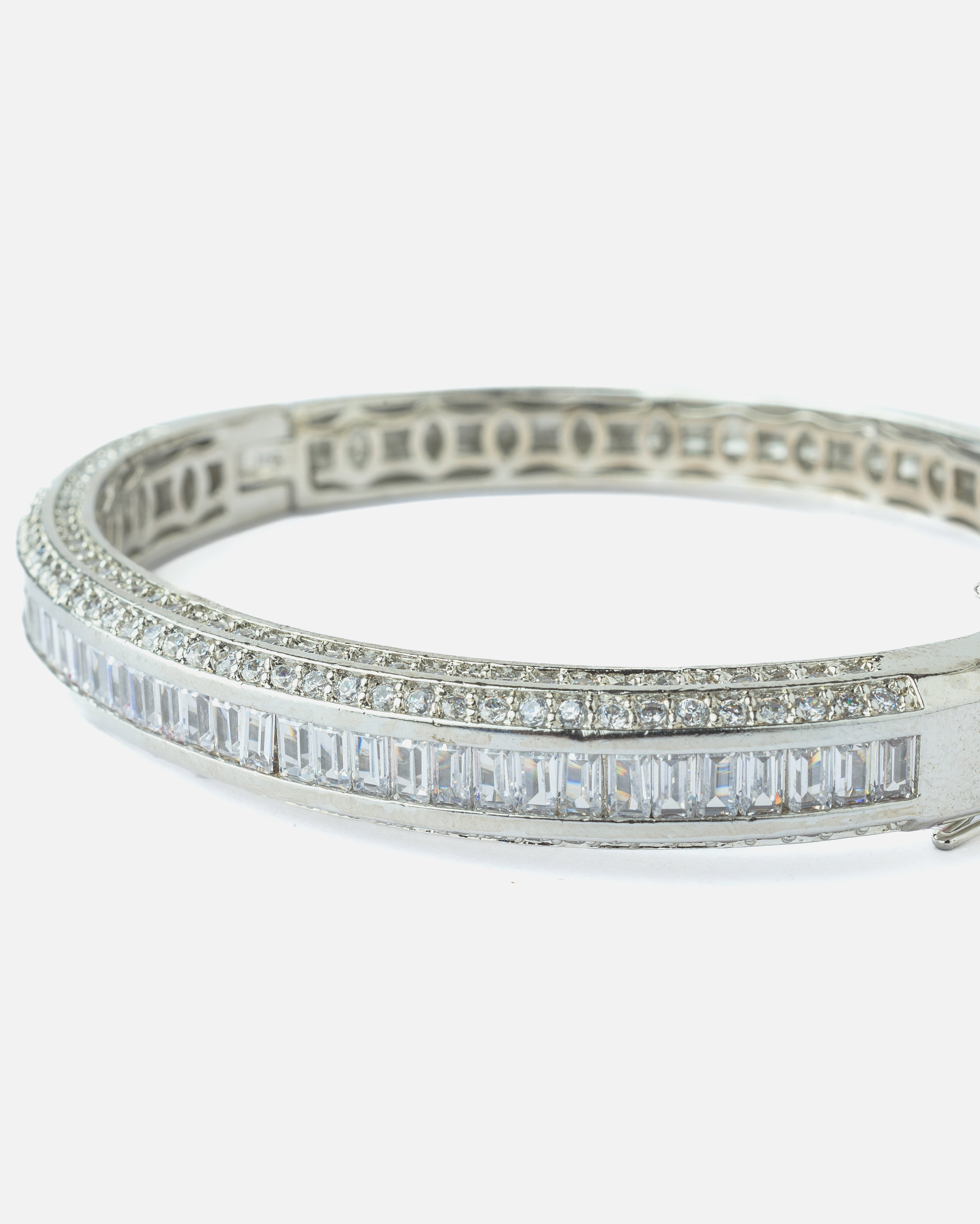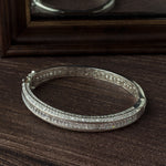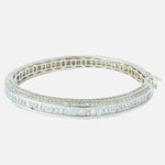 Elegant silver-toned bangle encrusted with two rows of sparkling round-cut stones and a center row of baguette-cut crystals. A sleek, modern accessory perfect for evening wear or formal occasions.