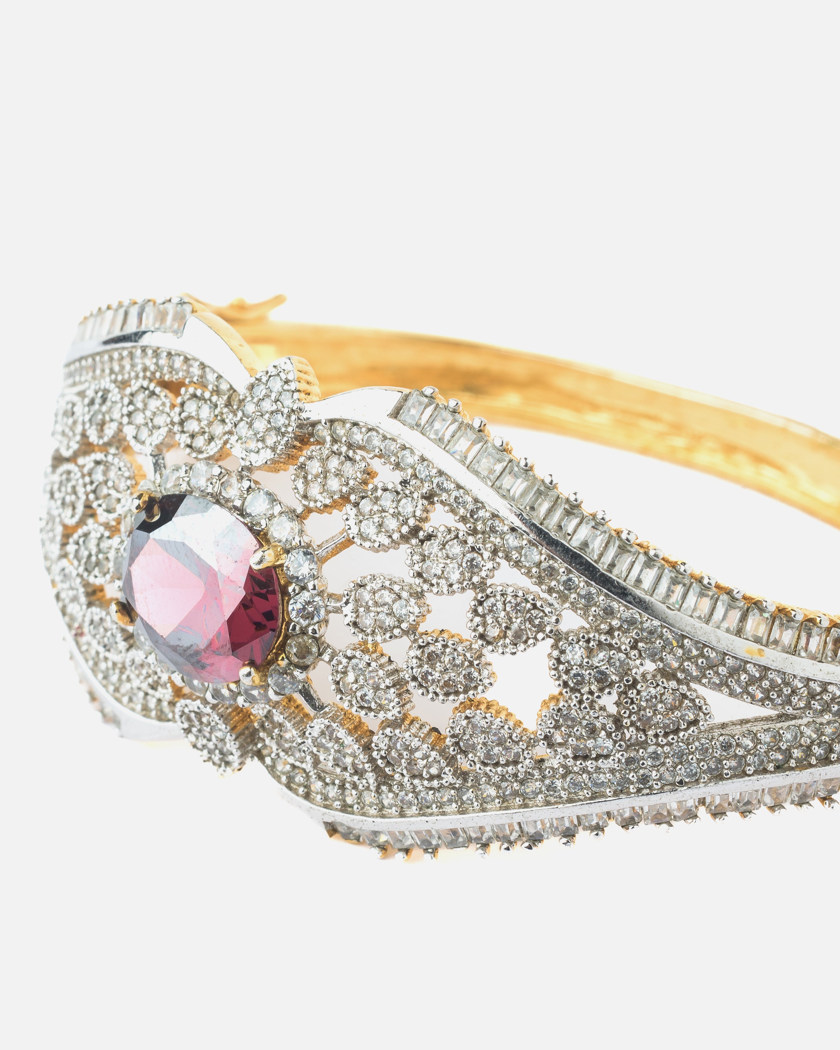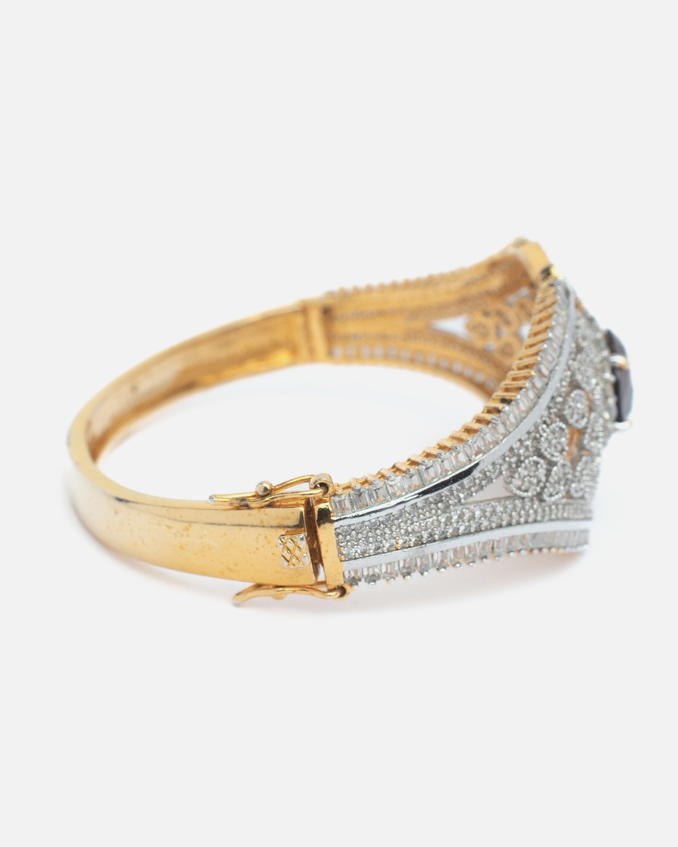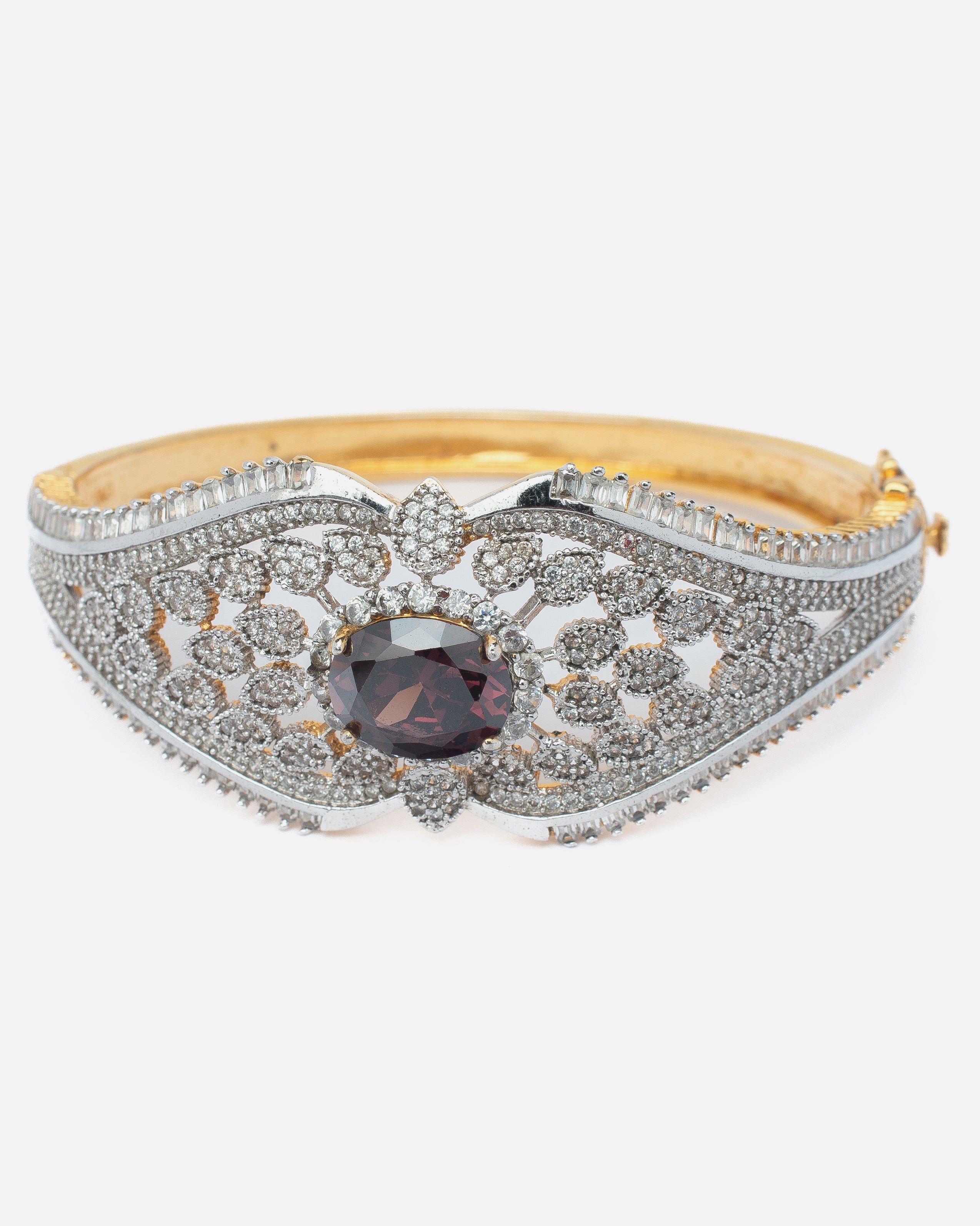 This stunning bangle showcases an intricate filigree design with dazzling white stones and a striking dark gemstone centerpiece, making it a perfect blend of elegance and sophistication for any special occasion.