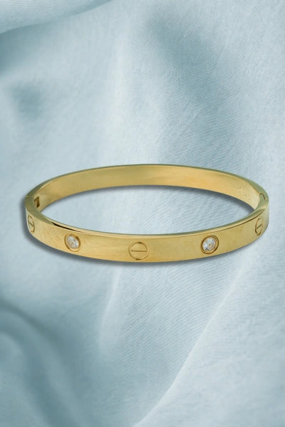 Elegant gold-tone bangle with a sleek, minimalist design, featuring embedded sparkling stones for a refined touch. Perfect for everyday wear or stacking, this timeless piece adds sophistication to any outfit.