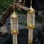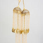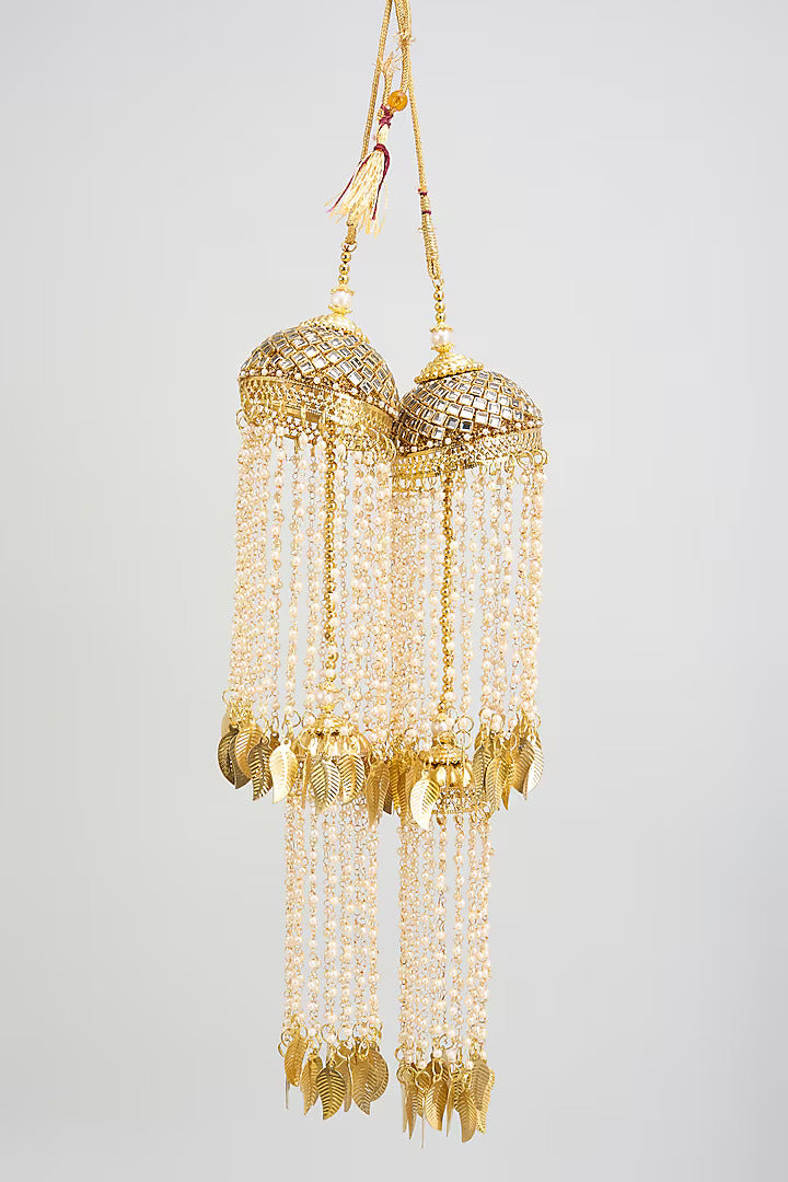 Elegant and traditional, these gold-plated kaleeras are adorned with pearl strings and intricate motifs. Perfect for brides, they symbolize blessings and add charm to wedding attire with their timeless design.