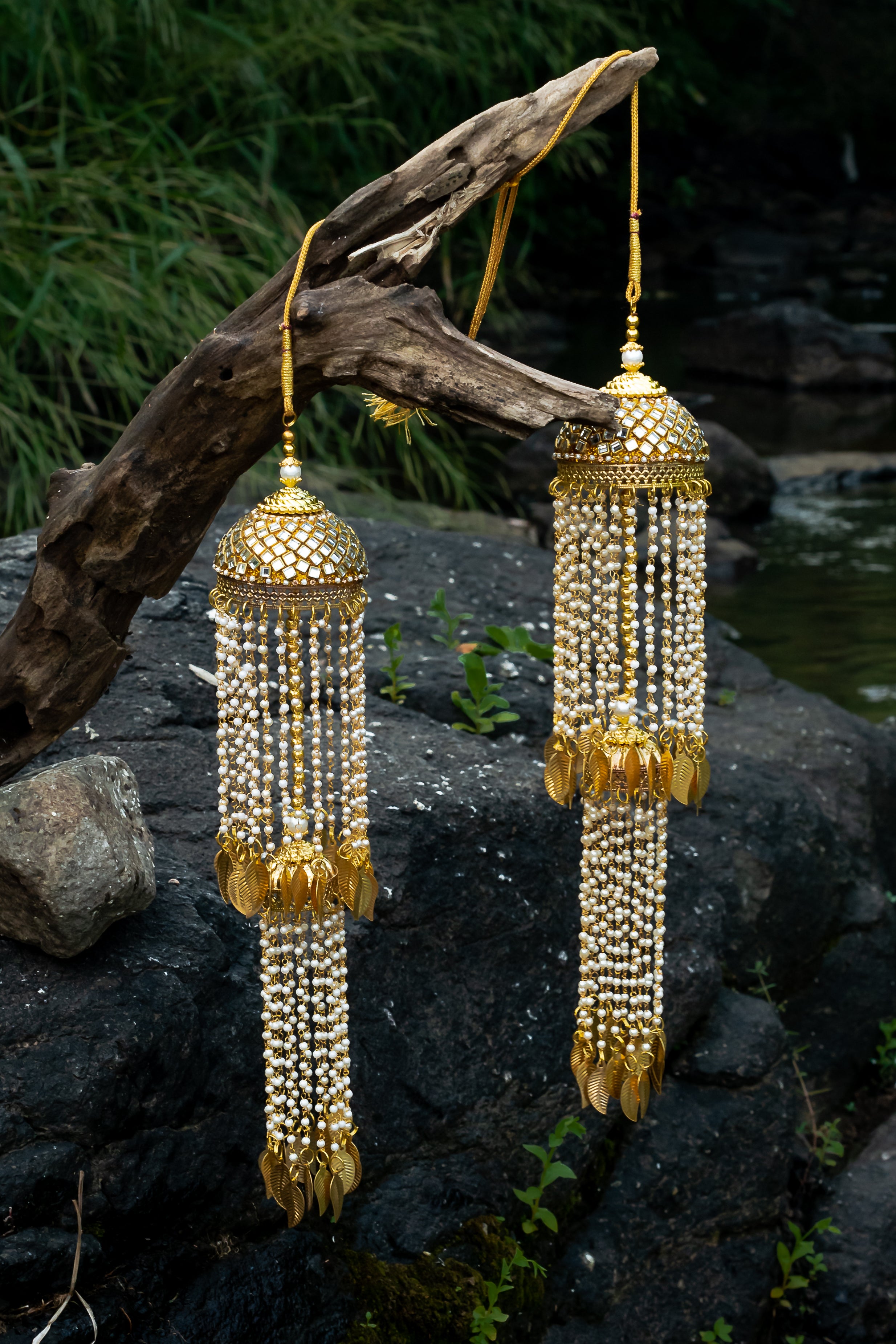 - Elegant Design: Features intricate gold-plated craftsmanship with cascading pearl strings for a luxurious bridal look.